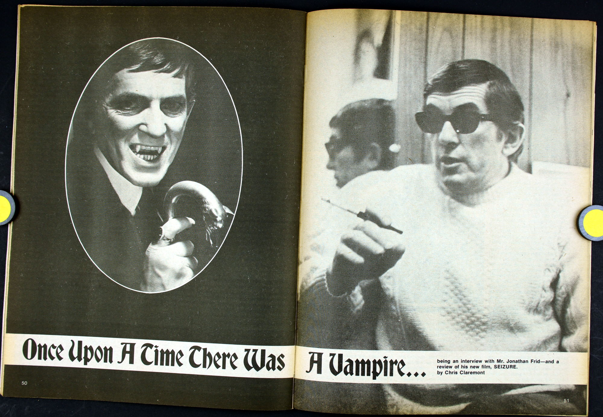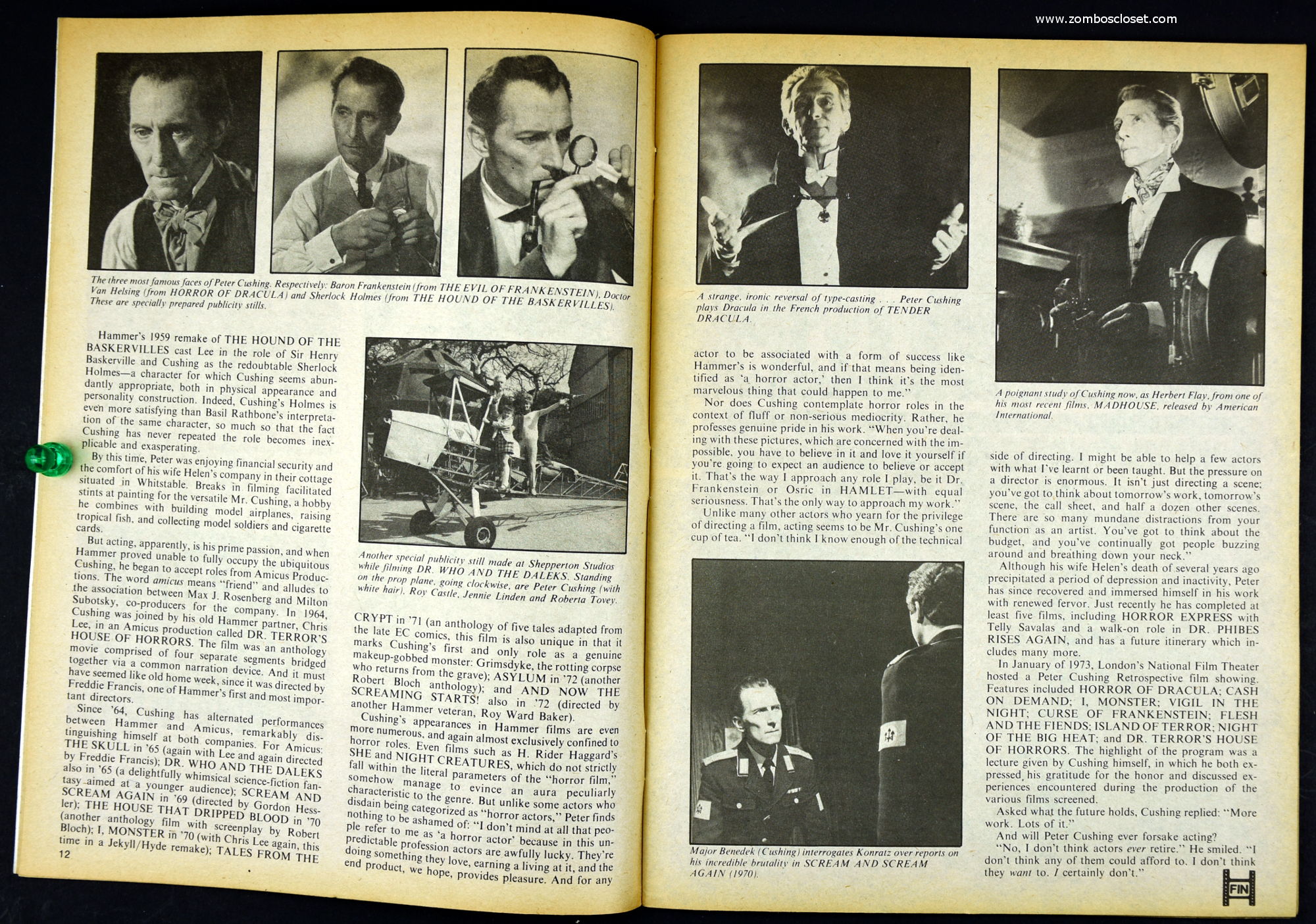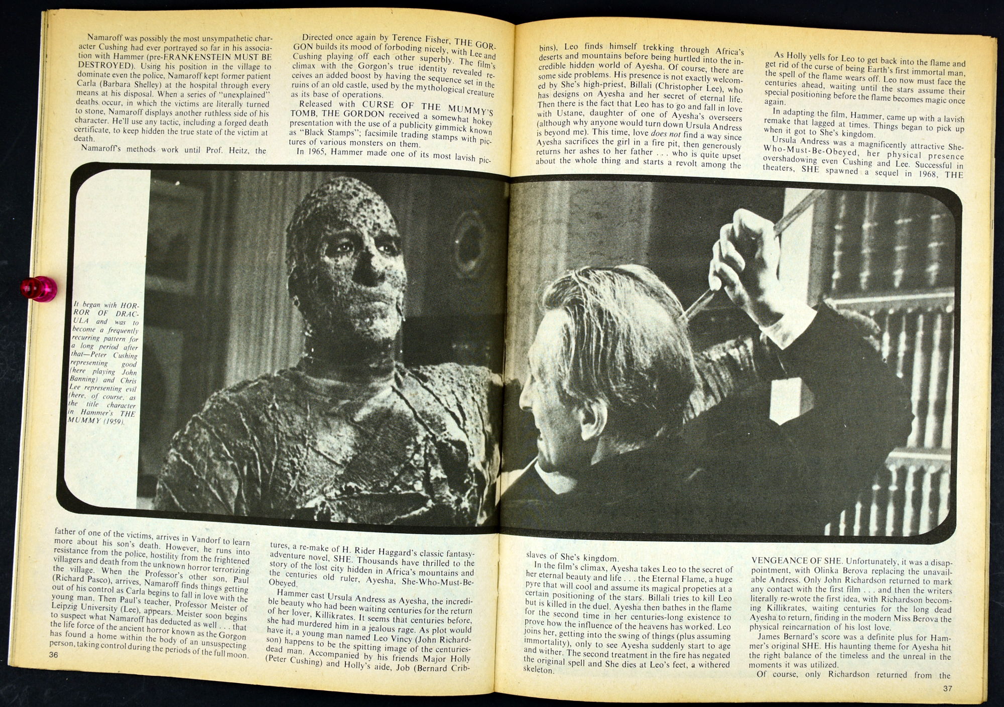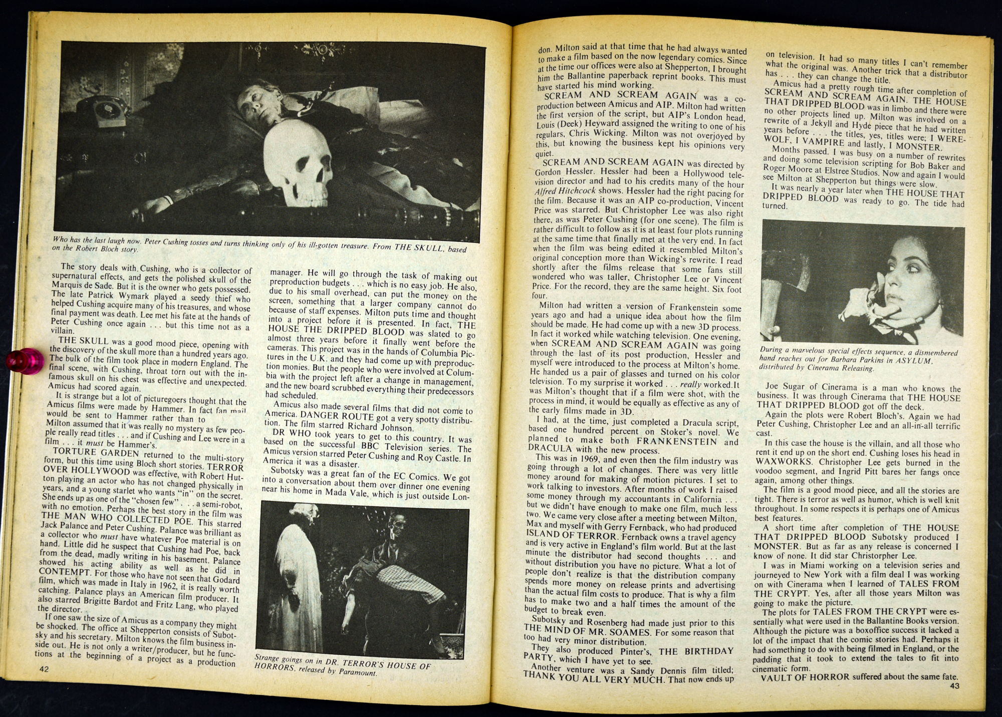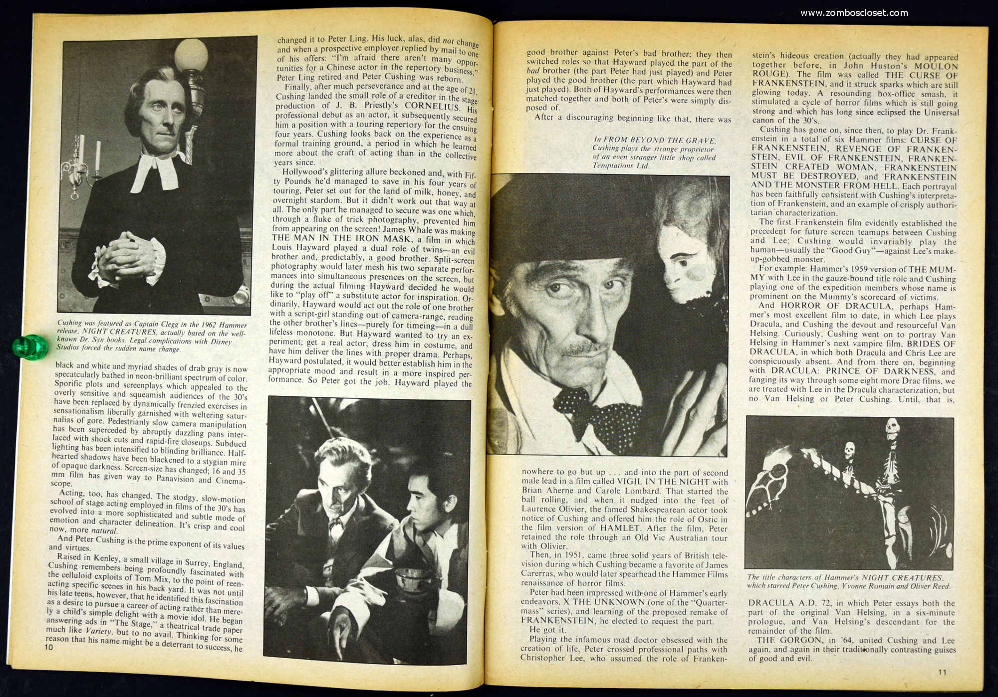Here's my slightly waterlogged copy of Monsters of the Movies issue 8. Gives it a nice monsterkid patina, don't you think? Peter Cushing, Hammer, Amicus, Jonathan Frid, and the Seven Golden Vampires light up this issue. So jump in, the water is fine.