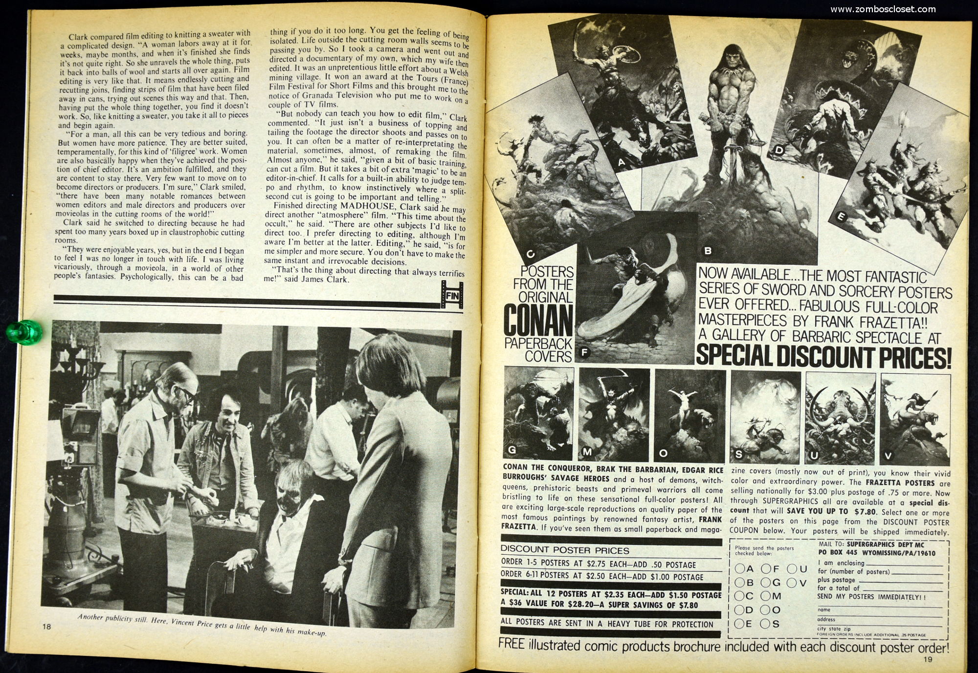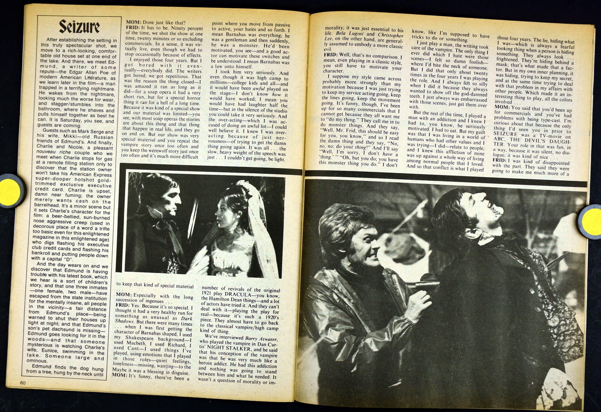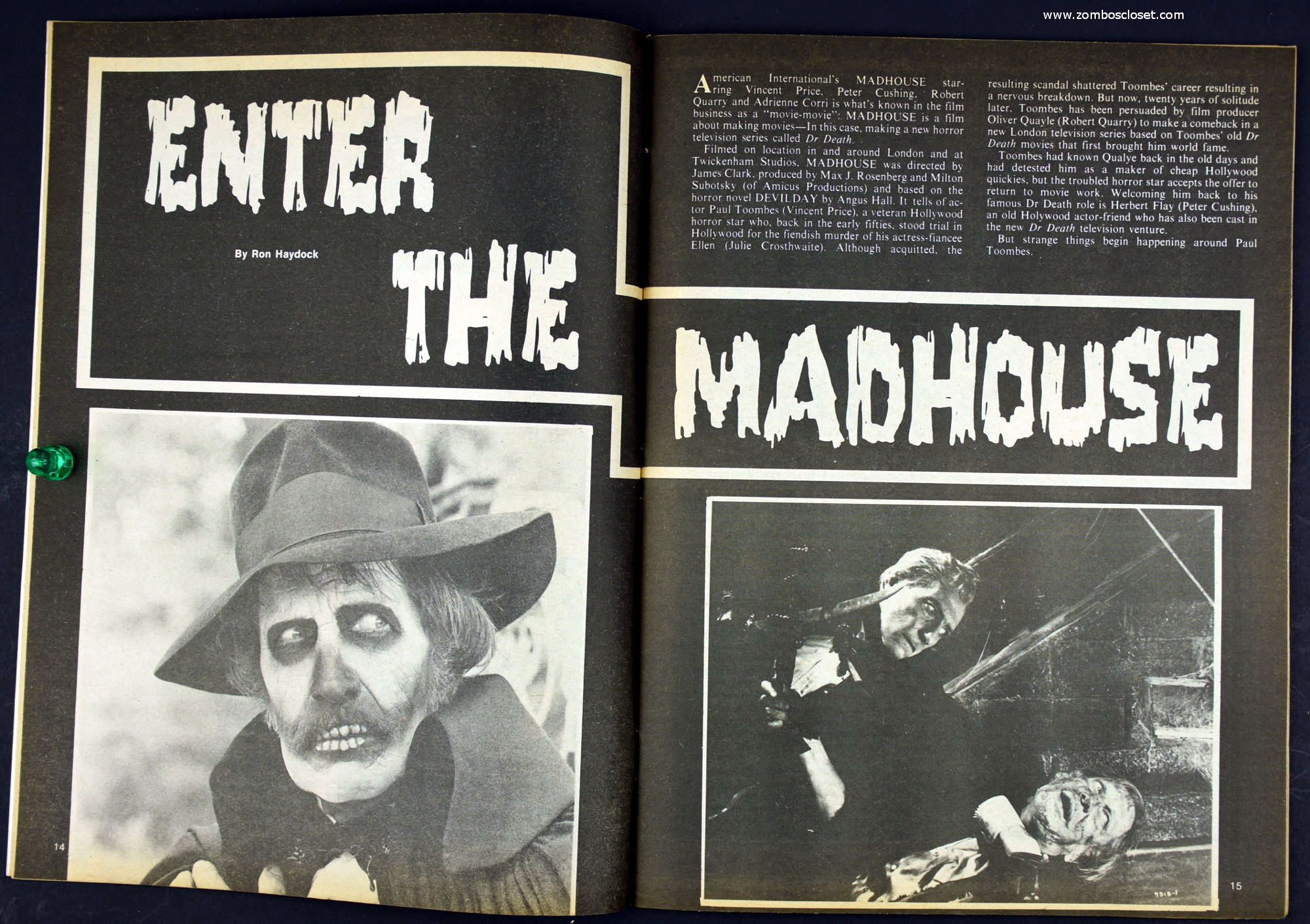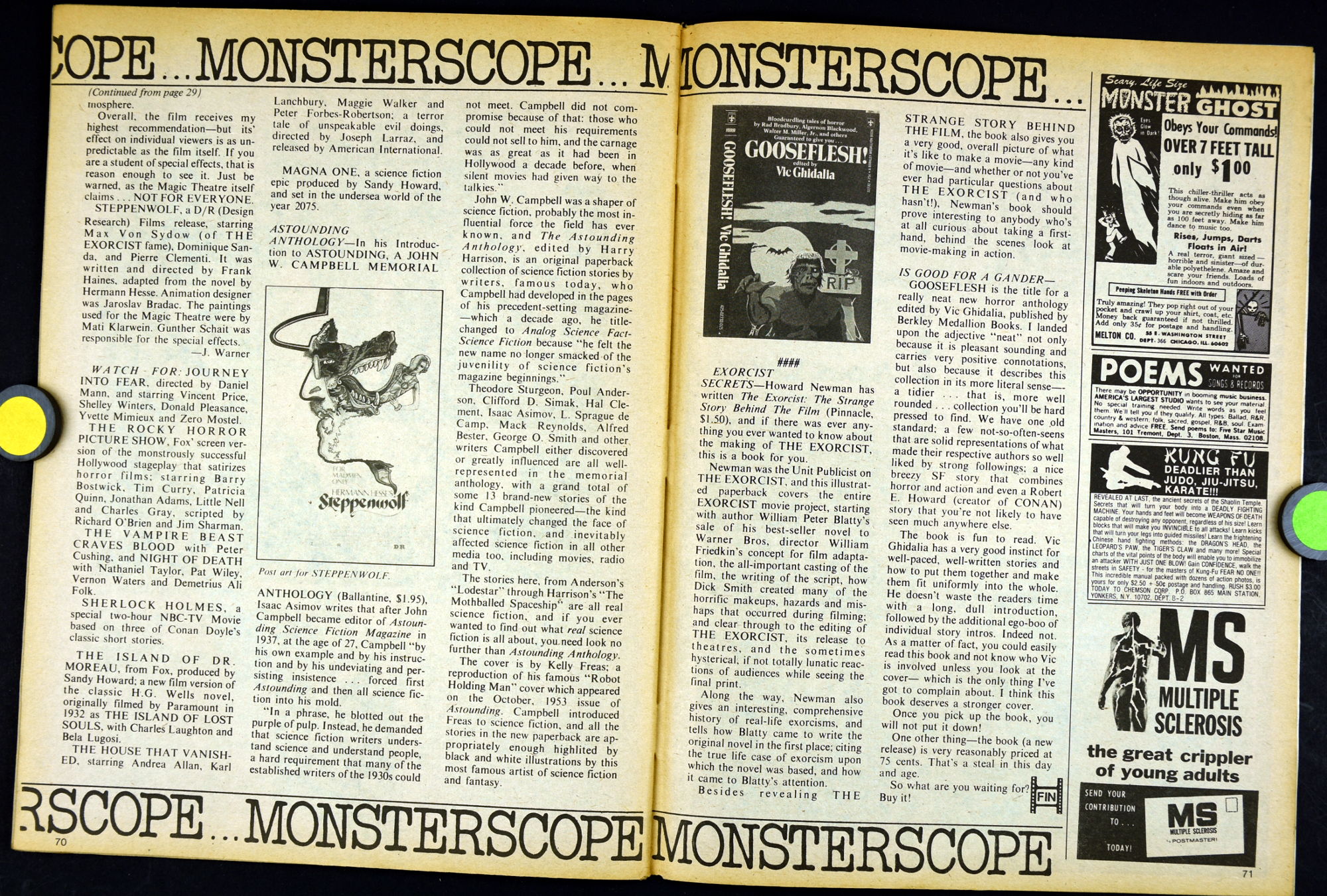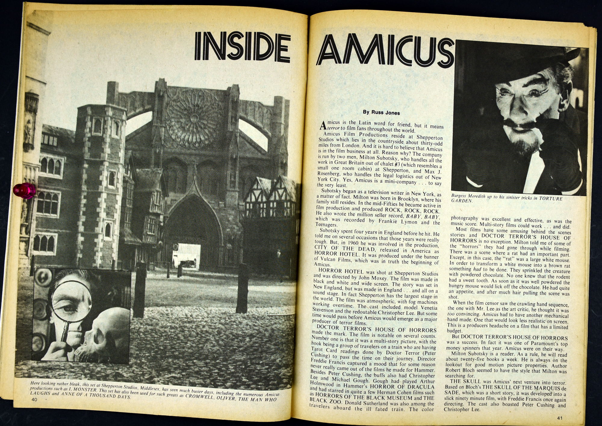 Here's my slightly waterlogged copy of Monsters of the Movies issue 8. Gives it a nice monsterkid patina, don't you think? Peter Cushing, Hammer, Amicus, Jonathan Frid, and the Seven Golden Vampires light up this issue. So jump in, the water is fine.