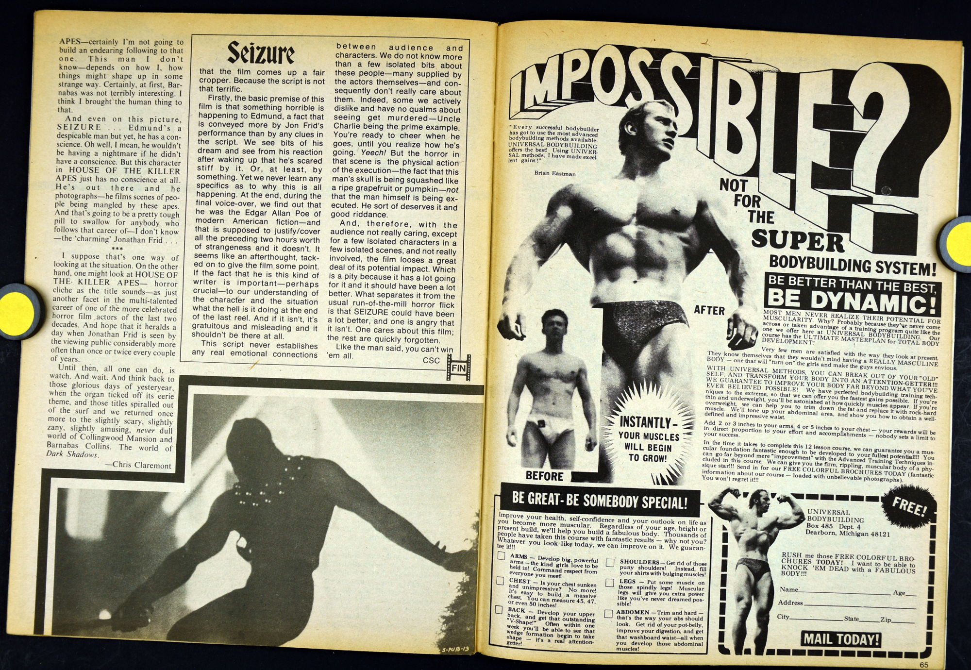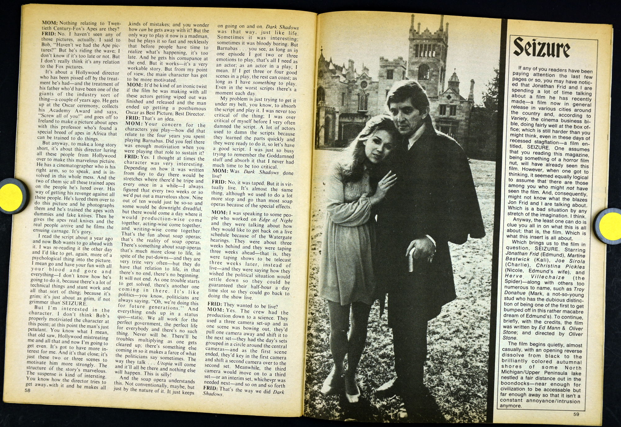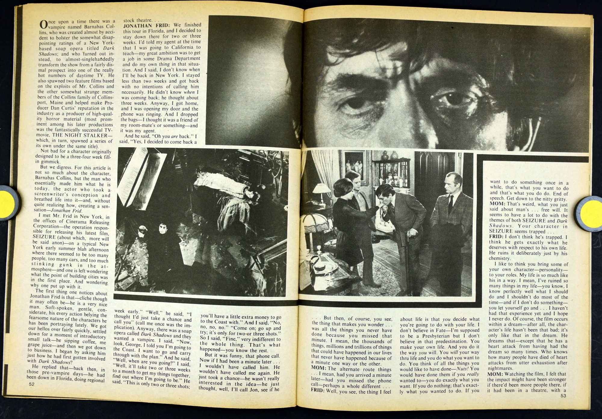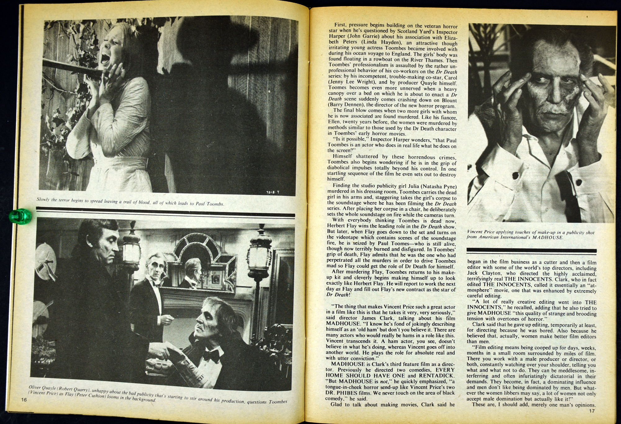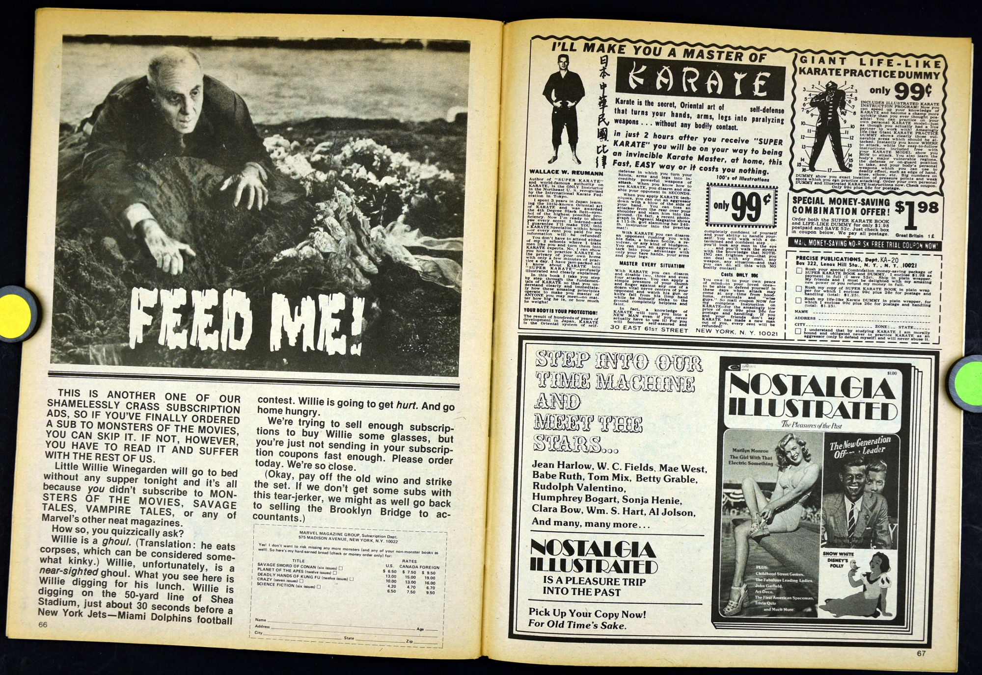 Here's my slightly waterlogged copy of Monsters of the Movies issue 8. Gives it a nice monsterkid patina, don't you think? Peter Cushing, Hammer, Amicus, Jonathan Frid, and the Seven Golden Vampires light up this issue. So jump in, the water is fine.
