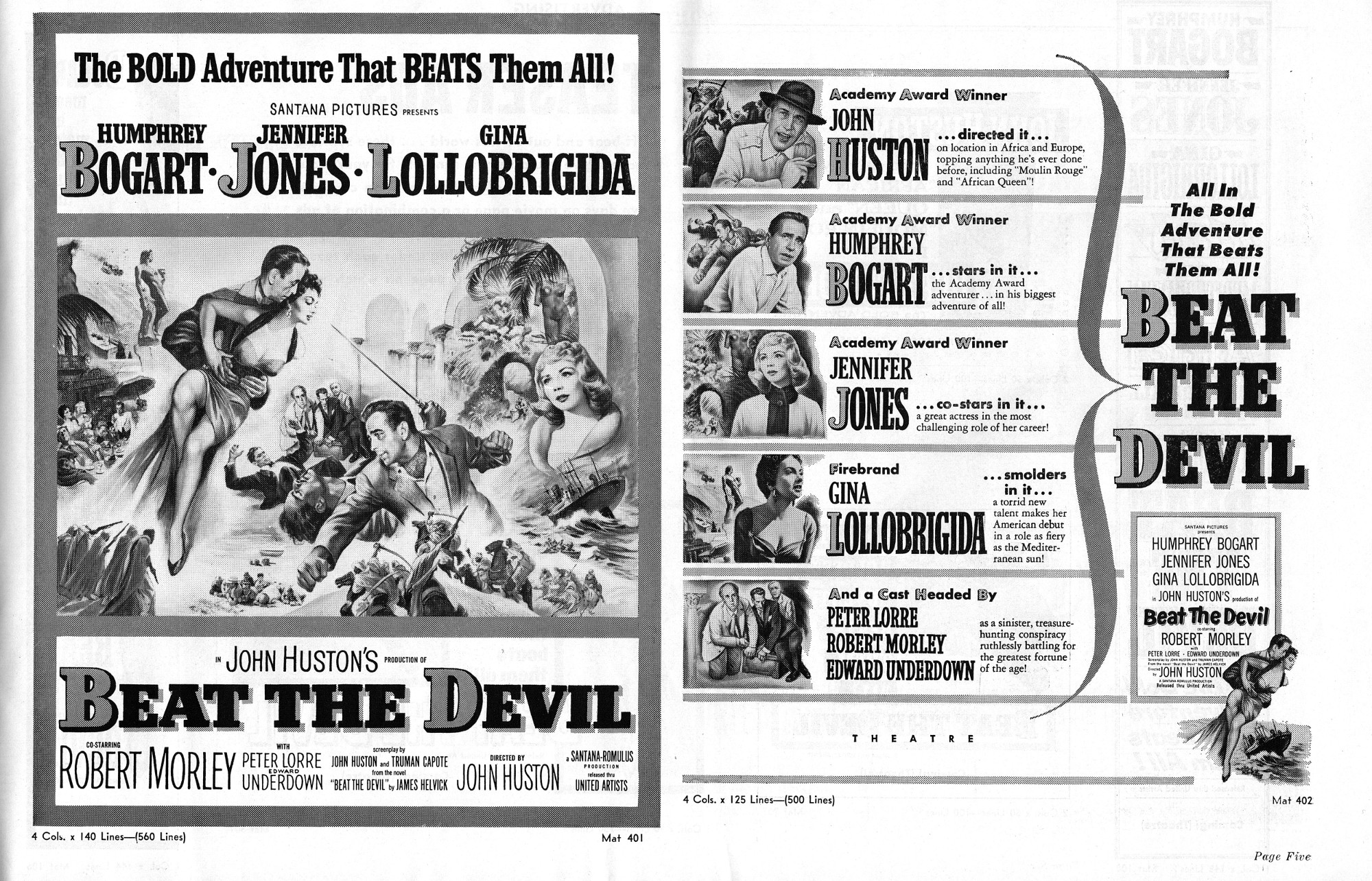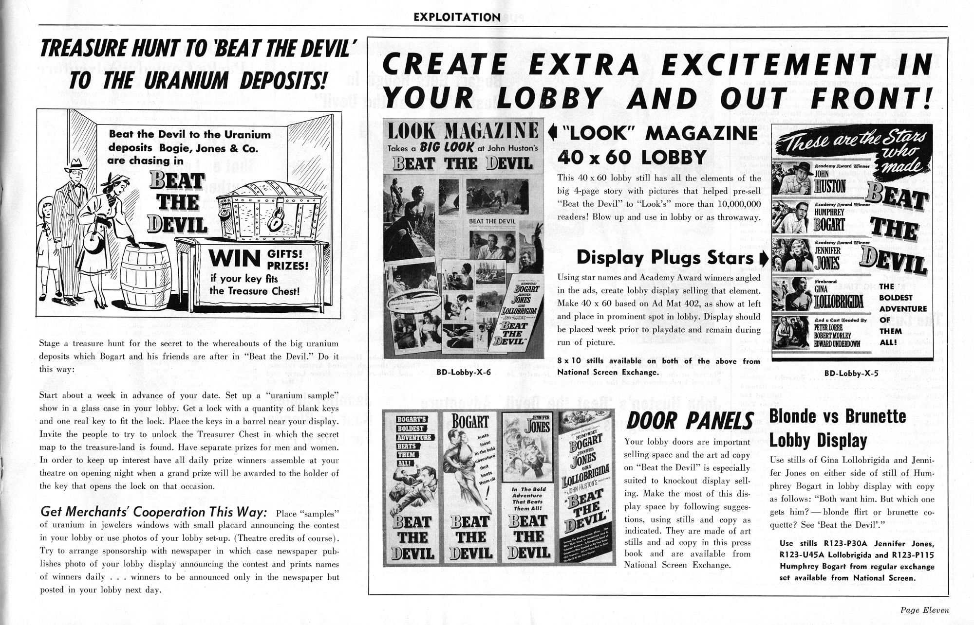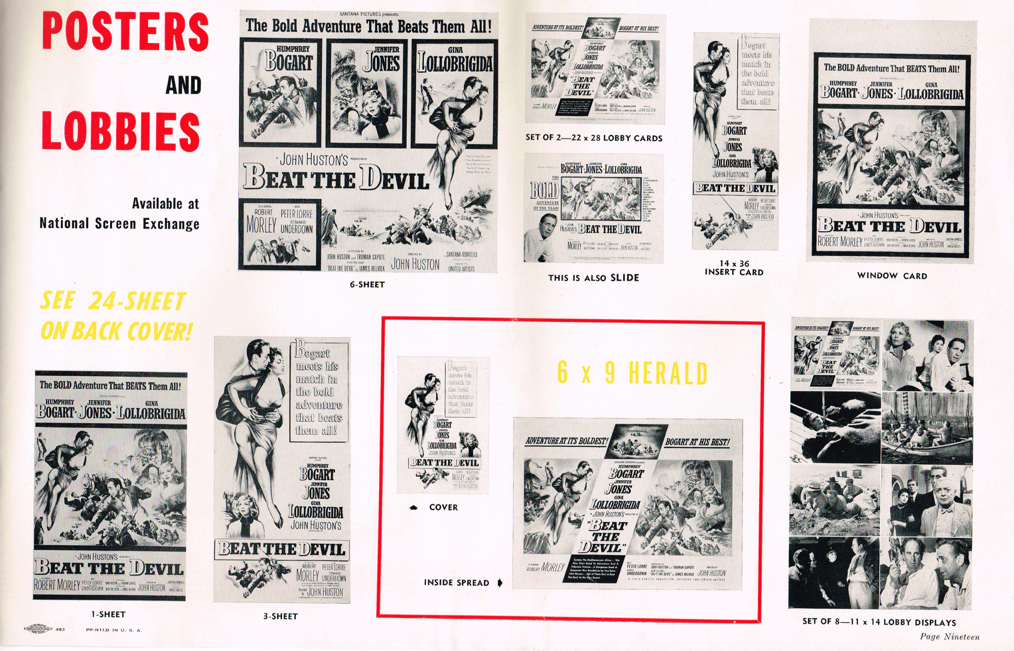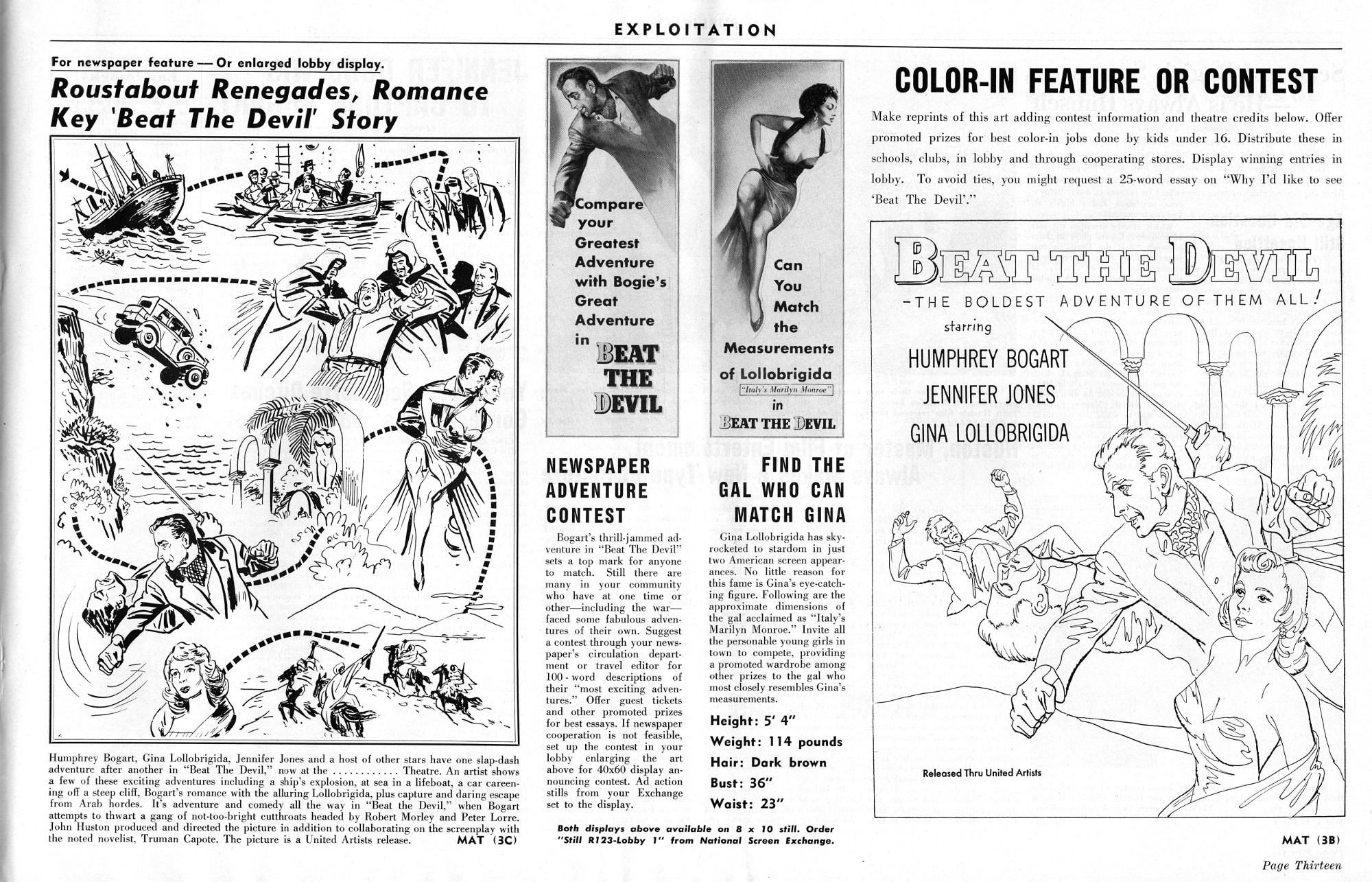 Movie Pressbook: Beat the Devil (1953) Leave a Comment / Pressbooks (Non-Horror) / By JM Cozzoli Twenty pages, 11 x 17 inches; impressive movie pressbook with a lot of publicity and exploitation, as well as poster art, to sell the movie to theaters and their audiences. Like this:Like Loading... Share this post Facebook Twitter Pinterest Linkedin