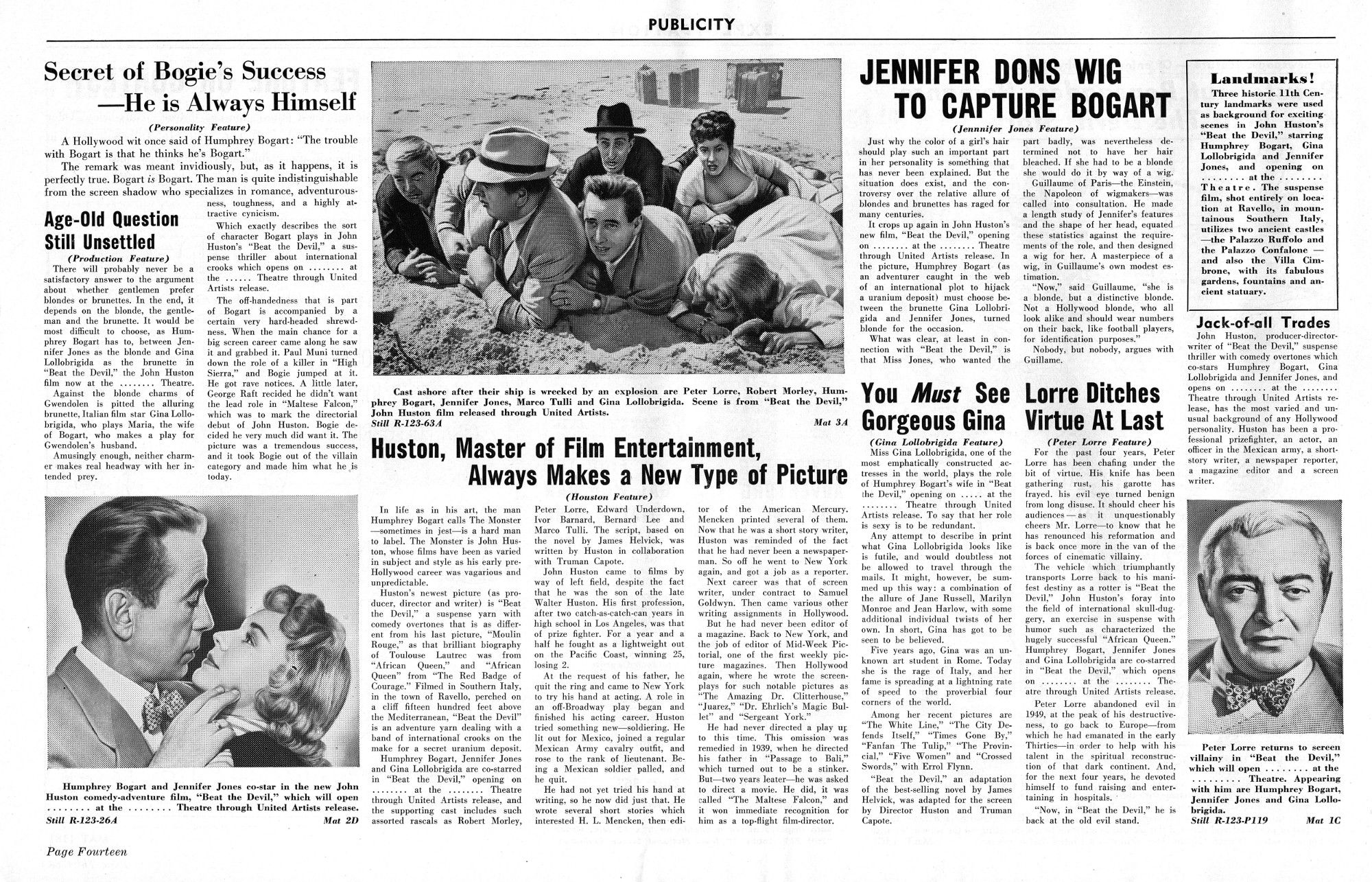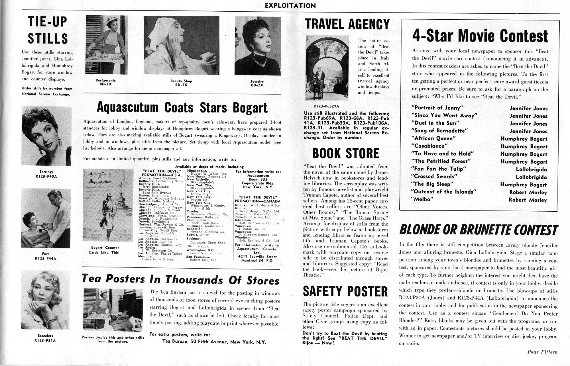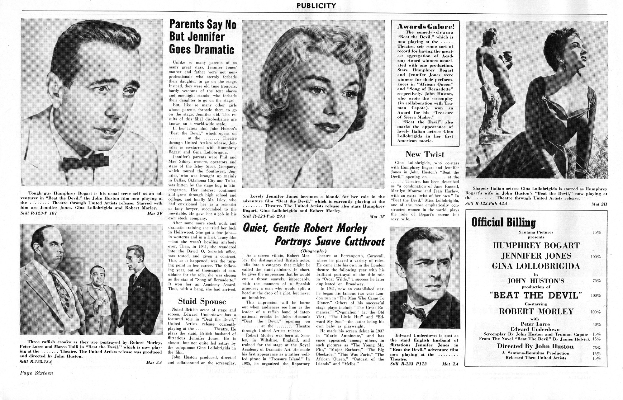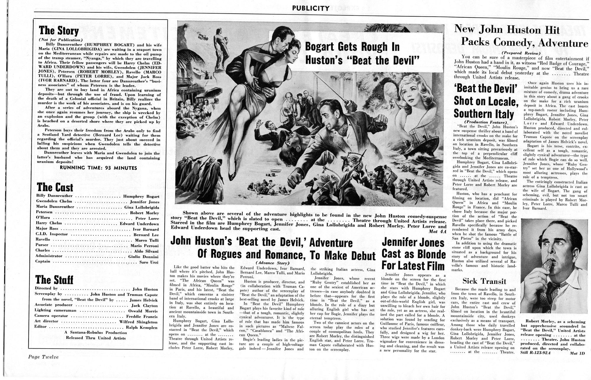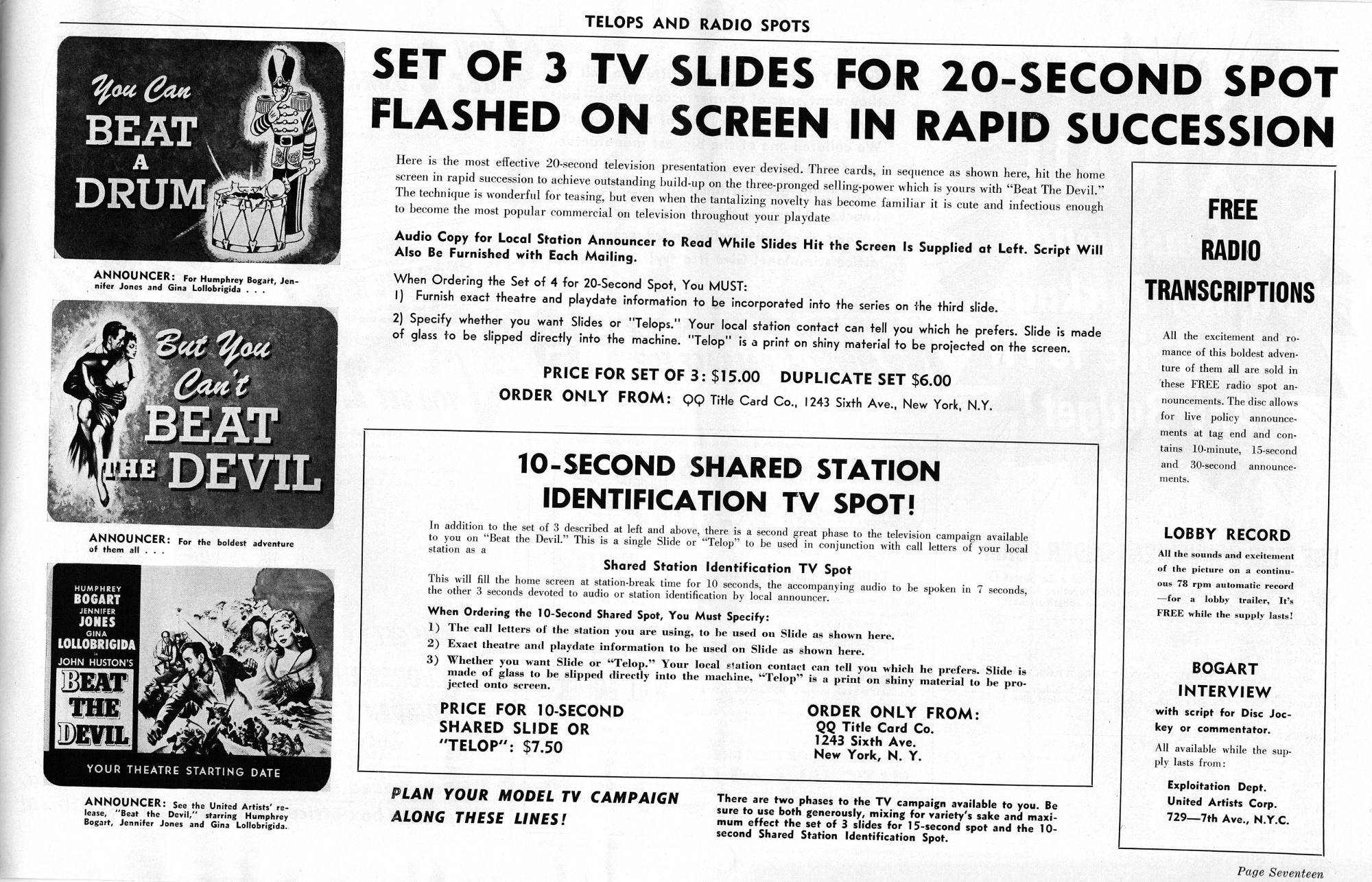 Movie Pressbook: Beat the Devil (1953) Leave a Comment / Pressbooks (Non-Horror) / By JM Cozzoli Twenty pages, 11 x 17 inches; impressive movie pressbook with a lot of publicity and exploitation, as well as poster art, to sell the movie to theaters and their audiences. Like this:Like Loading... Share this post Facebook Twitter Pinterest Linkedin