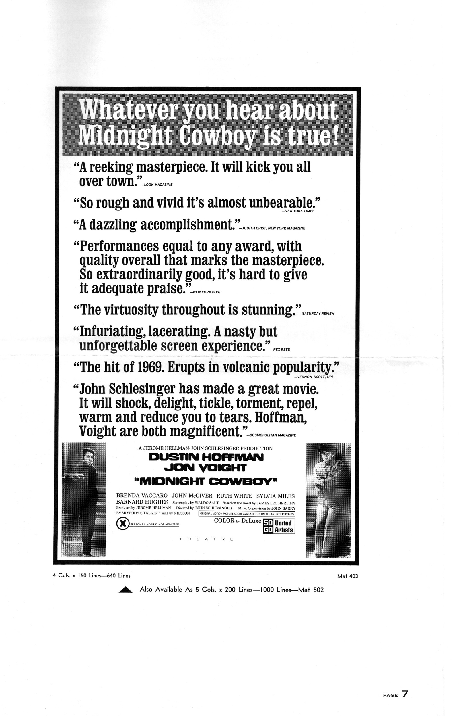 Movie Pressbook: Midnight Cowboy (1969) Leave a Comment / Pressbooks (Non-Horror) / By JM Cozzoli A terrifying movie. Dustin Hoffman's Ratso Rizzo is astounding. Like this:Like Loading... Share this post Facebook Twitter Pinterest Linkedin