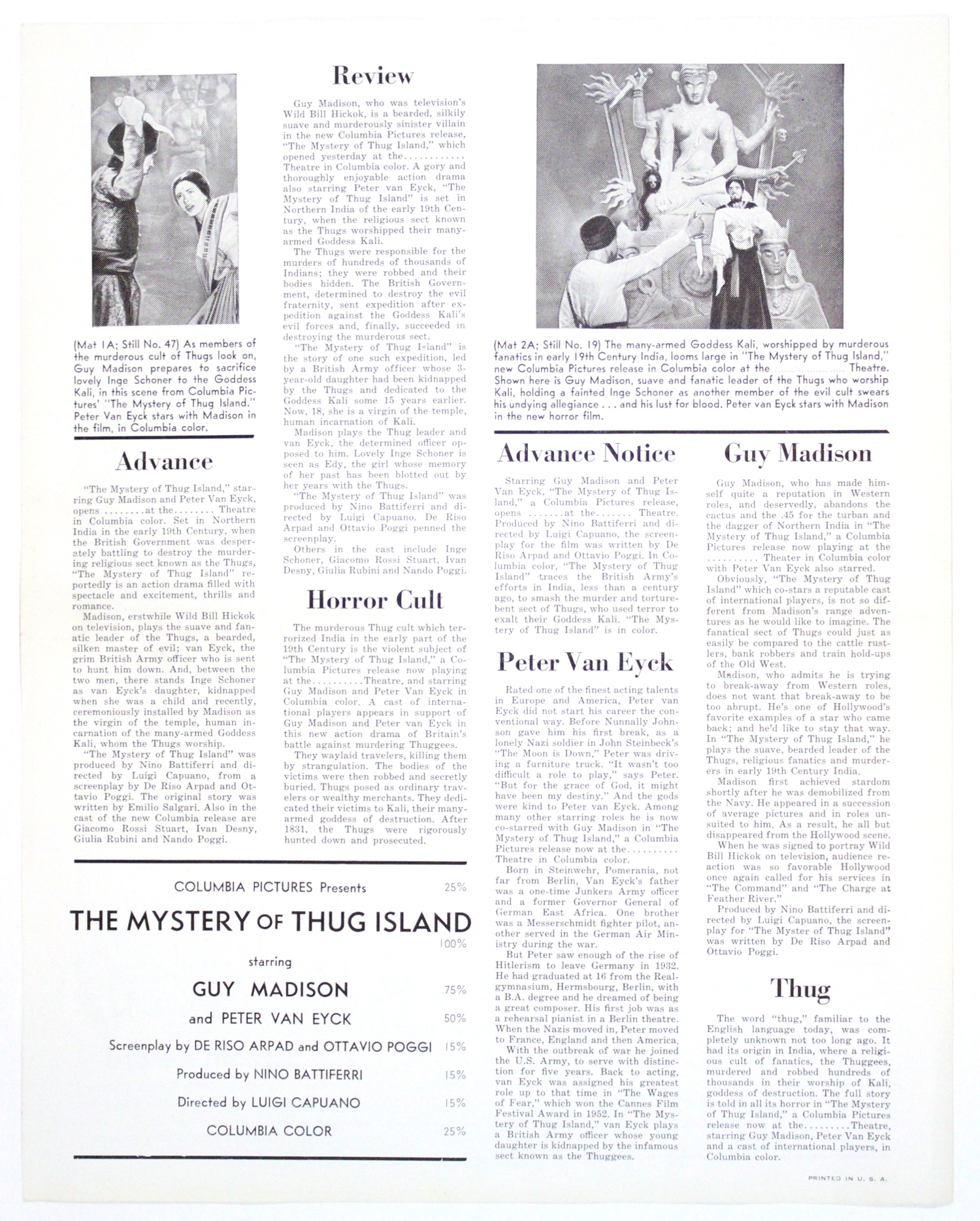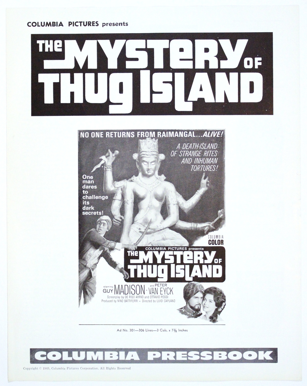 Movie Pressbook: Mystery of Thug Island (1964) Leave a Comment / Pressbooks (Non-Horror) / By JM Cozzoli This Italian language B-movie, also known as Kidnapped to Mystery Island, stars Guy Madison and Peter van Eyck. I'd see it if they did the coffee exploit, for sure. Like this:Like Loading... Share this post Facebook Twitter Pinterest Linkedin