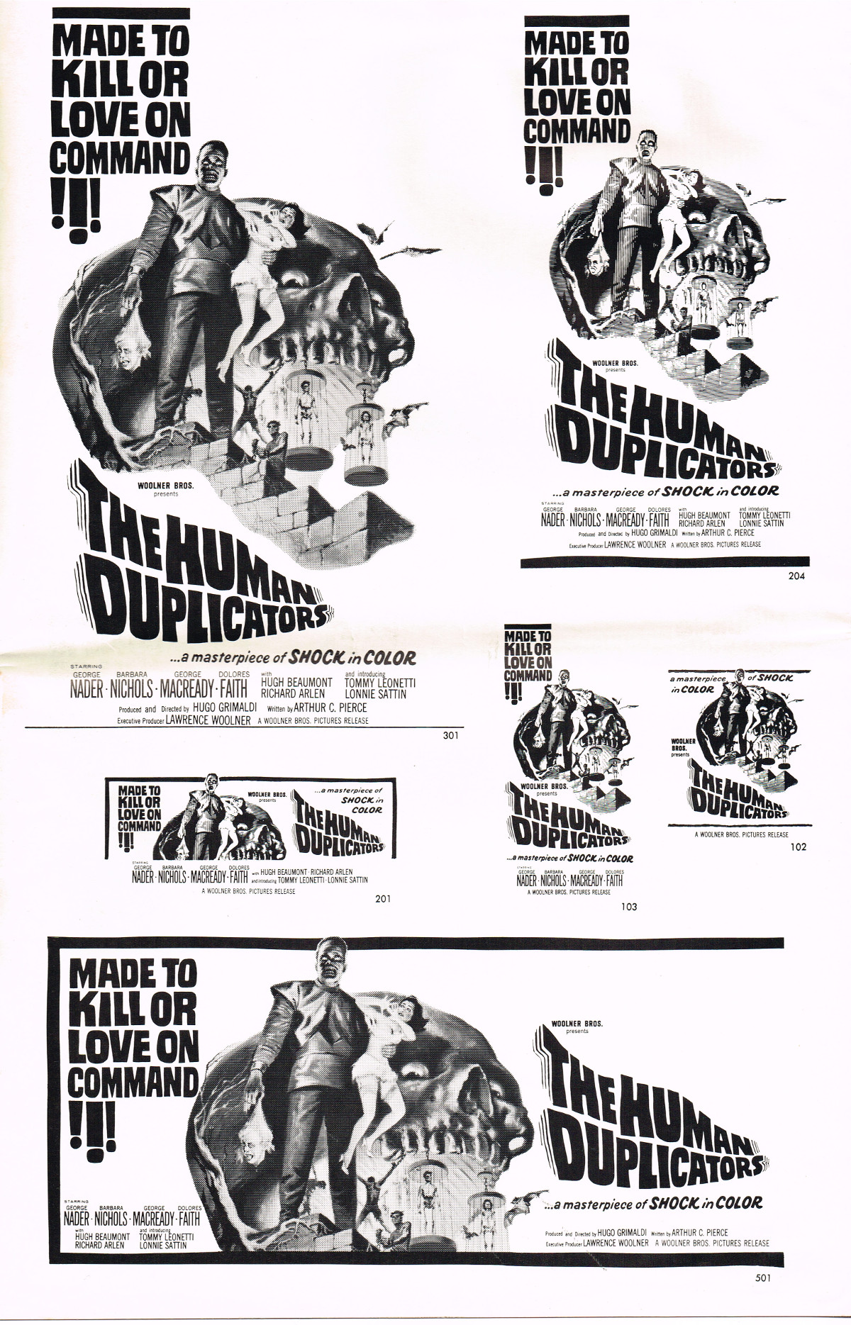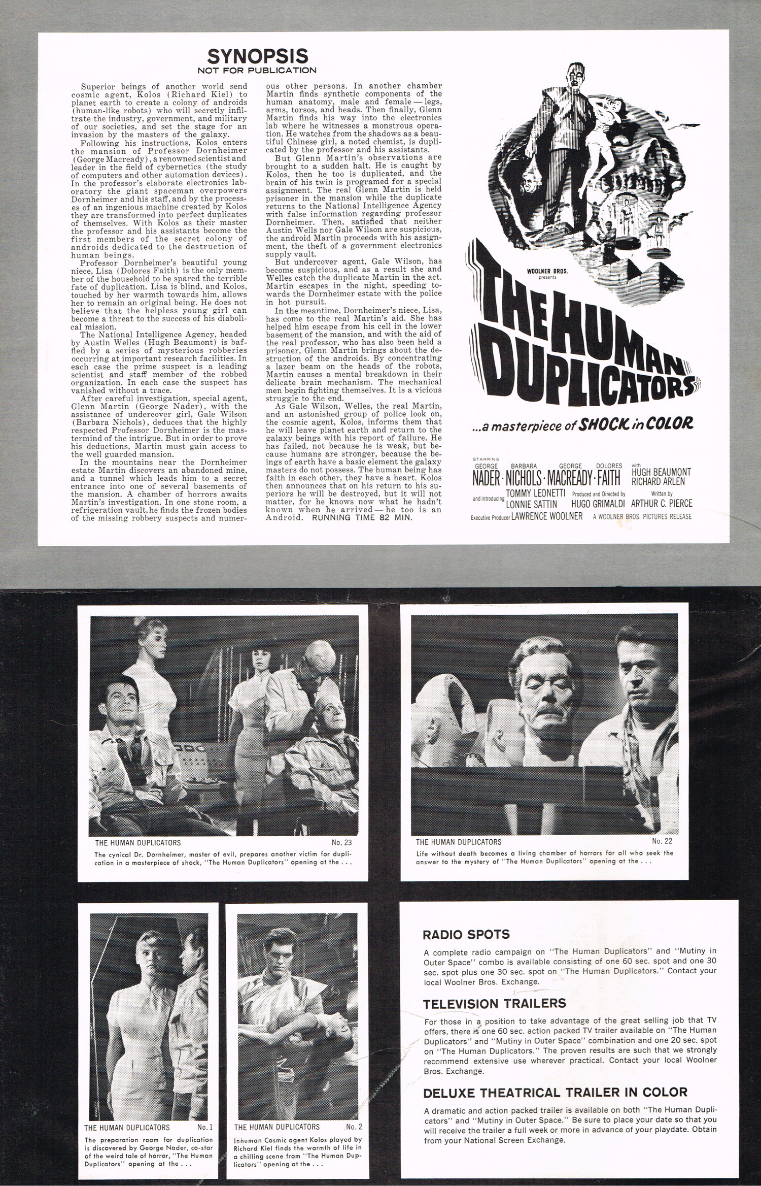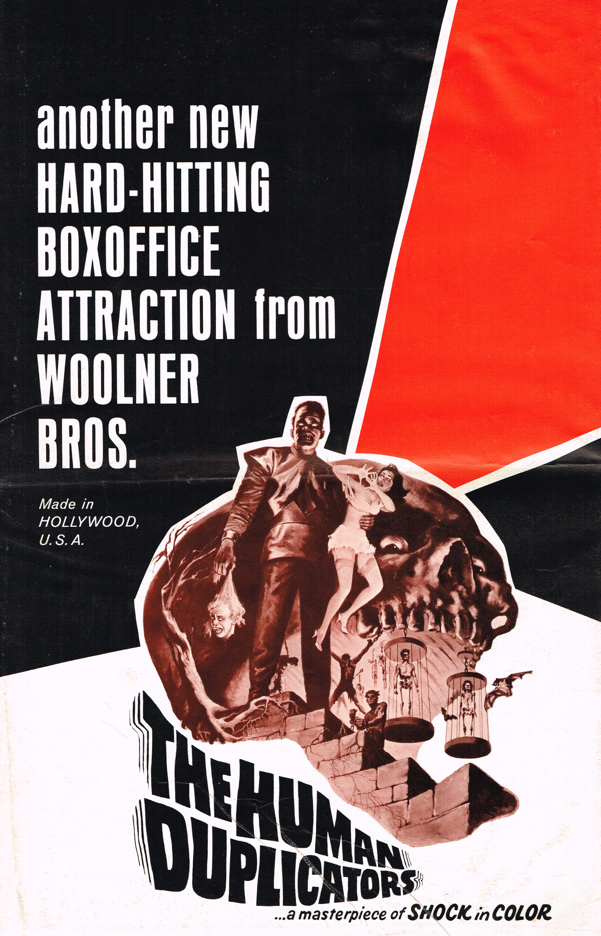 Movie Pressbook: The Human Duplicators (1965) Leave a Comment / Pressbooks (Horror, Sci Fi, Fantasy) / By JM Cozzoli Not much publicity given in this double-bill pressbook for The Human Duplicators. The poster imagery is attention-getting, but that's about it. My guess is that's where most of this movie's budget went.Like this:Like Loading... Share this post Facebook Twitter Pinterest Linkedin