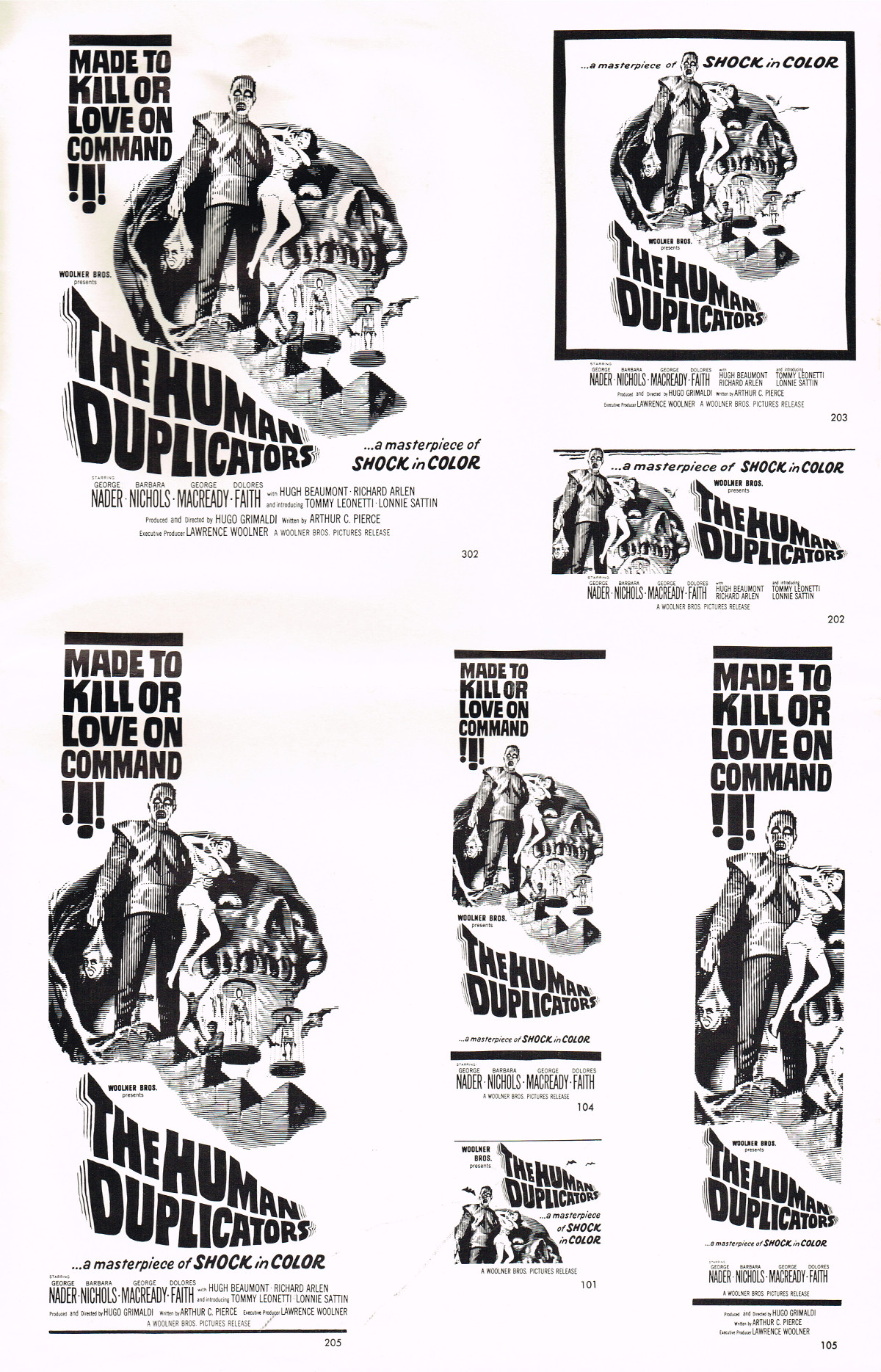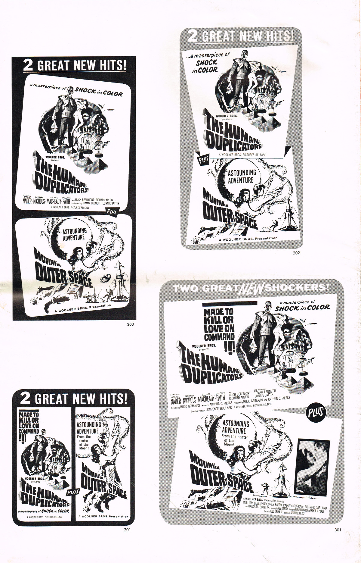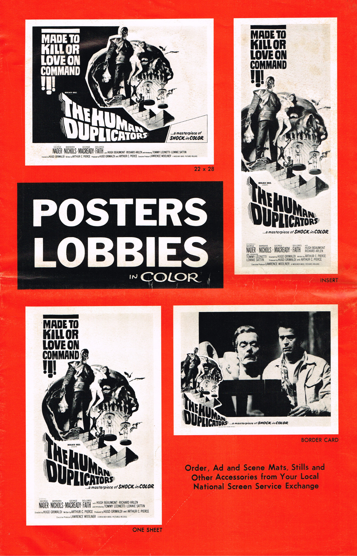 Movie Pressbook: The Human Duplicators (1965) Leave a Comment / Pressbooks (Horror, Sci Fi, Fantasy) / By JM Cozzoli Not much publicity given in this double-bill pressbook for The Human Duplicators. The poster imagery is attention-getting, but that's about it. My guess is that's where most of this movie's budget went.Like this:Like Loading... Share this post Facebook Twitter Pinterest Linkedin