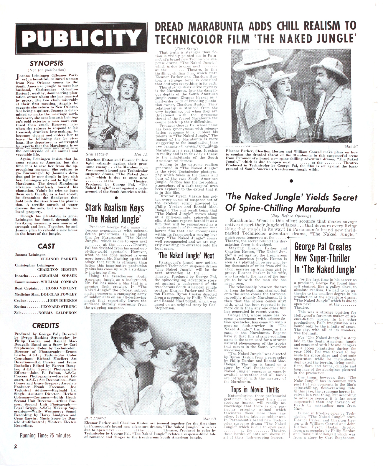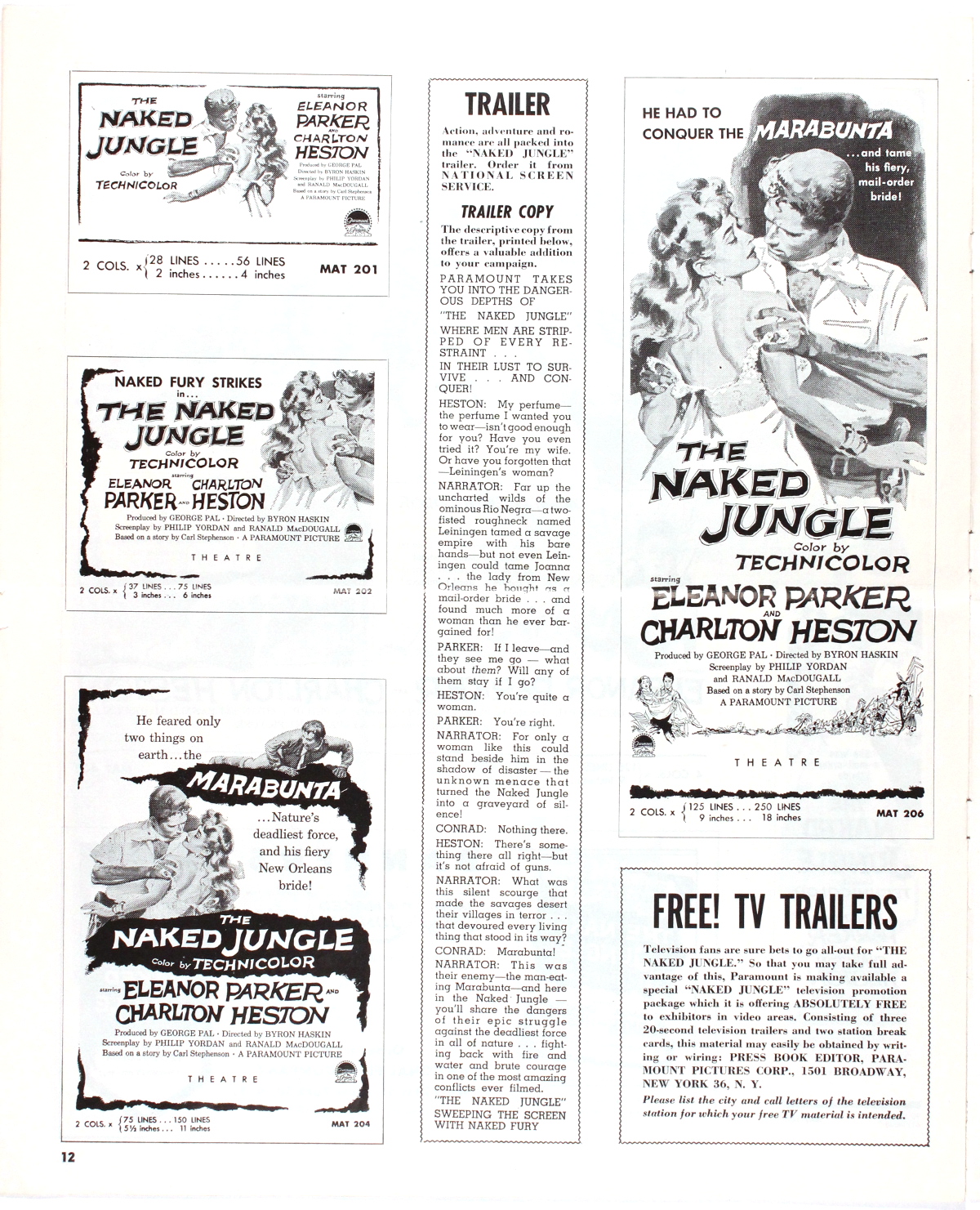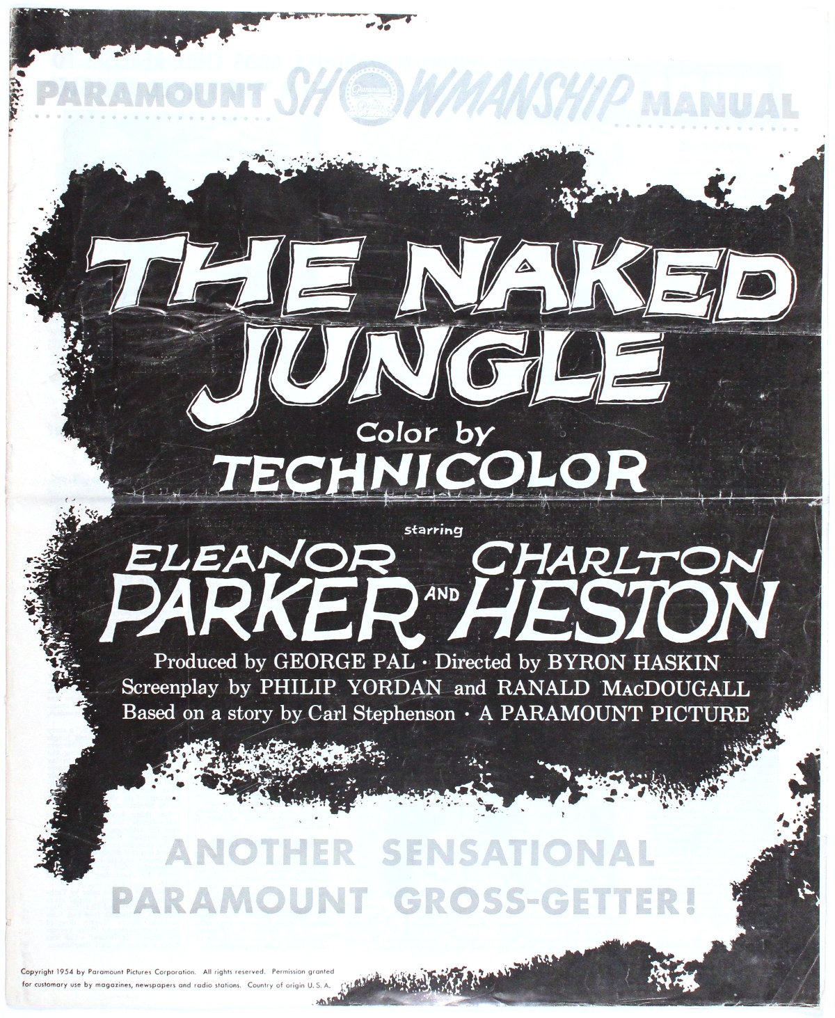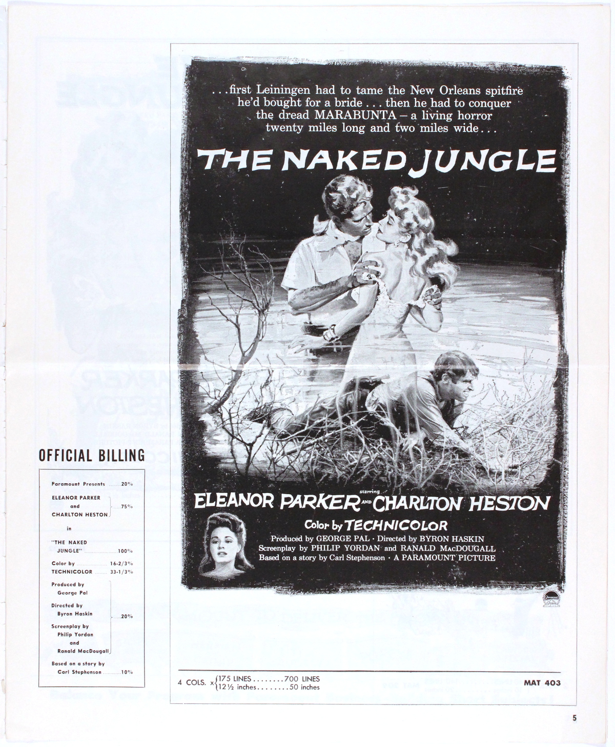Romance and killer ants, produced by George Pal (who I'm still miffed at for his godawful Doc Savage: The Man of Bronze movie). Looks like the ants got to this pressbook, too. One photo is missing from pages 3 and 4, and pages 13 and 14 appear to have been devoured entirely.