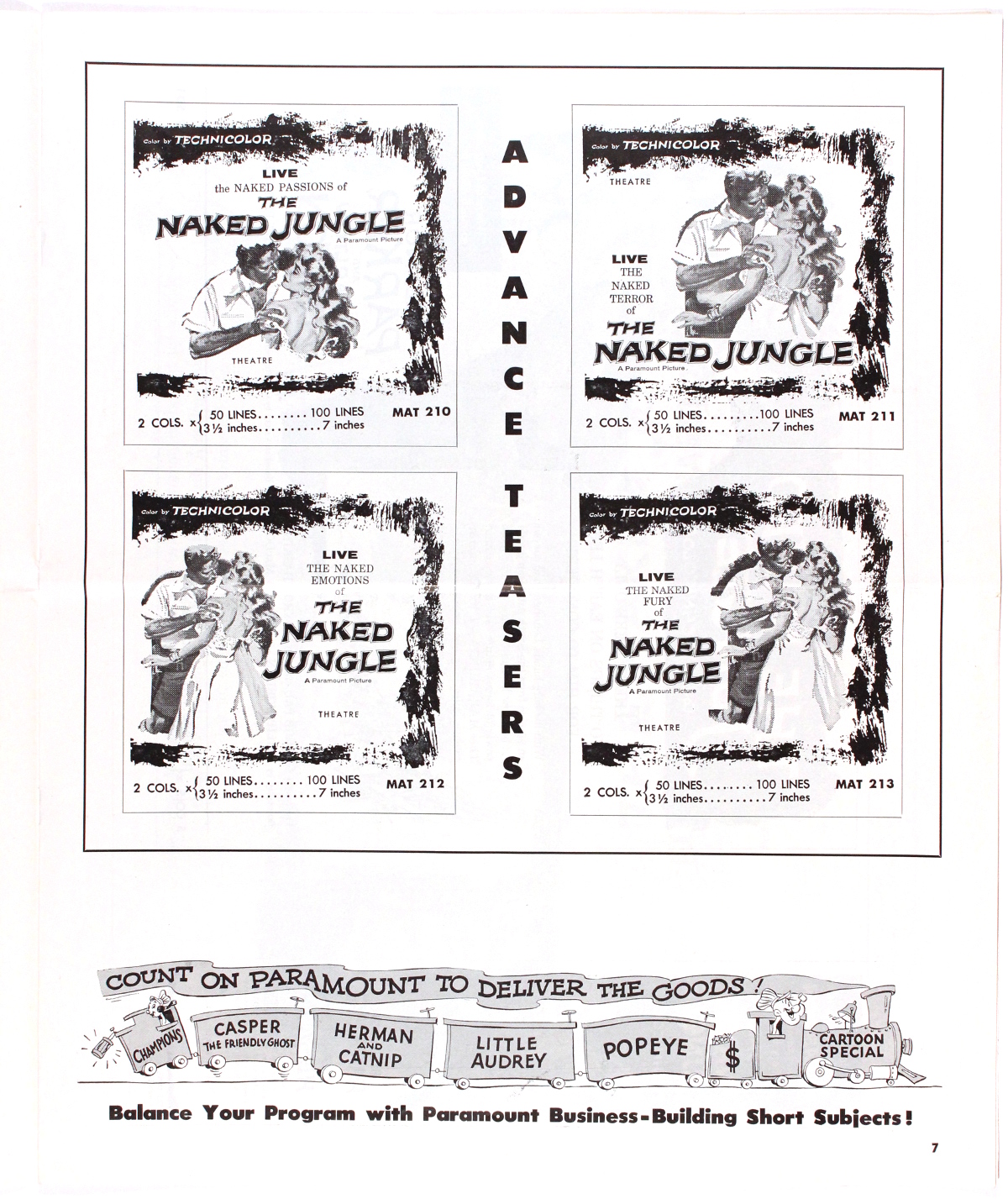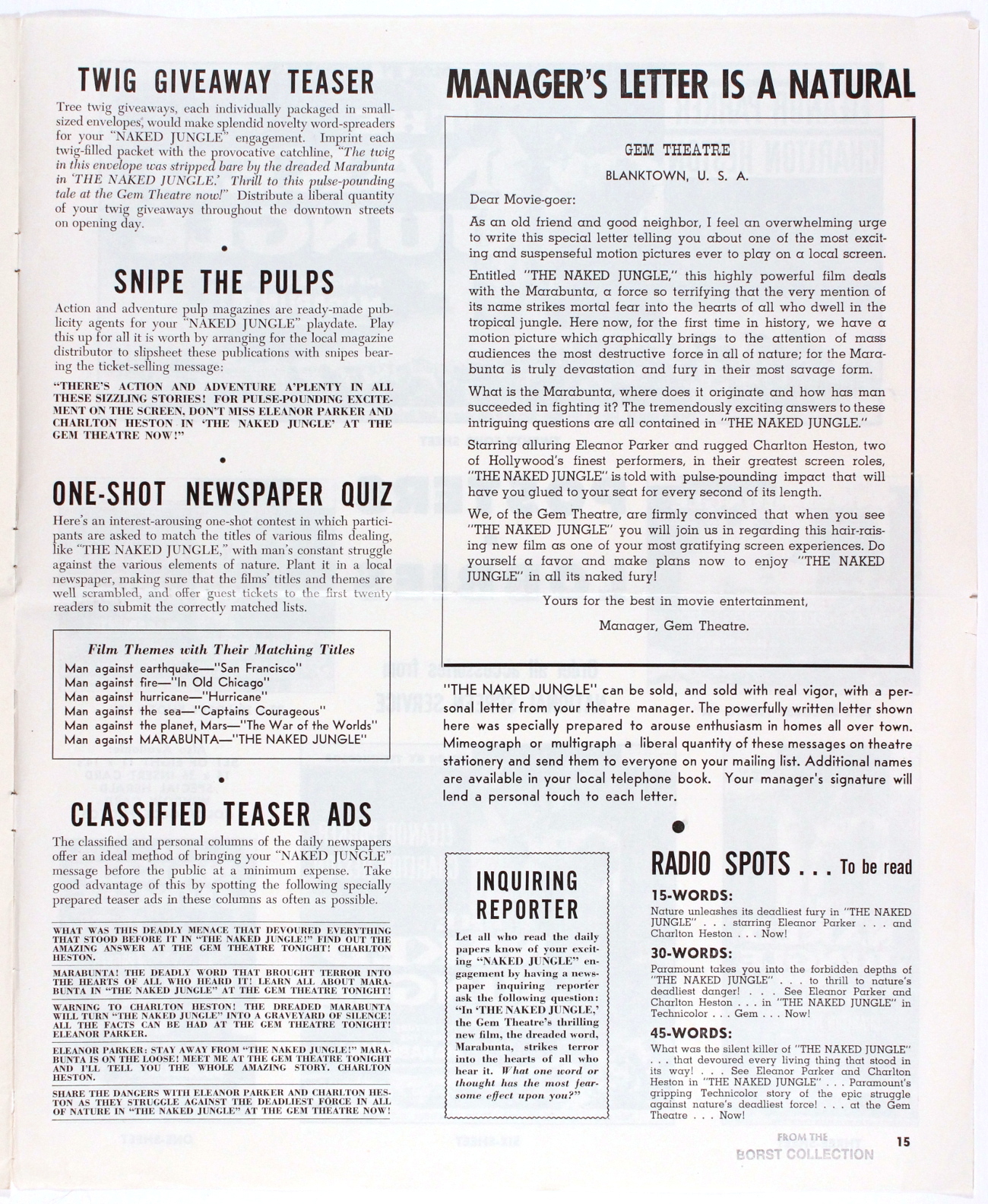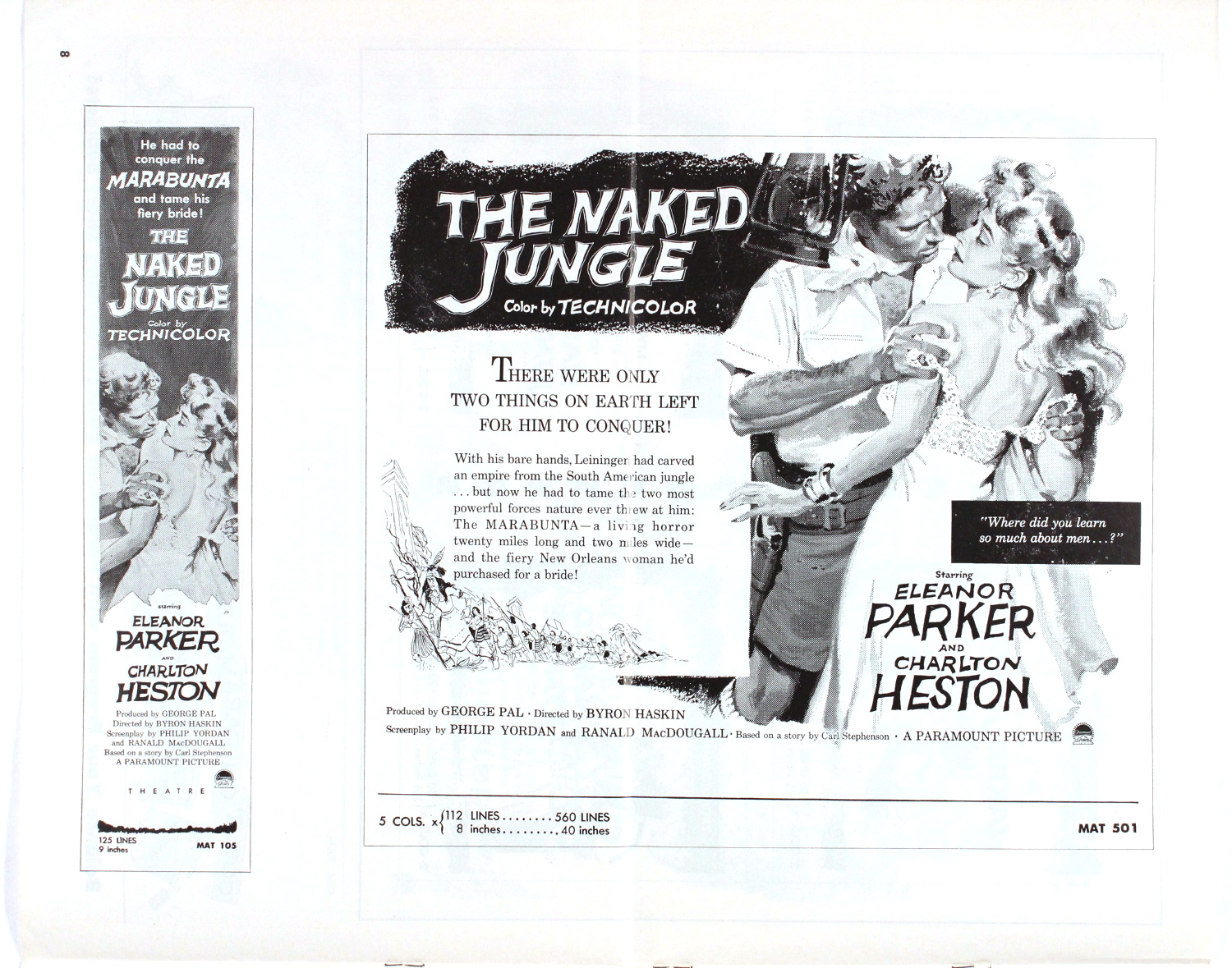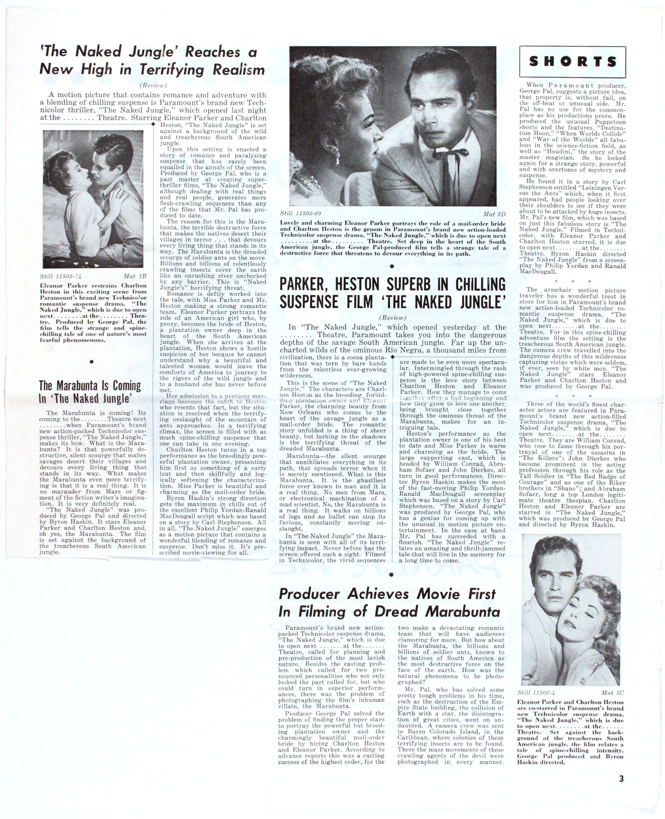 Romance and killer ants, produced by George Pal (who I'm still miffed at for his godawful Doc Savage: The Man of Bronze movie). Looks like the ants got to this pressbook, too. One photo is missing from pages 3 and 4, and pages 13 and 14 appear to have been devoured entirely.