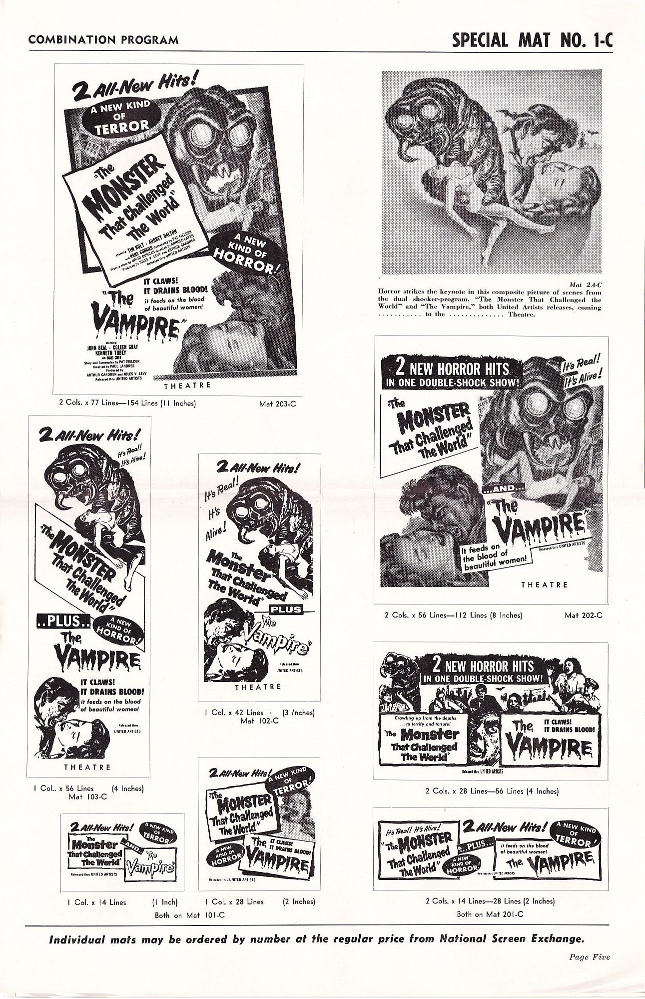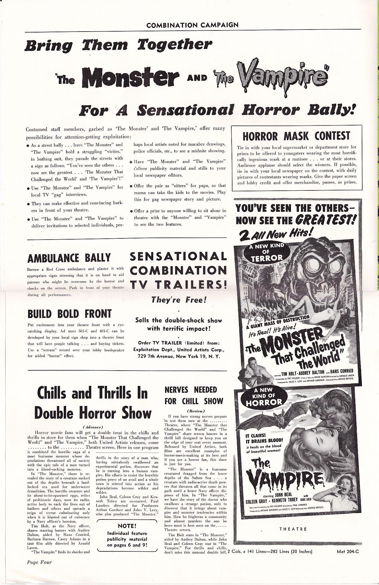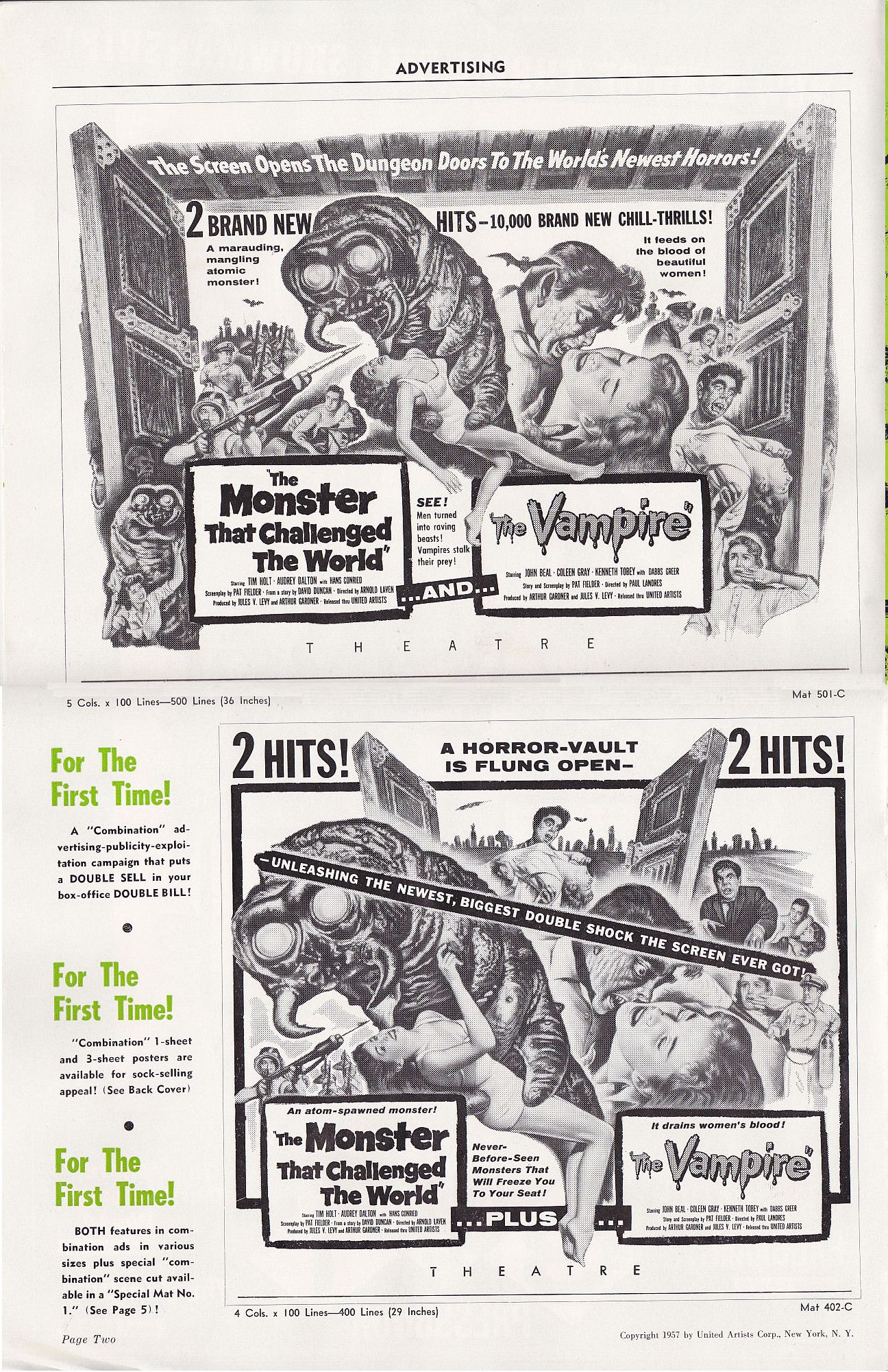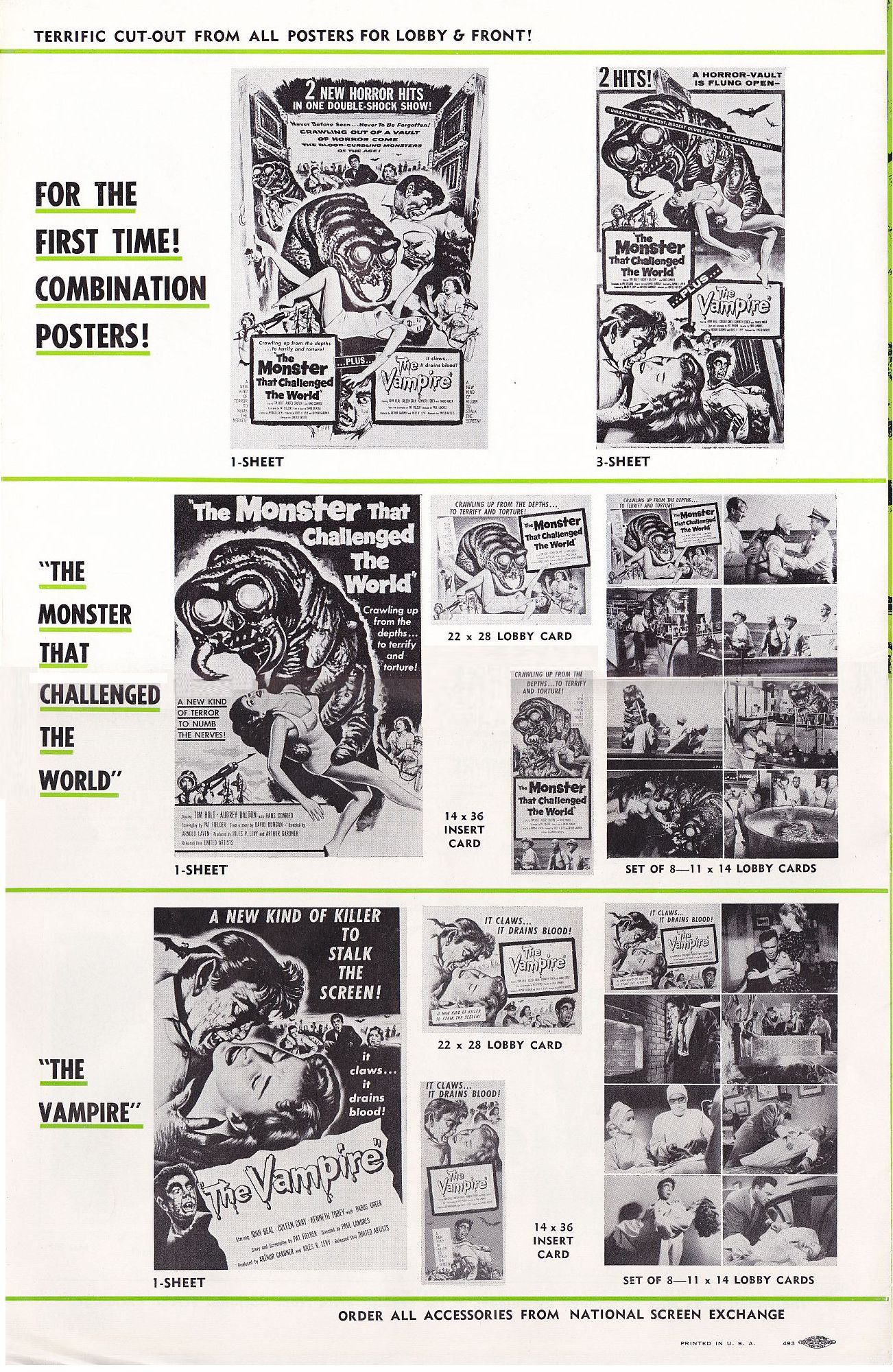 Tony Rivers strikes again, providing us with these movie pressbook scans for the thrill-bill double bill of The Monster that Challenged the World and The Vampire. (I particularly enjoy the exploitation ideas for both movies.)