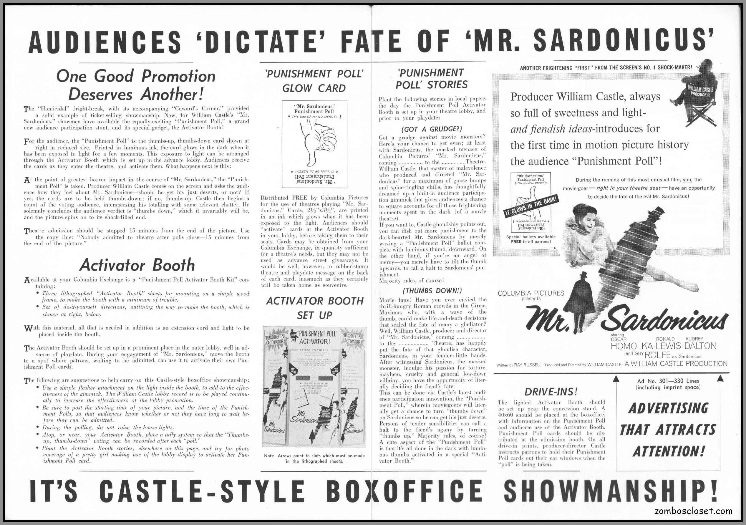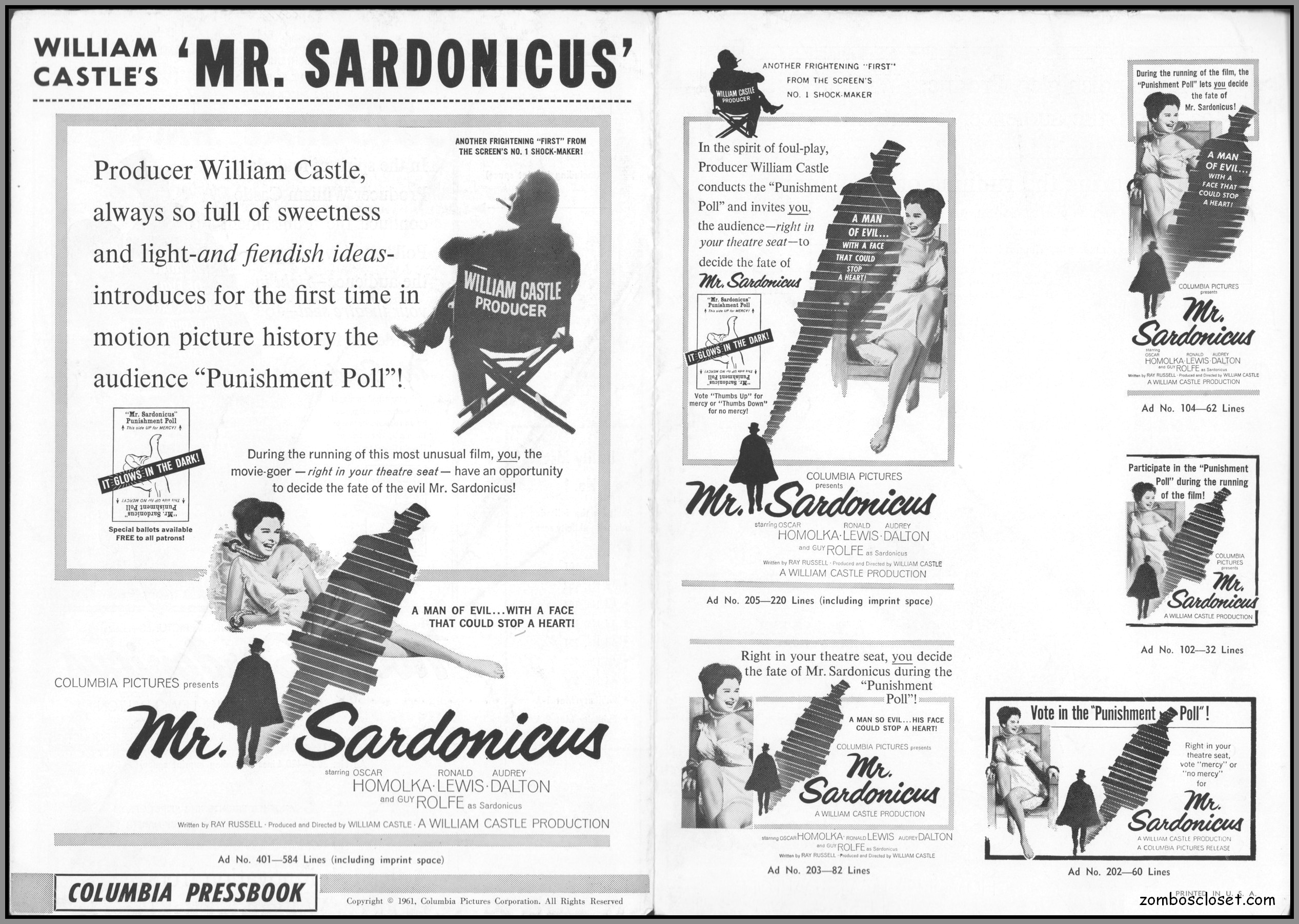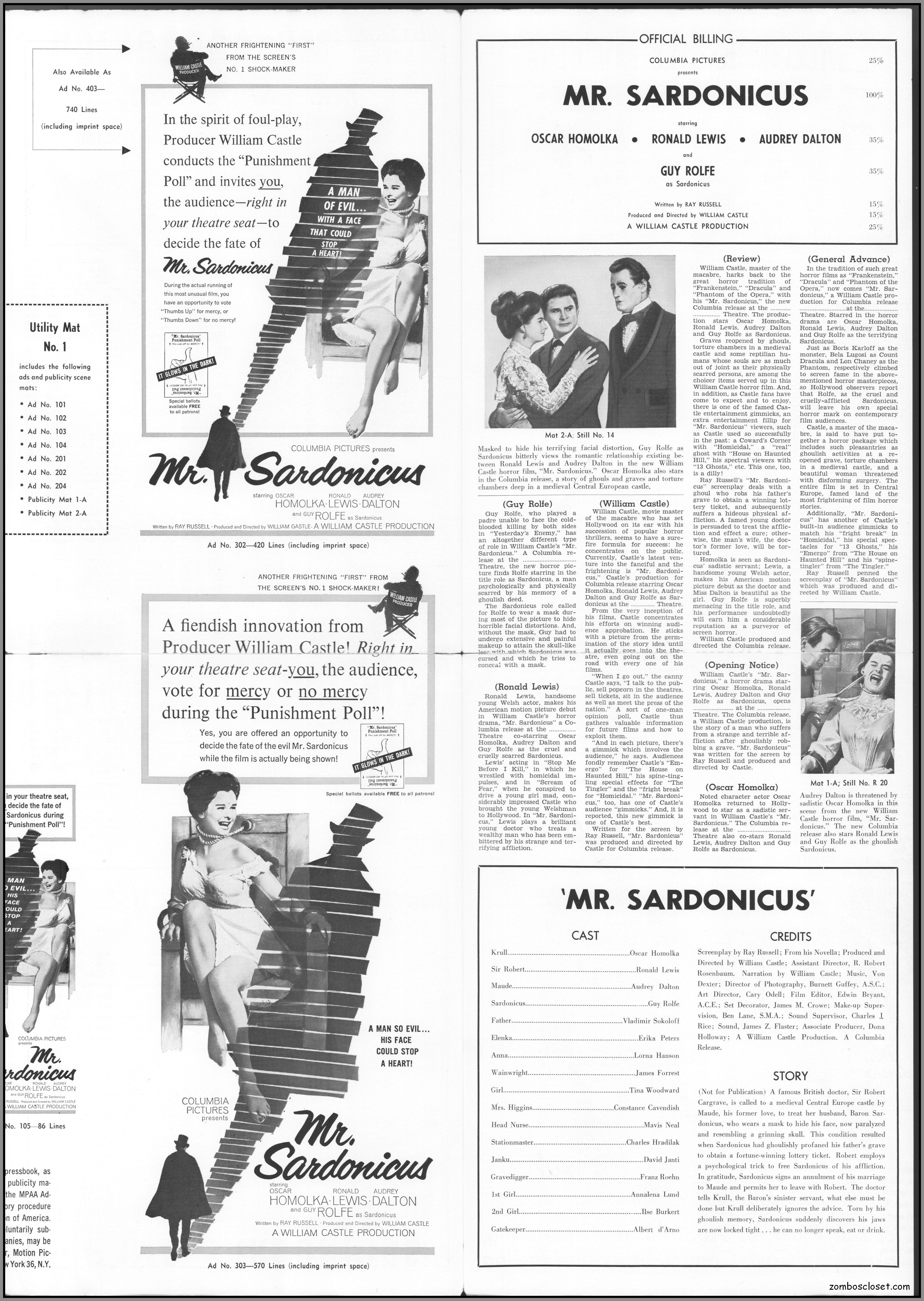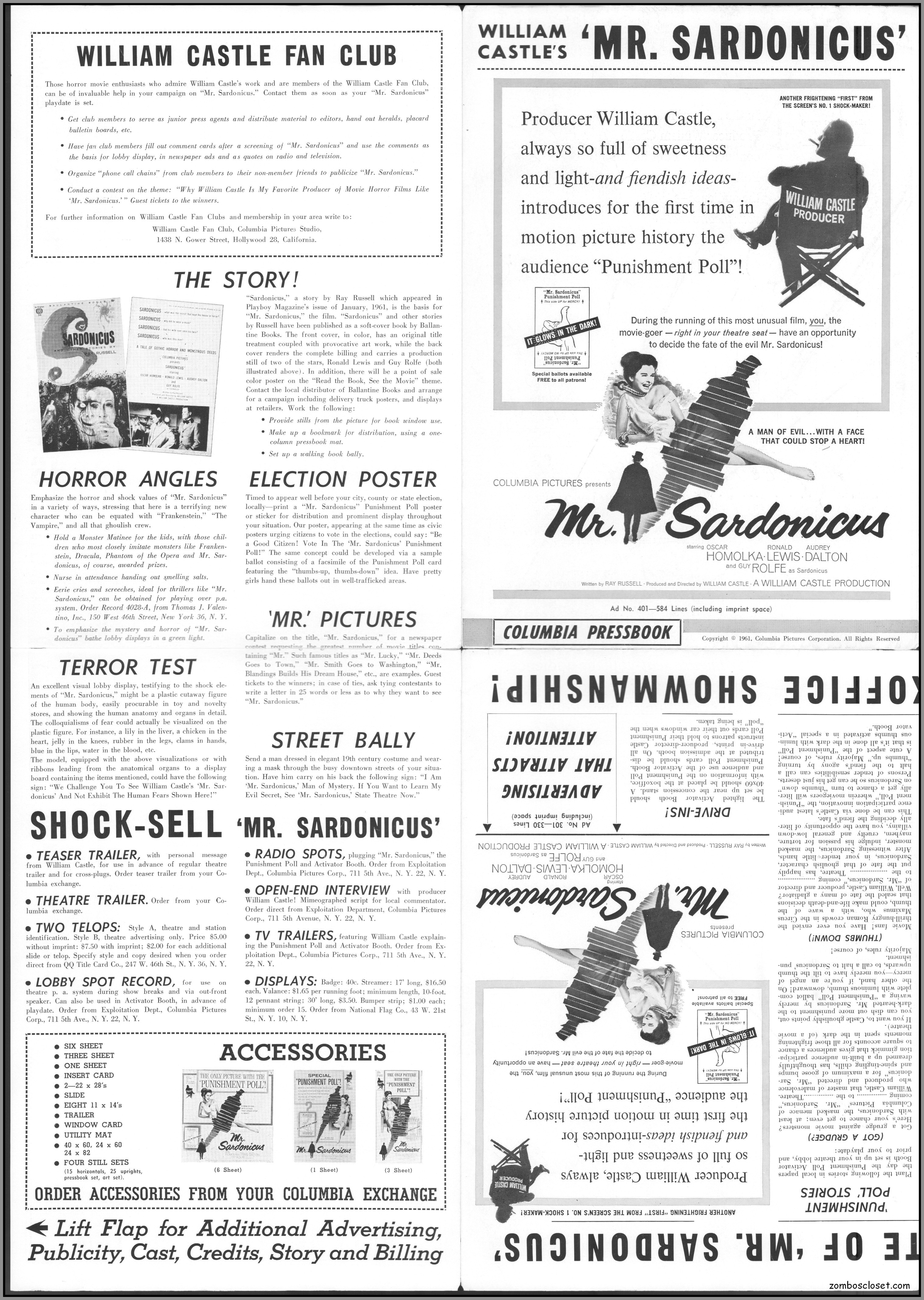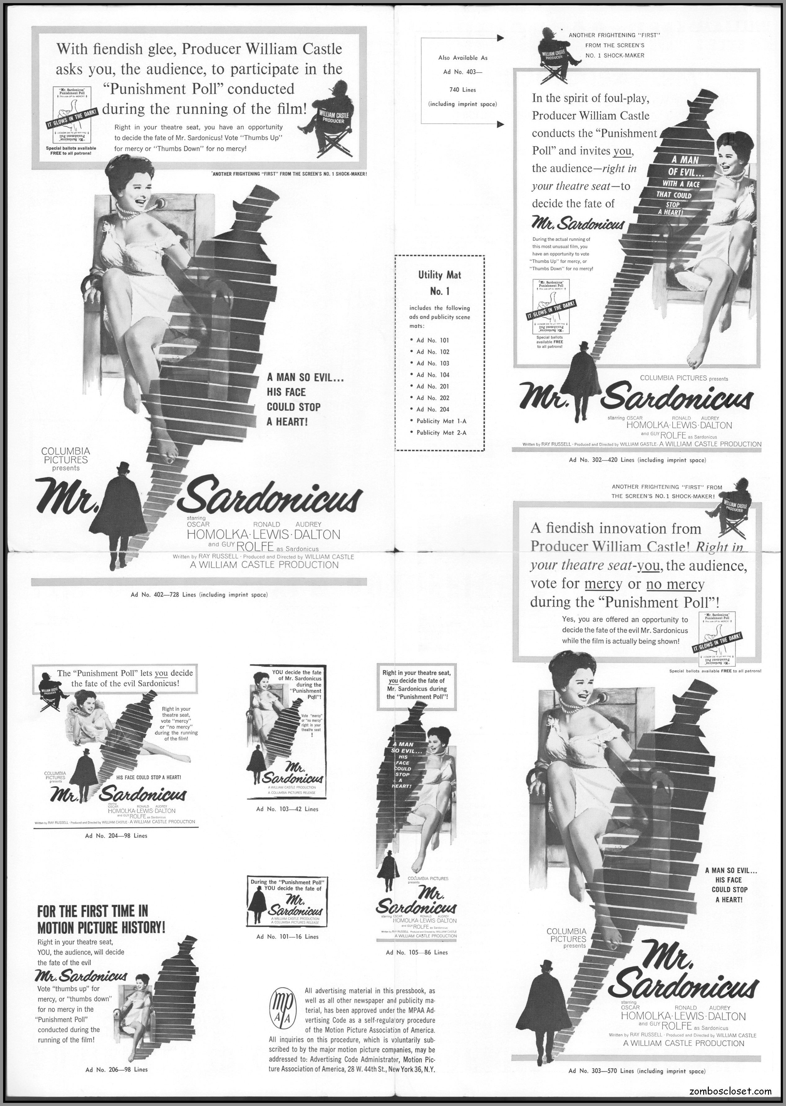 From Professor Kinema's archives comes this ominous copy of the Mr. Sardonicus pressbook. Lots of promotional material here, all laid out on one large sheet of glossy paper that folds to a nice petite mailing size for sending to theaters. The Punishment Poll was another gimmick William Castle used to get those butts in seats. We know there weren't two different endings shot for this movie, right? Mr. Sardonicus wasn't going to get off that easy now was he? Thanks to the Professor, here are some scene stills to entice you even more to see this one.