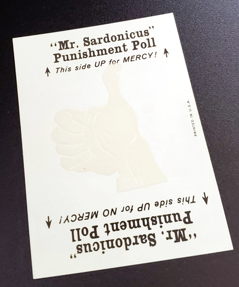 From the deep archives of Professor Kinema comes this Mr. Sardonicus Punishment Poll card. While the images are large, the card is small. Really small. You can easily fit it in the palm of your hand with room to spare. But size has nothing to do with coolness, and this card is cool. The thumbs up or down, depending on how you hold up the card, glows in the dark. Another one of William Castle’s clever audience participation gimmicks, movie goers would choose which way the thumb pointed–mercy or no mercy–during Mr. Castle’s prompting at the film’s end. Which would you have chosen?