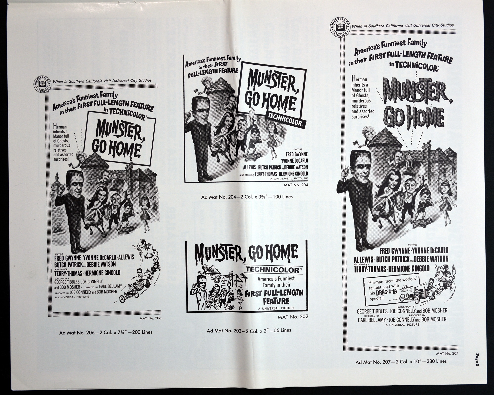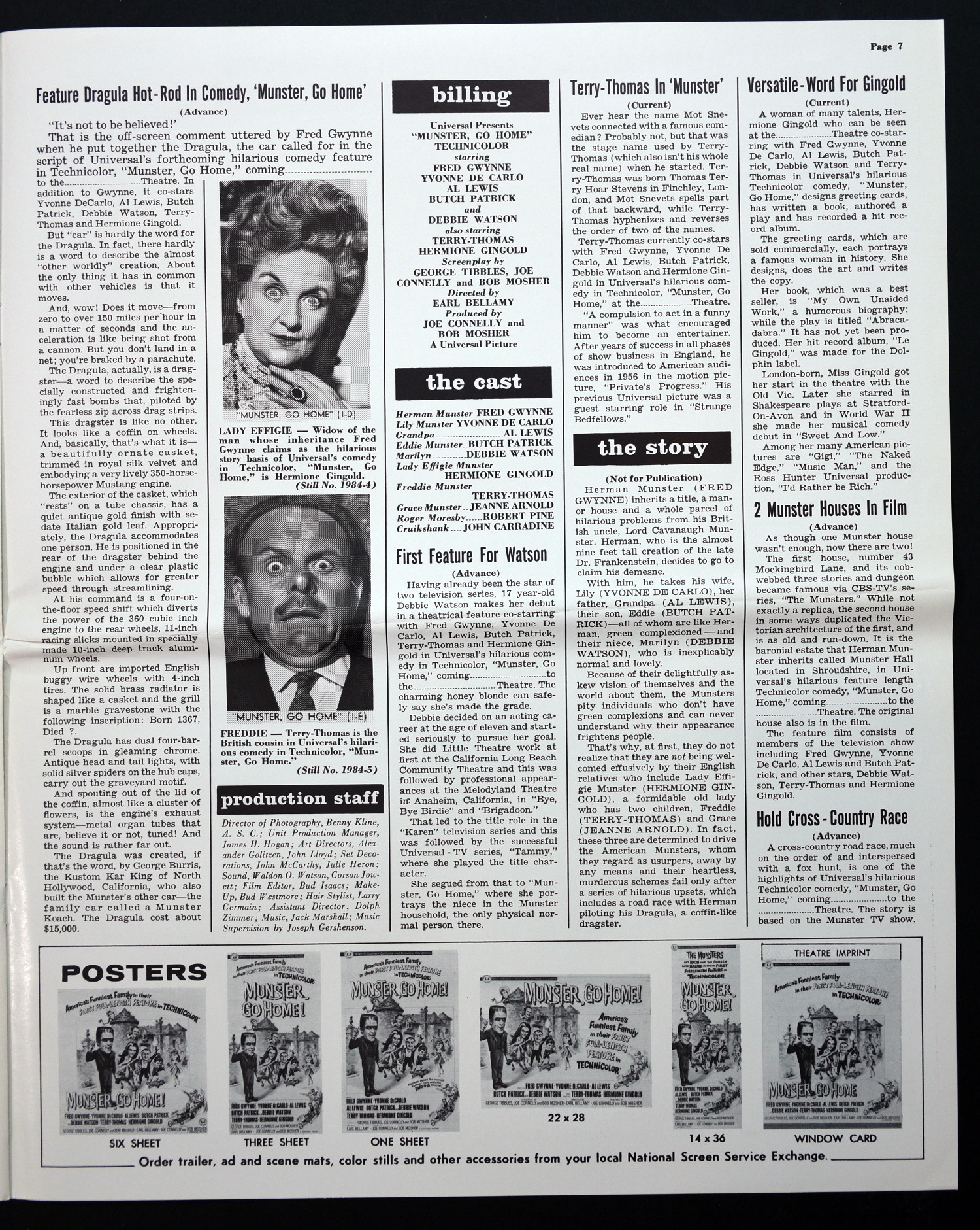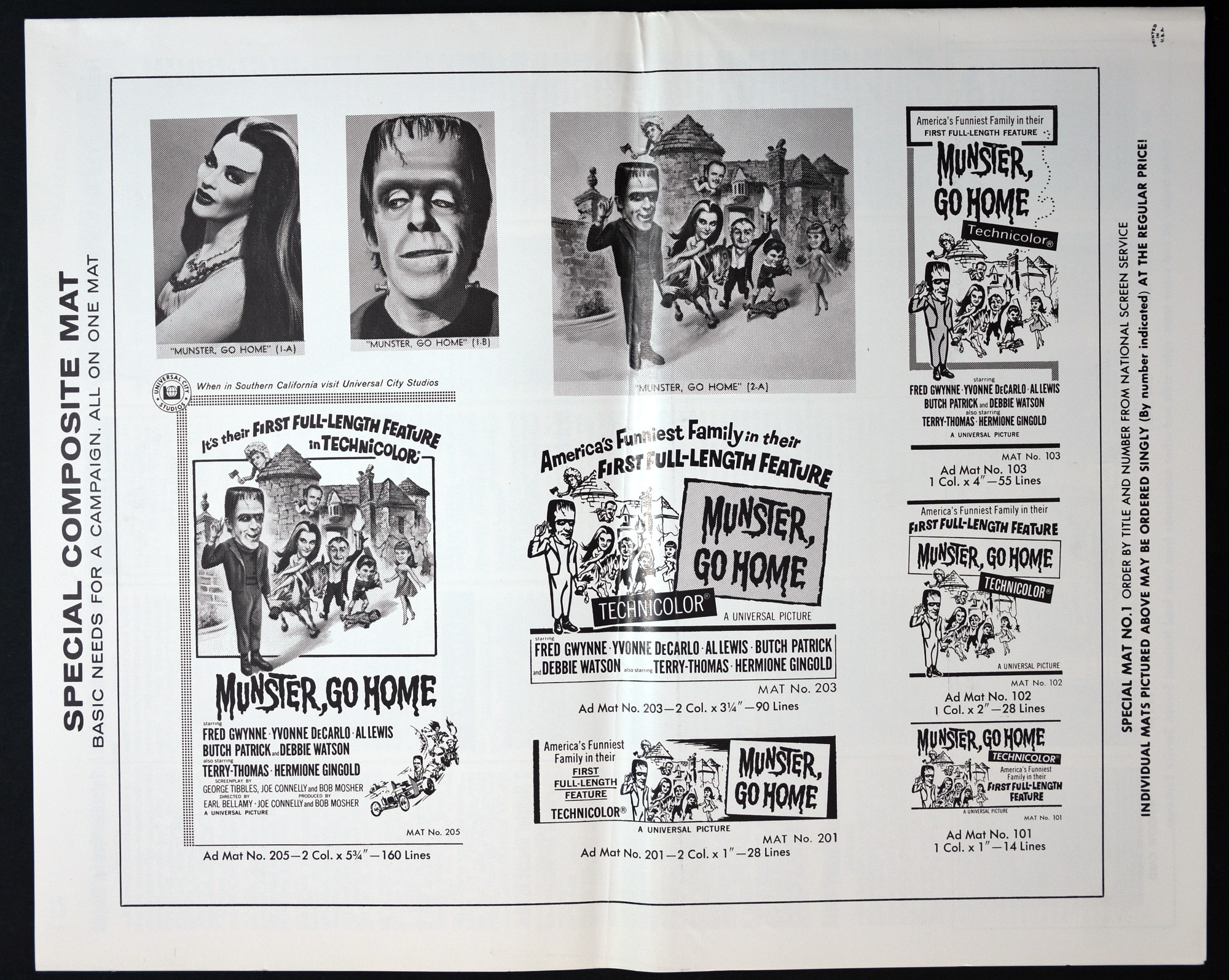 I still love watching The Munsters, and this movie is a lot of fun. Seeing them in color was a love/hate relationship for me. Gorgeous colors really made their makeup pop; but, given the spookiness and old movie charm that black and white naturally lends to monster stuff, the television series felt a bit more at home for a monsterkid. The banner accessories mentioned in the pressbook made me drool. I've yet to see them. Here's the comic book reader version:  Download Munster, Go Home Pressbook. And here is the Munsters, Go Home Mexican lobby card