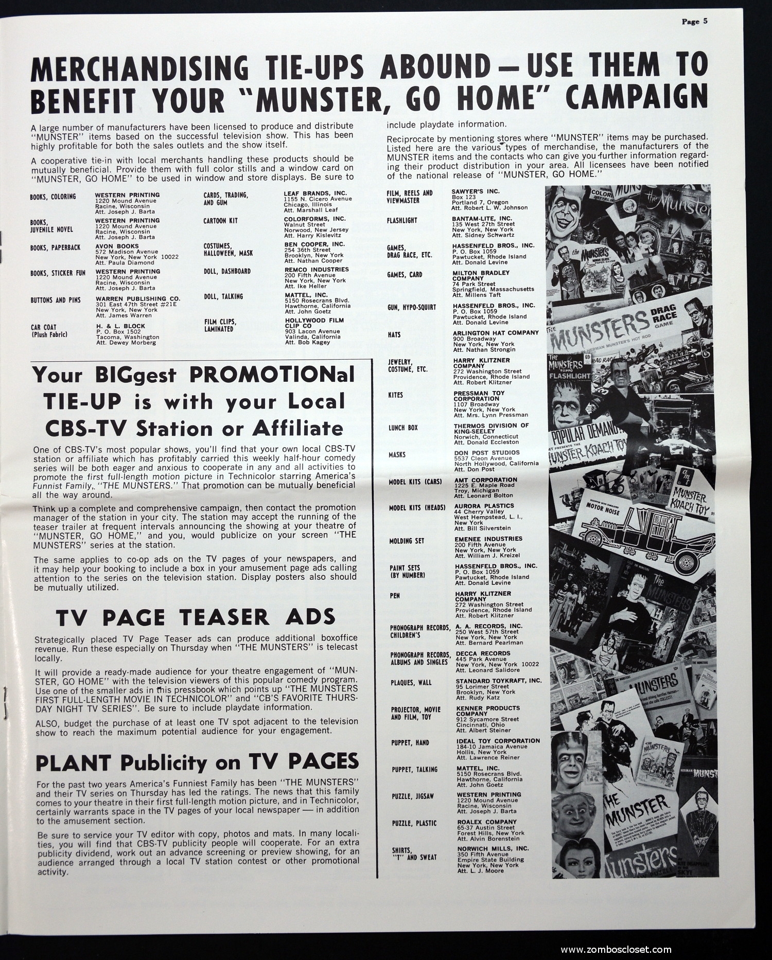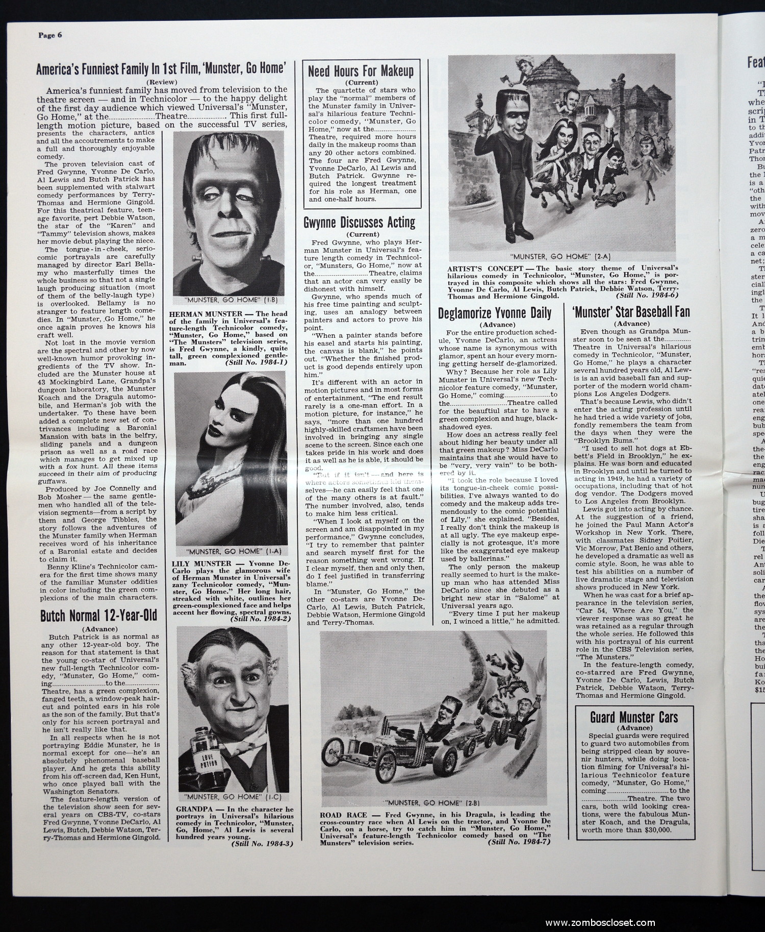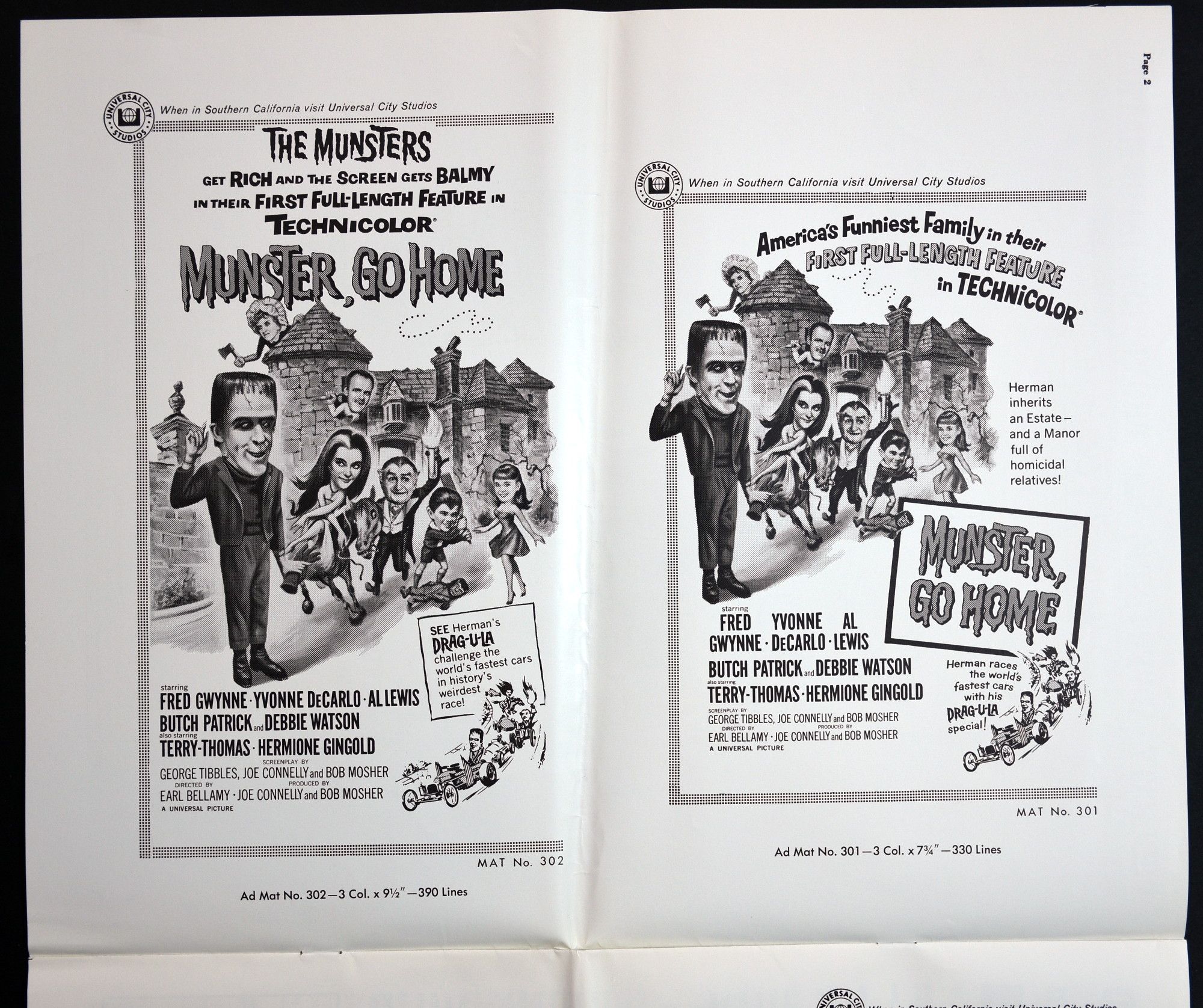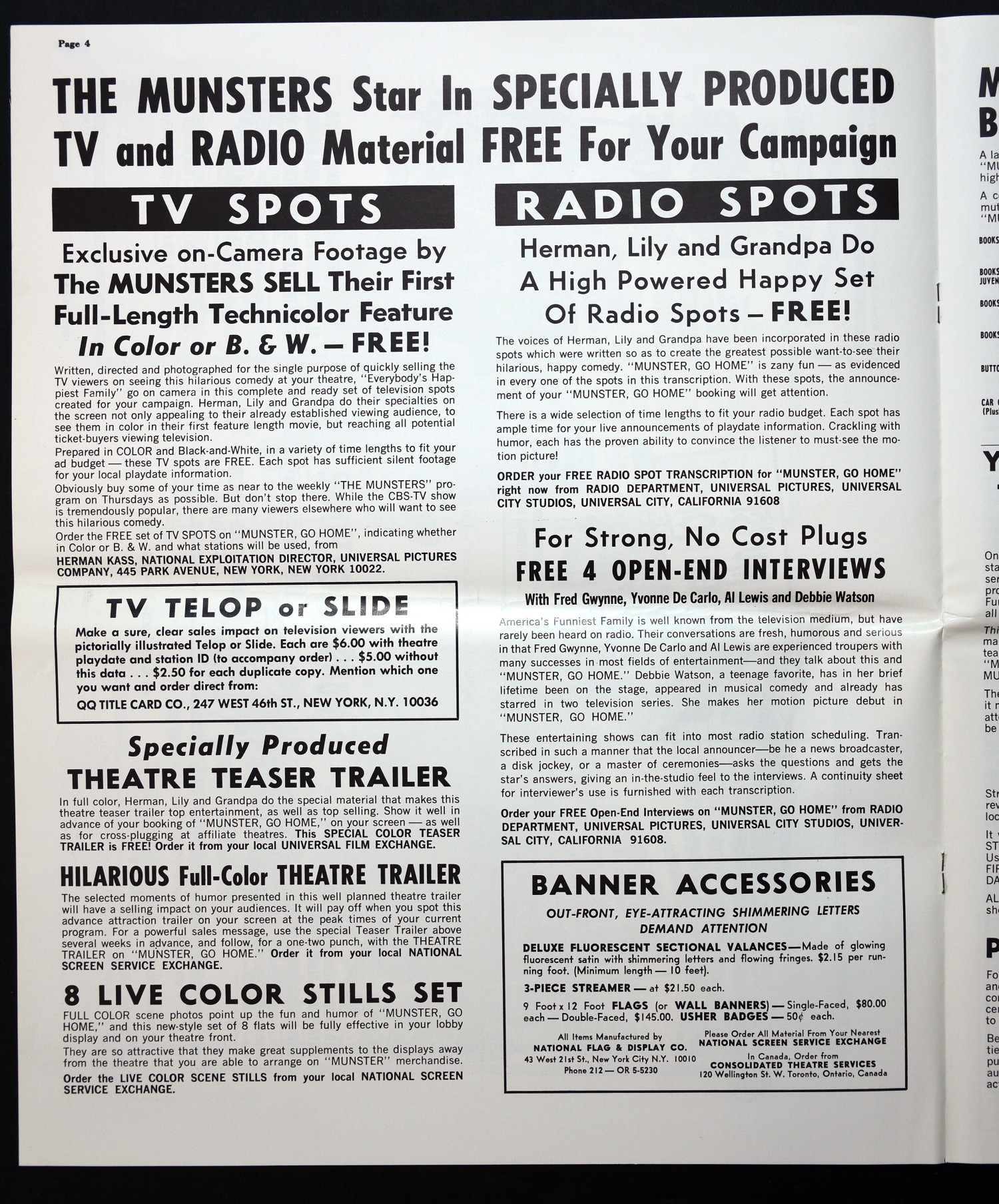 I still love watching The Munsters, and this movie is a lot of fun. Seeing them in color was a love/hate relationship for me. Gorgeous colors really made their makeup pop; but, given the spookiness and old movie charm that black and white naturally lends to monster stuff, the television series felt a bit more at home for a monsterkid. The banner accessories mentioned in the pressbook made me drool. I've yet to see them. Here's the comic book reader version:  Download Munster, Go Home Pressbook. And here is the Munsters, Go Home Mexican lobby card