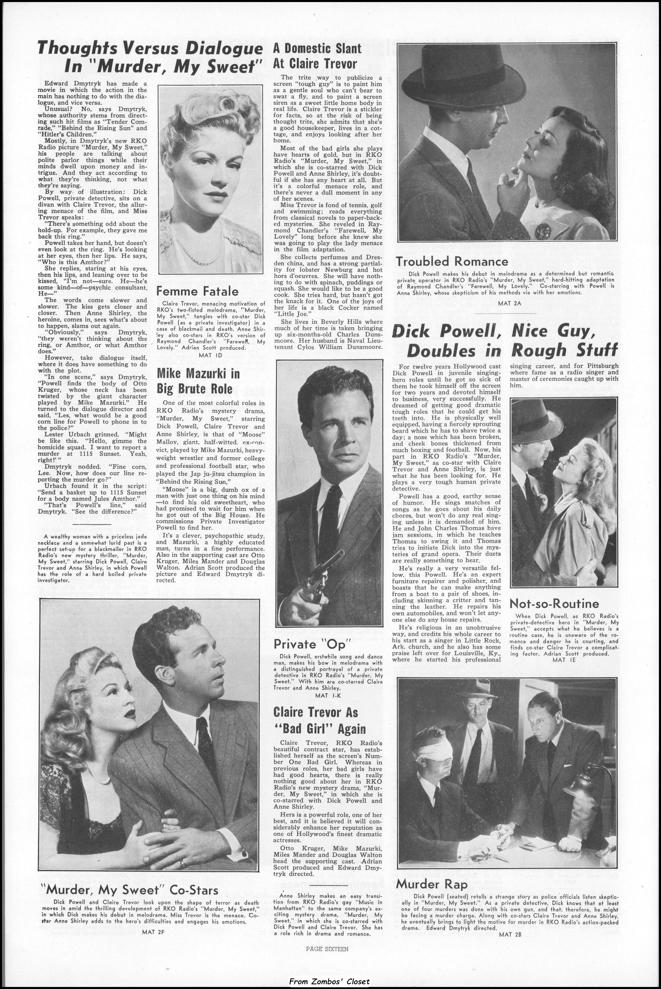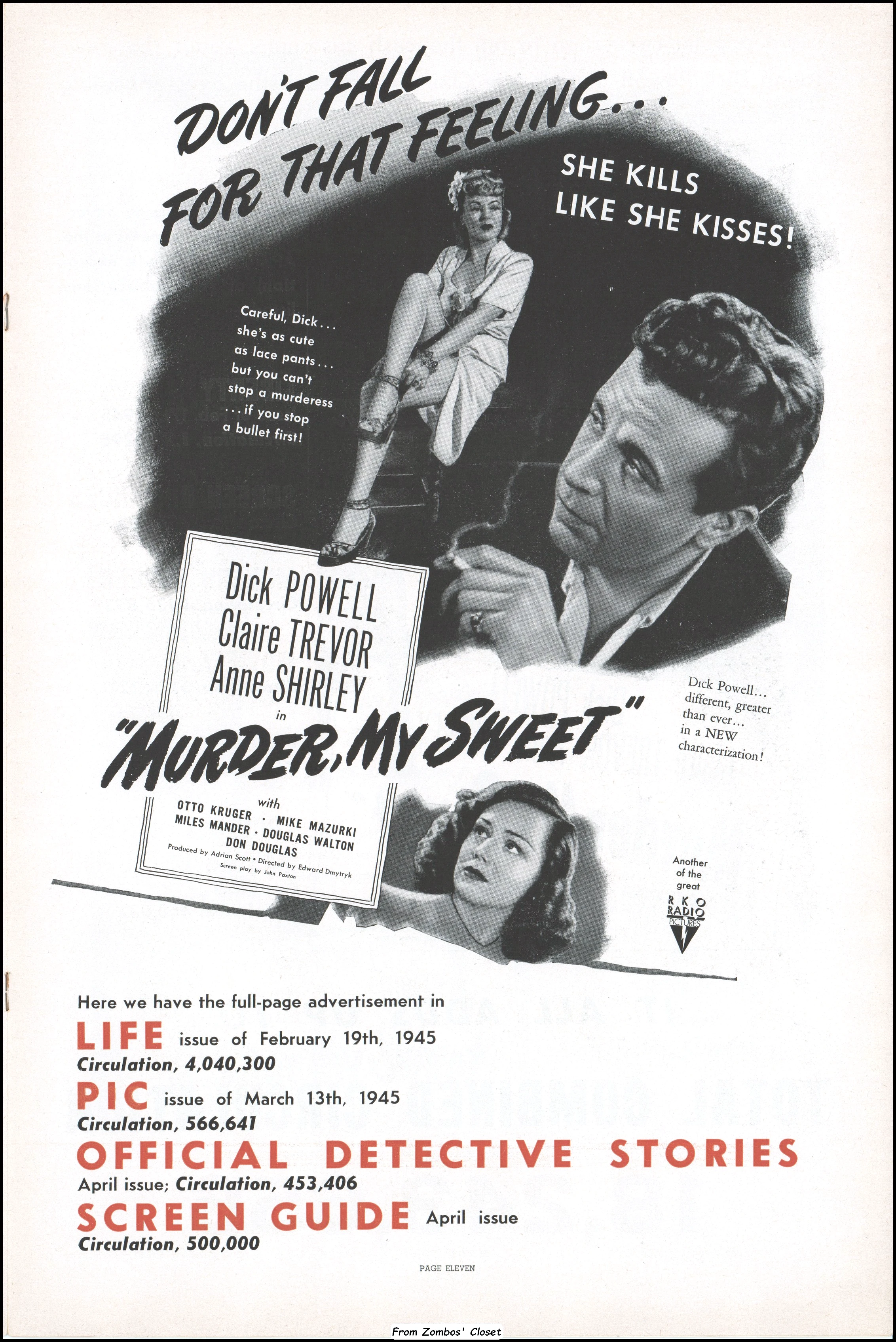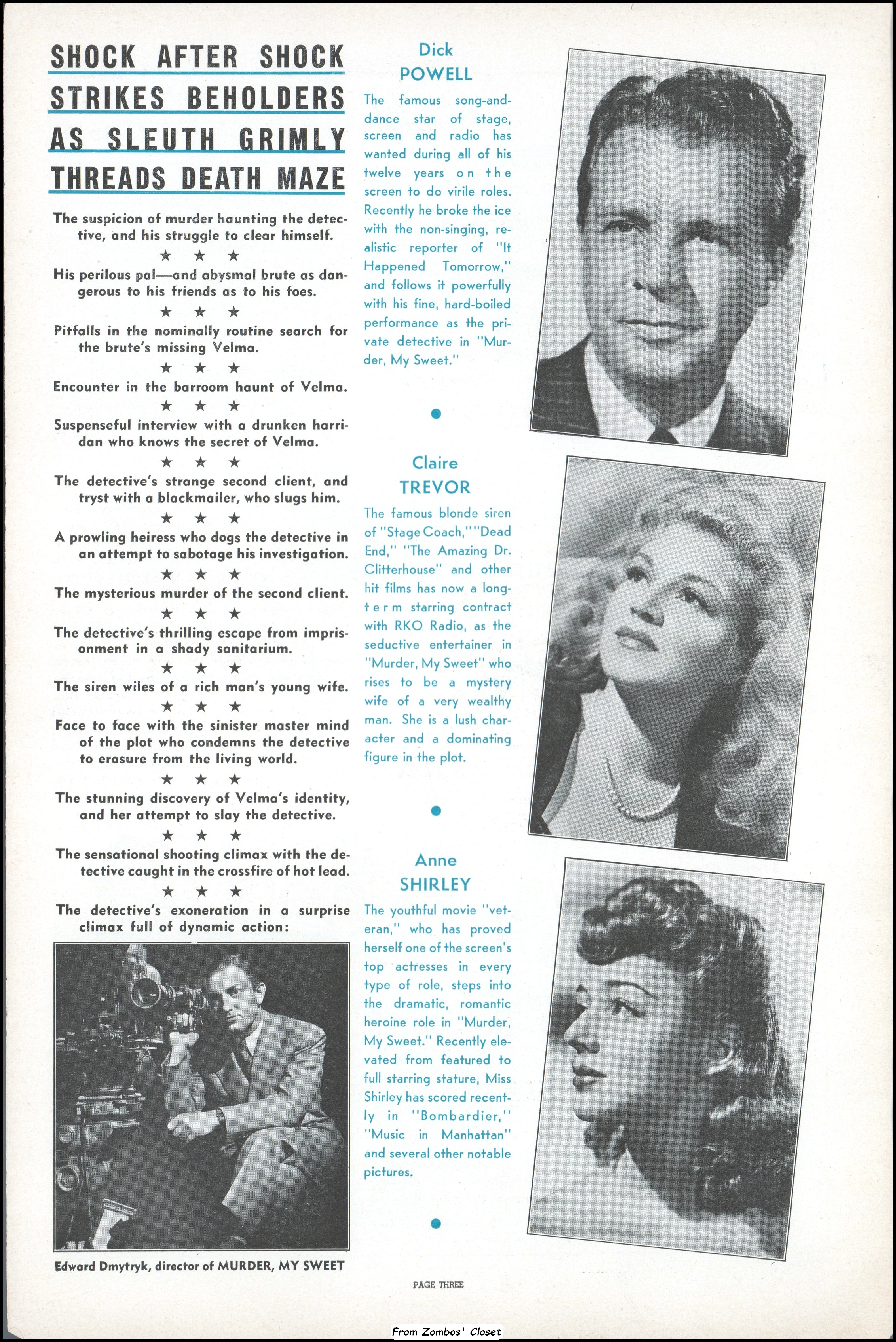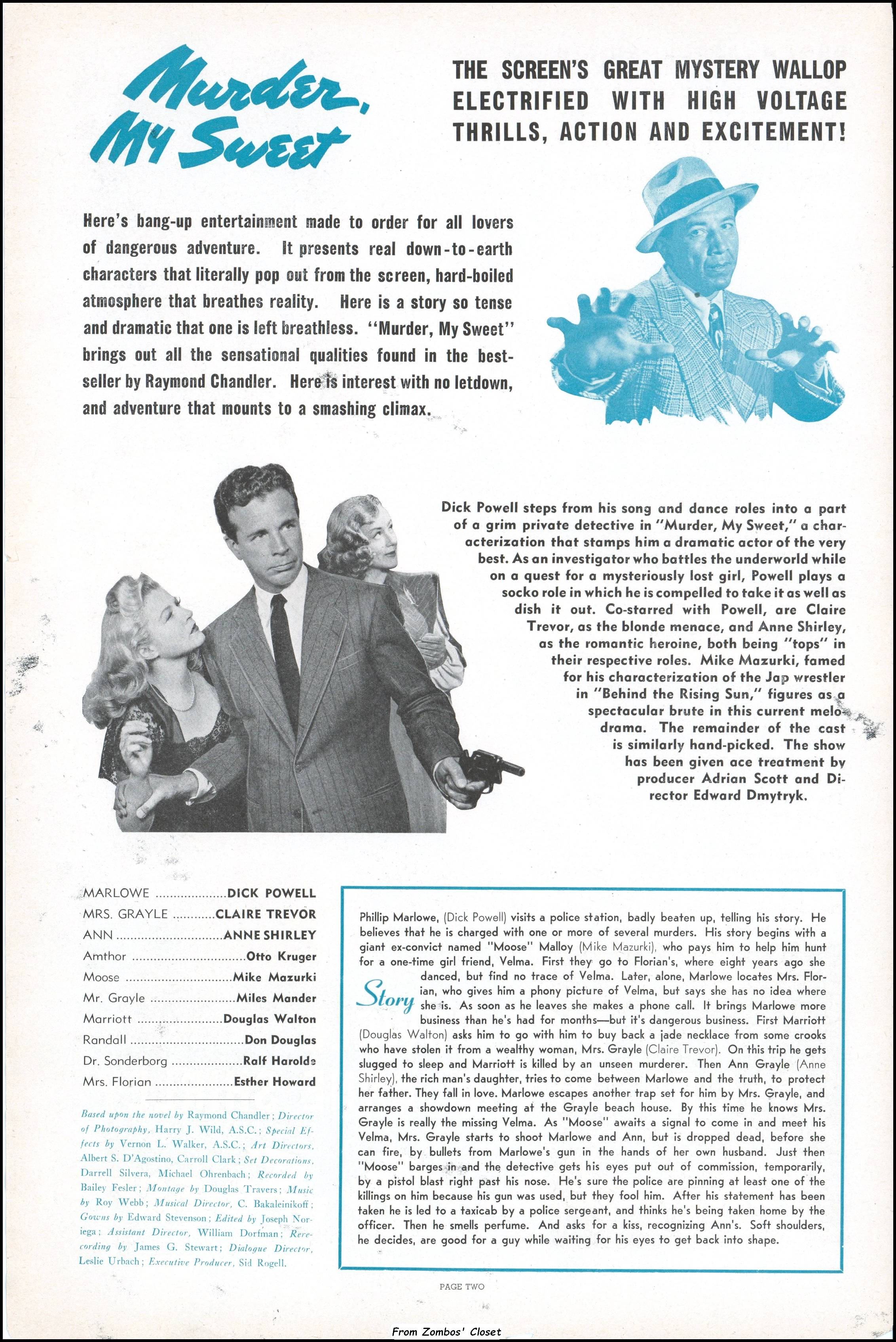 I’m a sucker for flashback noirs, I admit it. Give me D.O.A and I can watch it over and over again, though sometimes the dialog gets too syrupy. Give me Murder, My Sweet, with William Powell, and you can wipe the drool from my lips because I’ll be too busy watching Powell’s Philip Marlowe, private detective, getting squeezed like a tangerine by Mike Mazurki (as Moose Malloy), while Moose gets squeezed by memories of Velma (Claire Trevor), who Moose he hires a reluctant Marlowe to find. Moose may be short a third rail but he can squeeze real good. And Marlowe keeps getting squeezed by everybody, which makes this version of Raymond Chandler’s Farwell, My Lovely, a knockout punch. Powell, a musical comedy actor who yearned for more dramatic roles, bit off all he could chew with the role, and, aside from Robert Mitchum, makes the perfect onscreen Marlowe. This movie set the bar for noir movies to follow, with its snappy dialog, dreamy visuals, and characters that moved between dark and light with their desires in the urban environment. I became a Raymond Chandler, Rex Stout fan, having read their novels, between midnight and dawn, while working at Casablanca records as a night guard back in the 1970s in New York City. Now if Hollywood can actually do a decent Nero Wolfe and Archie Goodwin movie, I’d be aces.