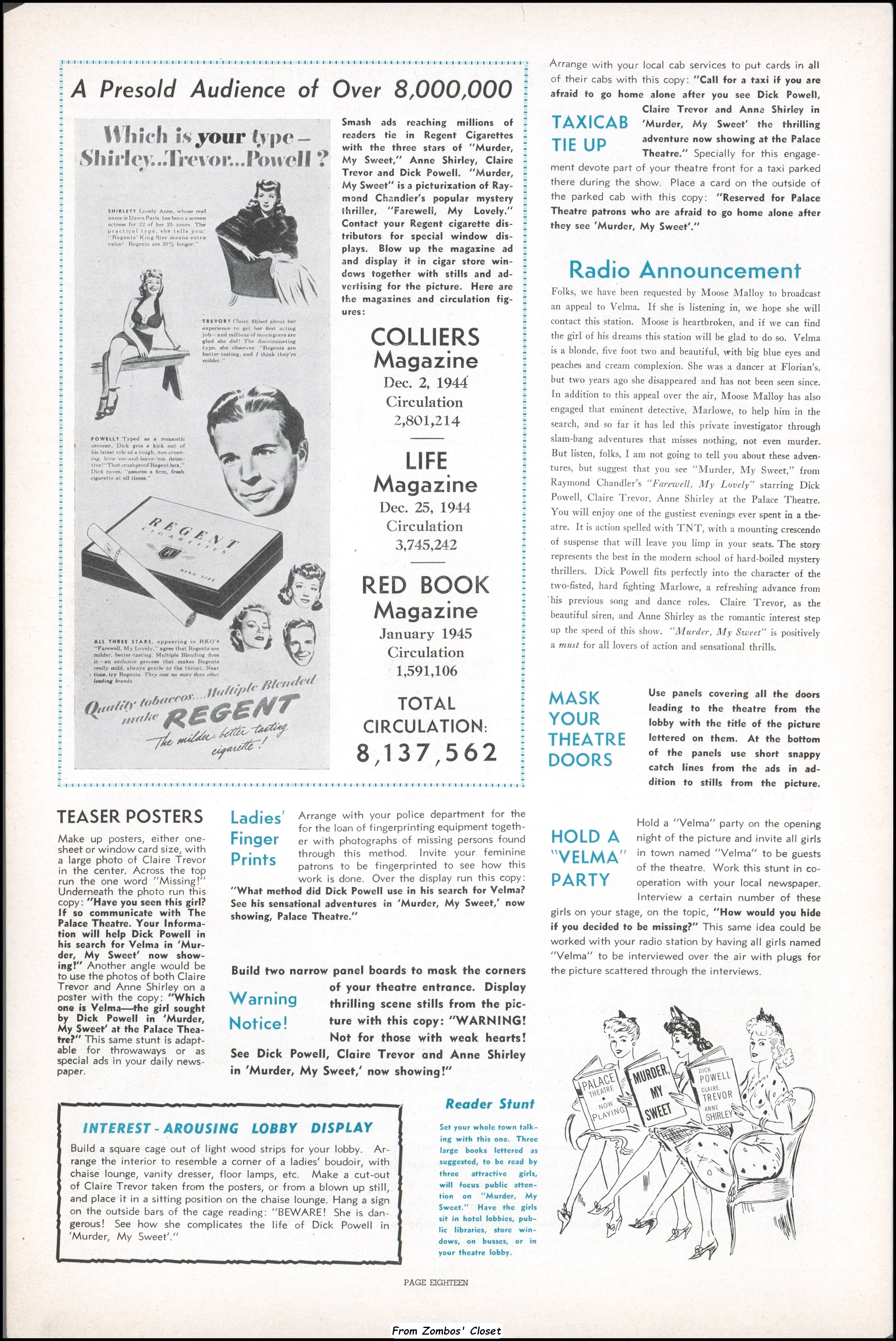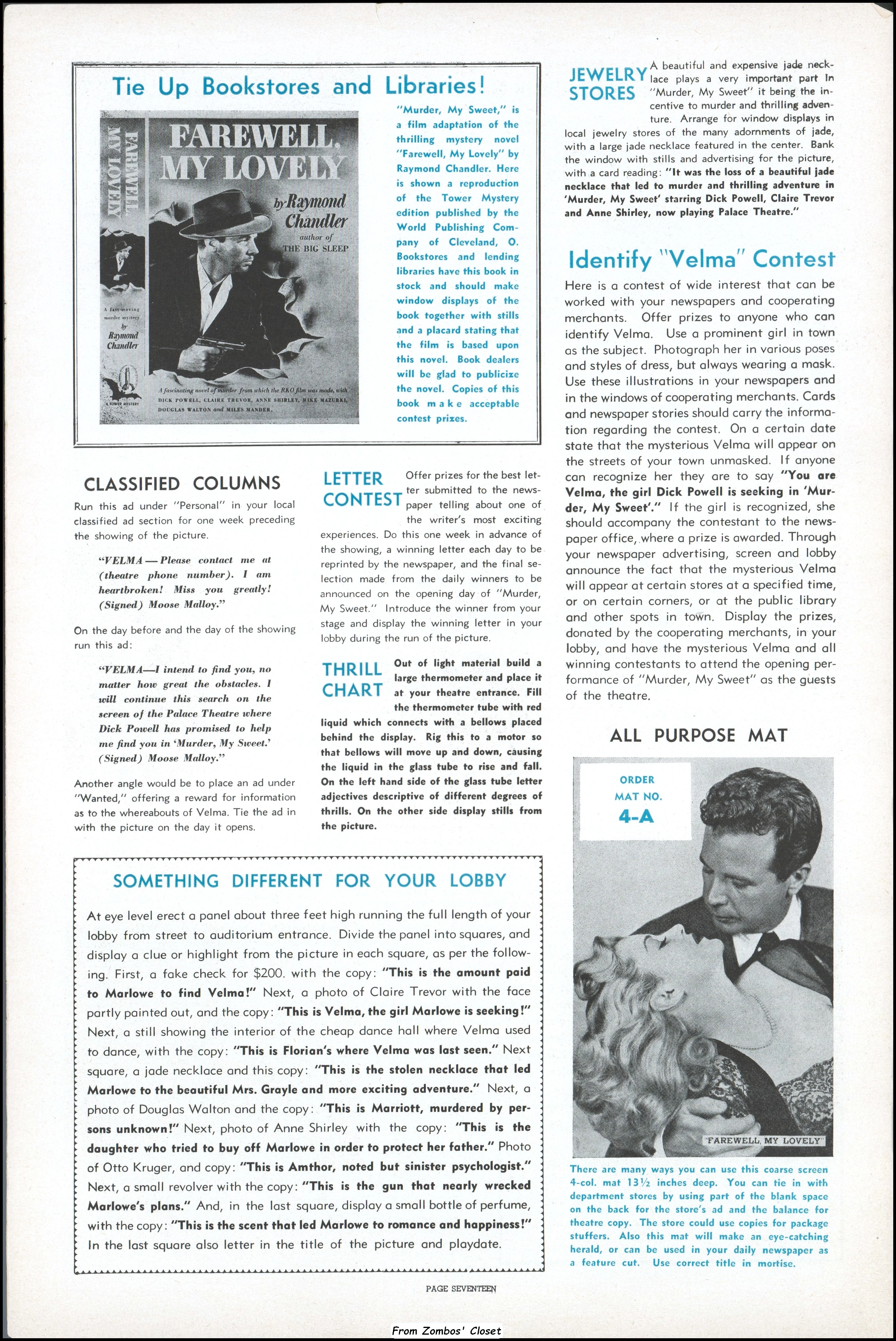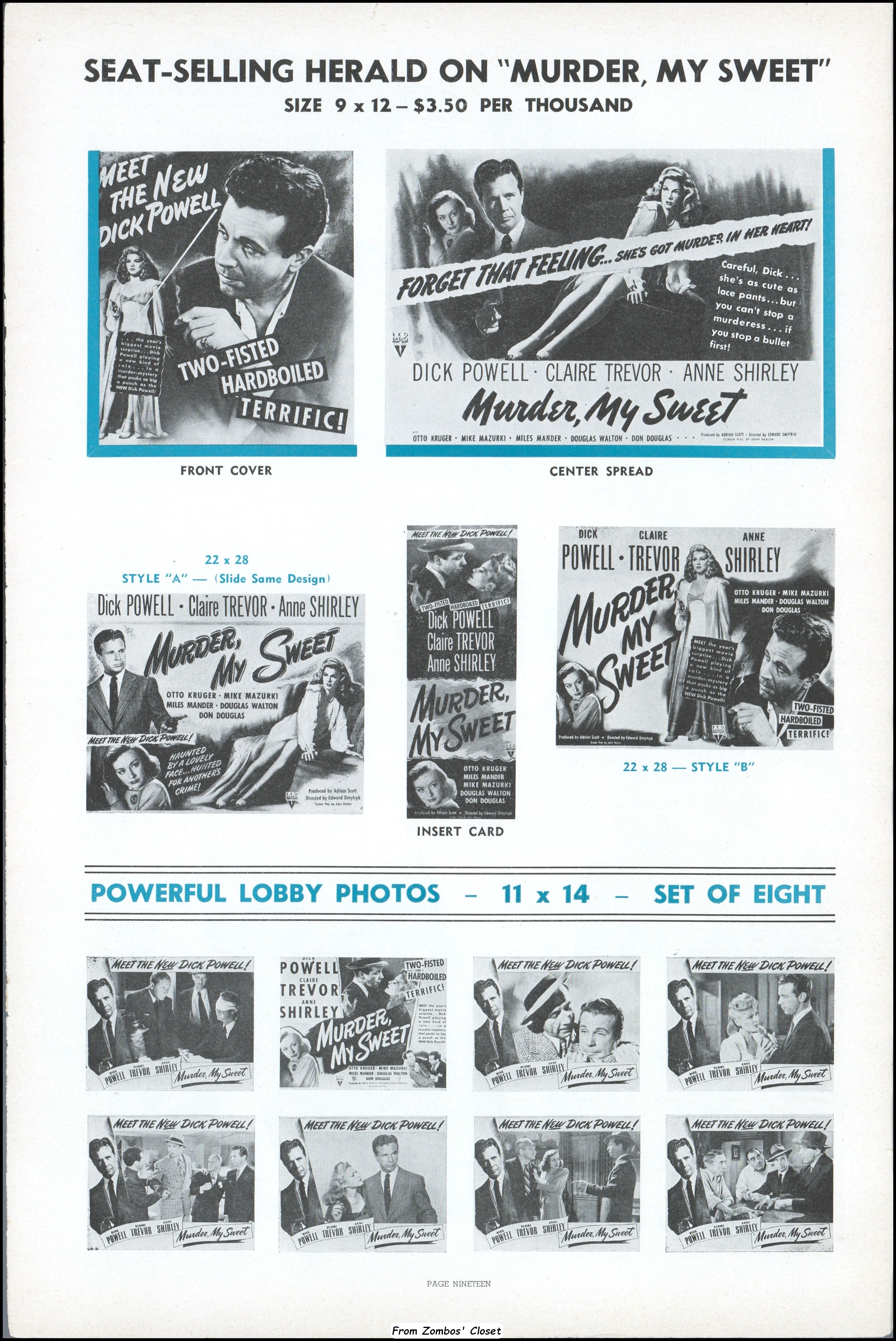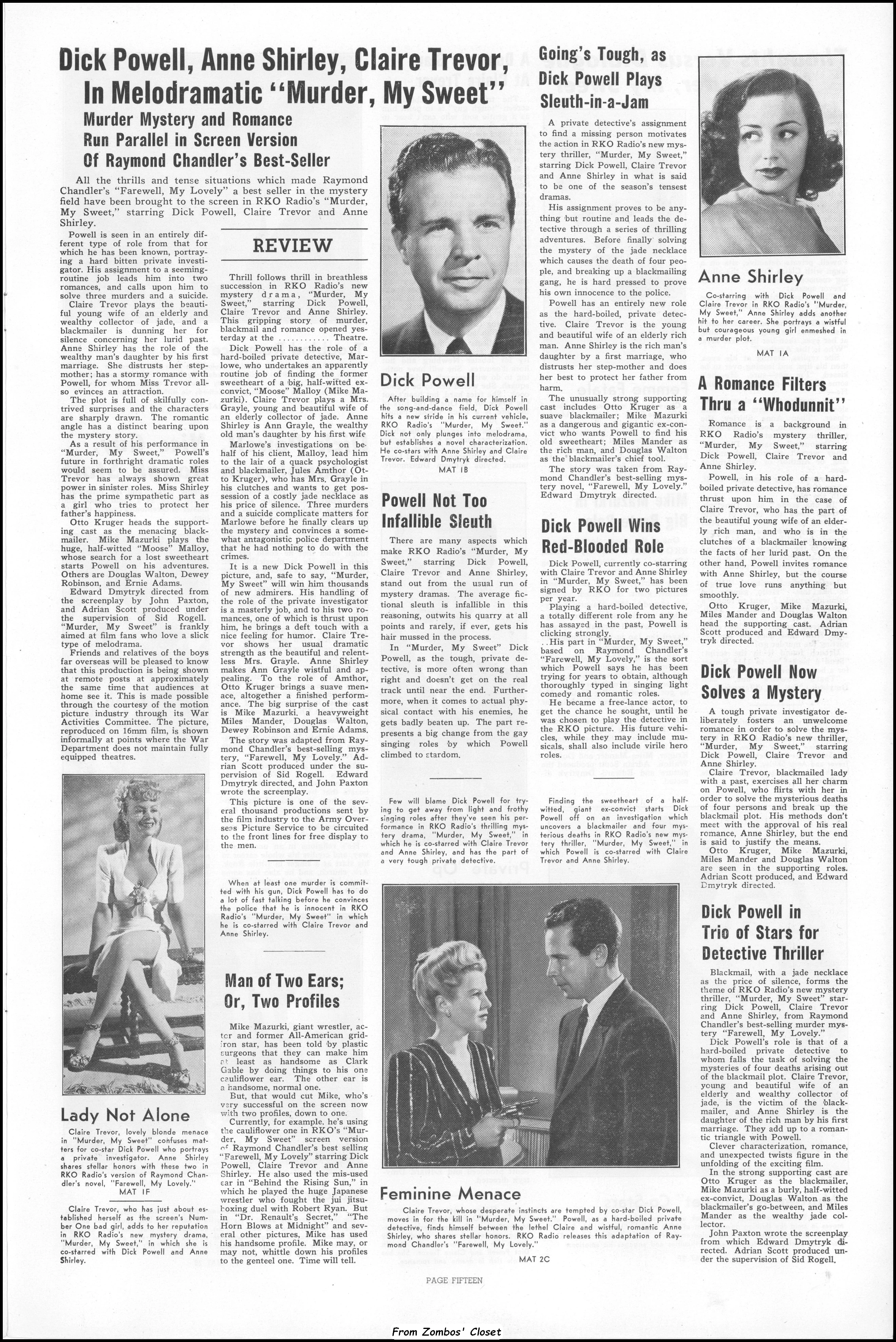 I’m a sucker for flashback noirs, I admit it. Give me D.O.A and I can watch it over and over again, though sometimes the dialog gets too syrupy. Give me Murder, My Sweet, with William Powell, and you can wipe the drool from my lips because I’ll be too busy watching Powell’s Philip Marlowe, private detective, getting squeezed like a tangerine by Mike Mazurki (as Moose Malloy), while Moose gets squeezed by memories of Velma (Claire Trevor), who Moose he hires a reluctant Marlowe to find. Moose may be short a third rail but he can squeeze real good. And Marlowe keeps getting squeezed by everybody, which makes this version of Raymond Chandler’s Farwell, My Lovely, a knockout punch. Powell, a musical comedy actor who yearned for more dramatic roles, bit off all he could chew with the role, and, aside from Robert Mitchum, makes the perfect onscreen Marlowe. This movie set the bar for noir movies to follow, with its snappy dialog, dreamy visuals, and characters that moved between dark and light with their desires in the urban environment. I became a Raymond Chandler, Rex Stout fan, having read their novels, between midnight and dawn, while working at Casablanca records as a night guard back in the 1970s in New York City. Now if Hollywood can actually do a decent Nero Wolfe and Archie Goodwin movie, I’d be aces.