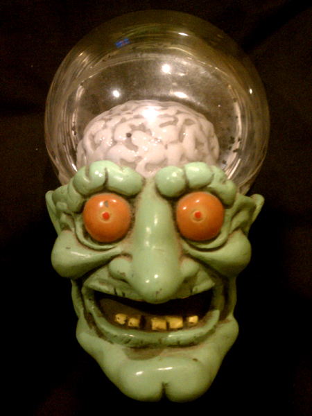 I have a lot of skulls. I mean, A LOT of skulls. But I guess one of my favorite things is a Halloween snowglobe I’ve had for years. It’s the head of a green goblin-monster-thing, with big bulging orange eyes. The top and back of his head forms the snowglobe, with his brain exposed inside the clear dome. Instead of snow, it’s filled with tiny plastic bats and other bits of detritus.