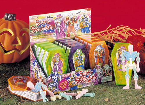 I love monsters toys and whatnot and decorating with Halloween tchochkes all year ’round. I’m amazed at what a place like Target has for Halloween, so much fun monstrous stuff you can use anytime. Recently on eBay I found some kids’ monster books that I had when I was young; those bring back fun memories for me. And I love those skeleton candies that come in a little plastic coffin.