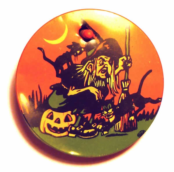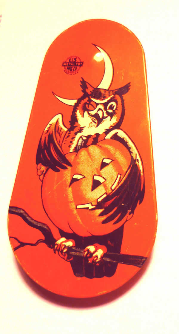 One of my favorite pieces of Halloween non-fiction writing is an essay by Carl B. Holmberg called "Things That Go Snap-Rattle-Clang-Toot-Crank in the Night: Halloween Noisemakers" (from the book HALLOWEEN AND OTHER FESTIVALS OF DEATH AND LIFE), and that essay really got me started on noisemakers. Strangely enough, I never used noisemakers as a kid (apparently they never really made it to the west coast), but I just love their colorful graphics and the idea of kids making scads of noise with these things on Halloween night. I've attached photos of two that are probably my favorites: You can't beat that image of the witch with her cats, and the winking owl with the jack-o'-lantern just somehow always make me smile.