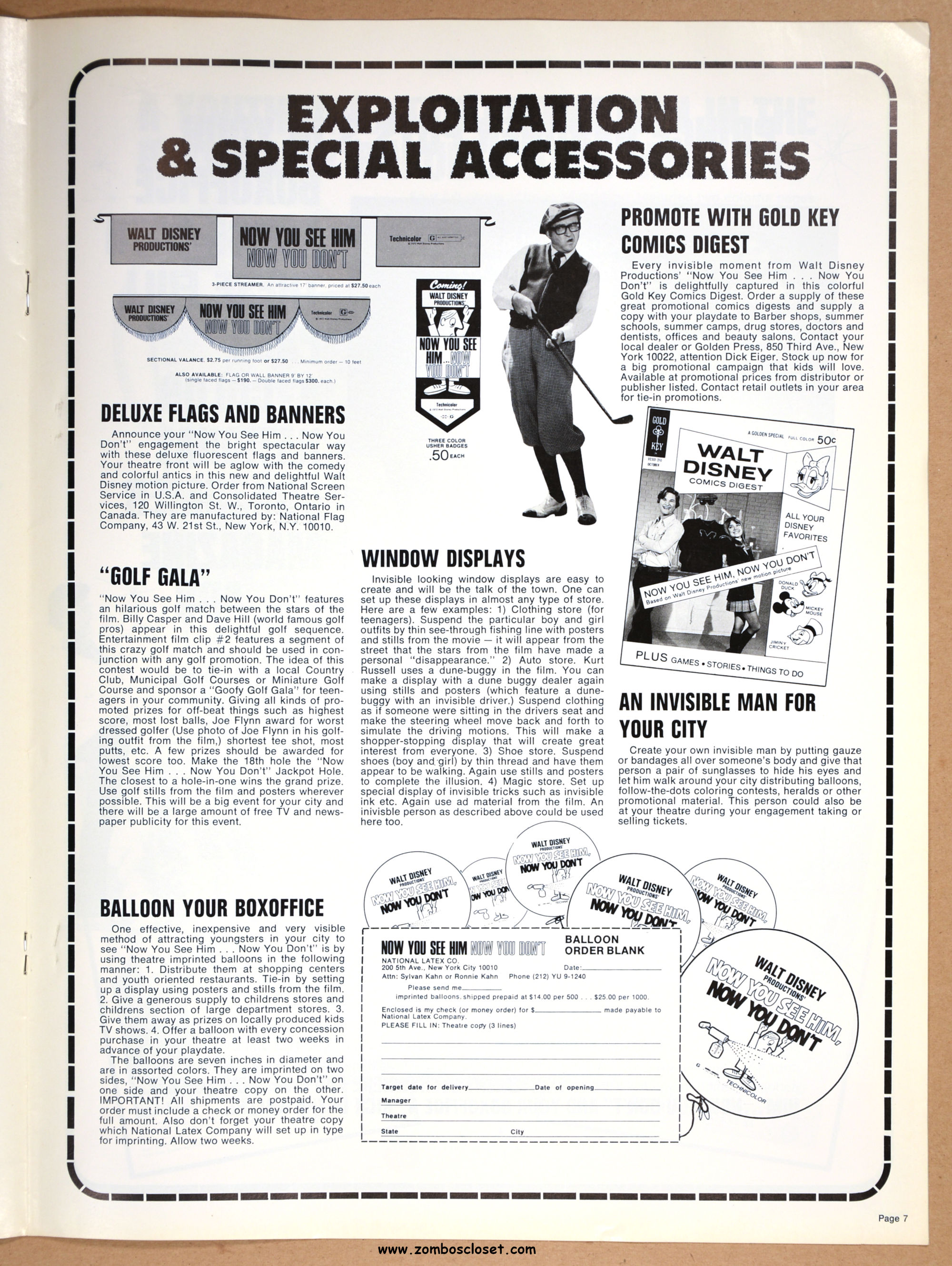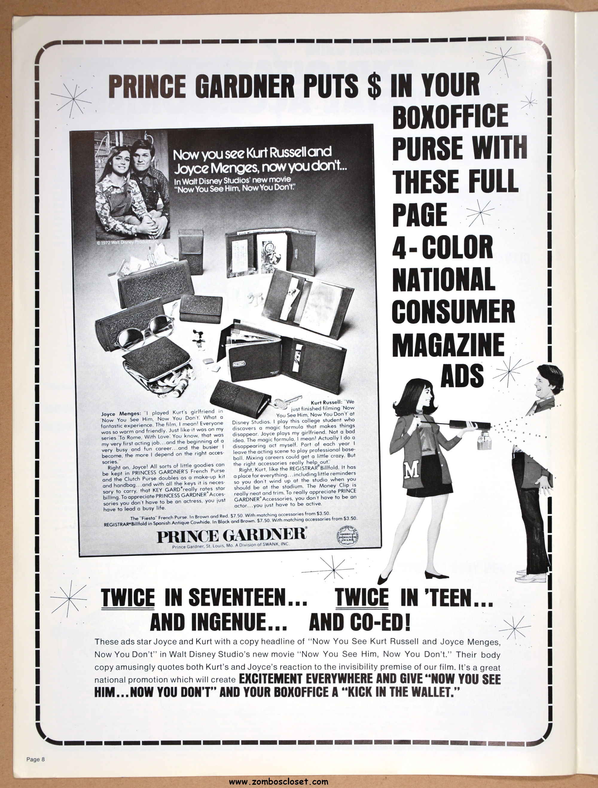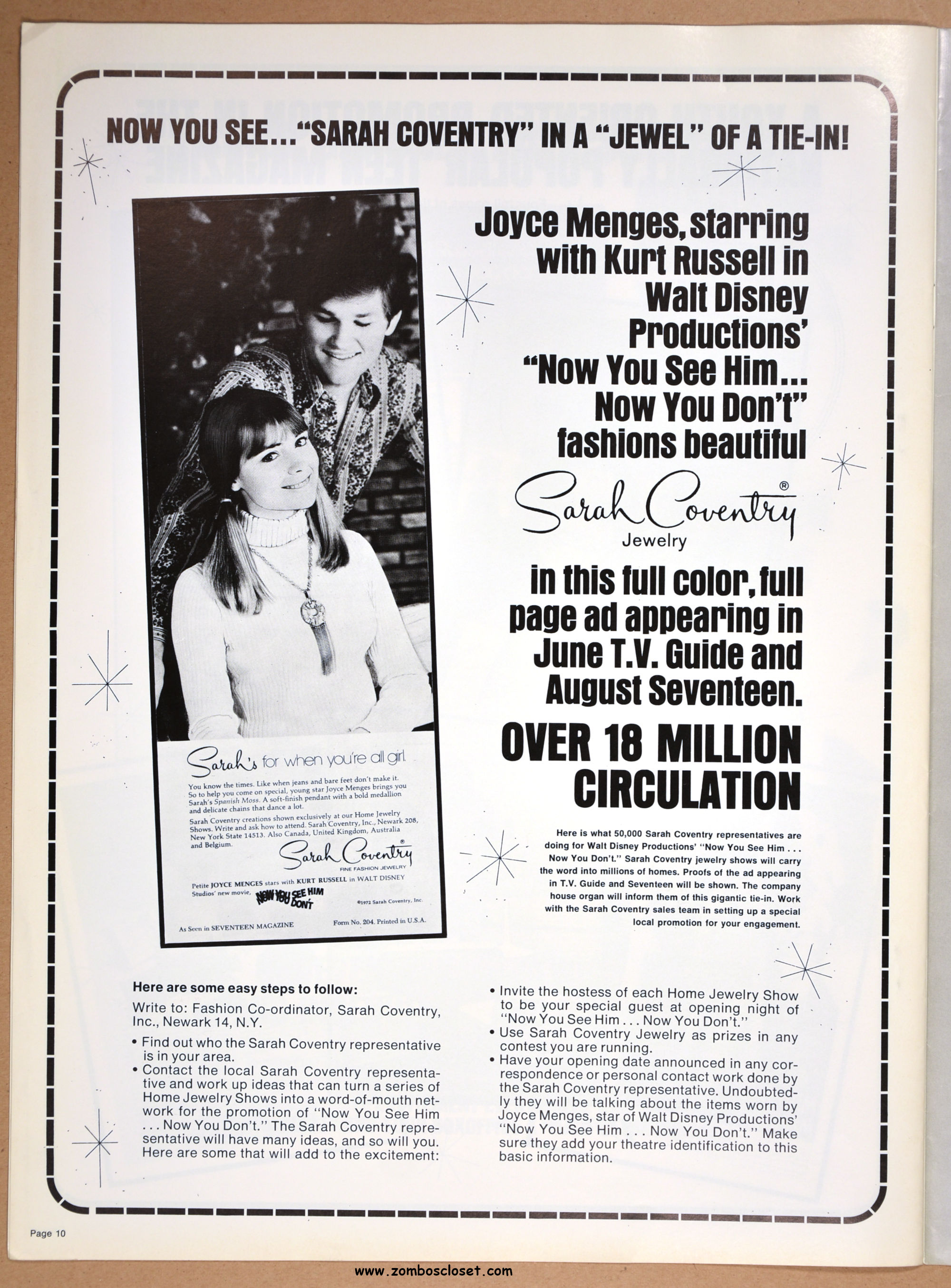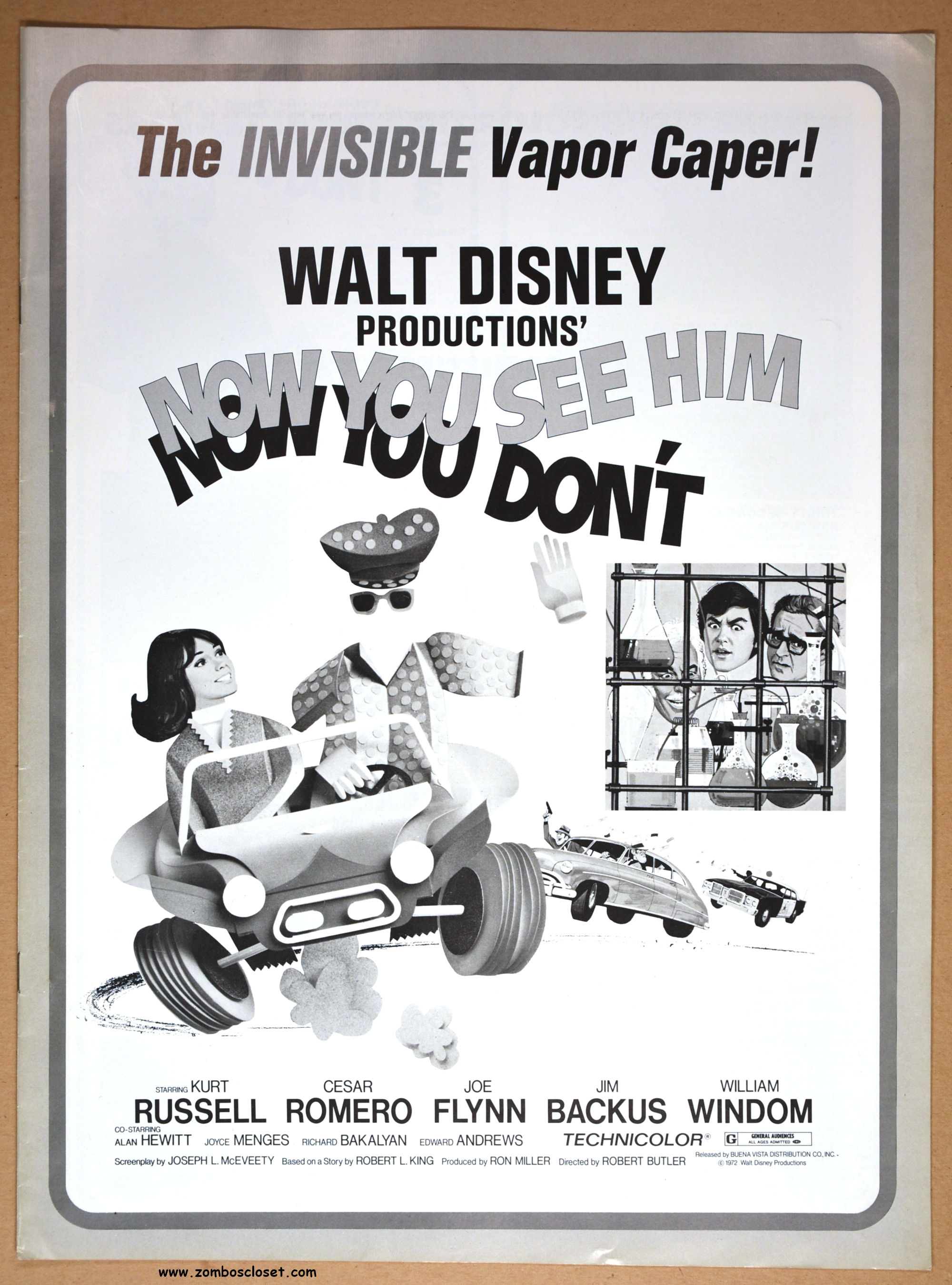 Wikipedia notes this is the first Disney movie to be shown on television in a two-hour time slot, in 1975. Previous movies were edited or shown in two one-hour time slots. As usual, Disney heaps on the tie-ins, from jewelry to wallets and purses, to the Dell comic book. There’s also a tie-in to ‘Teen magazine. A plus for the movie is all the memorable stars appearing in it like Kurt Russell, Jim Backus, William Windom, and Cesar Romero to name some of them. The New York Times reviewer, Howard Thompson, at the time, said to try the real McCoy and see the original The Invisible Man, although other critics were kinder.