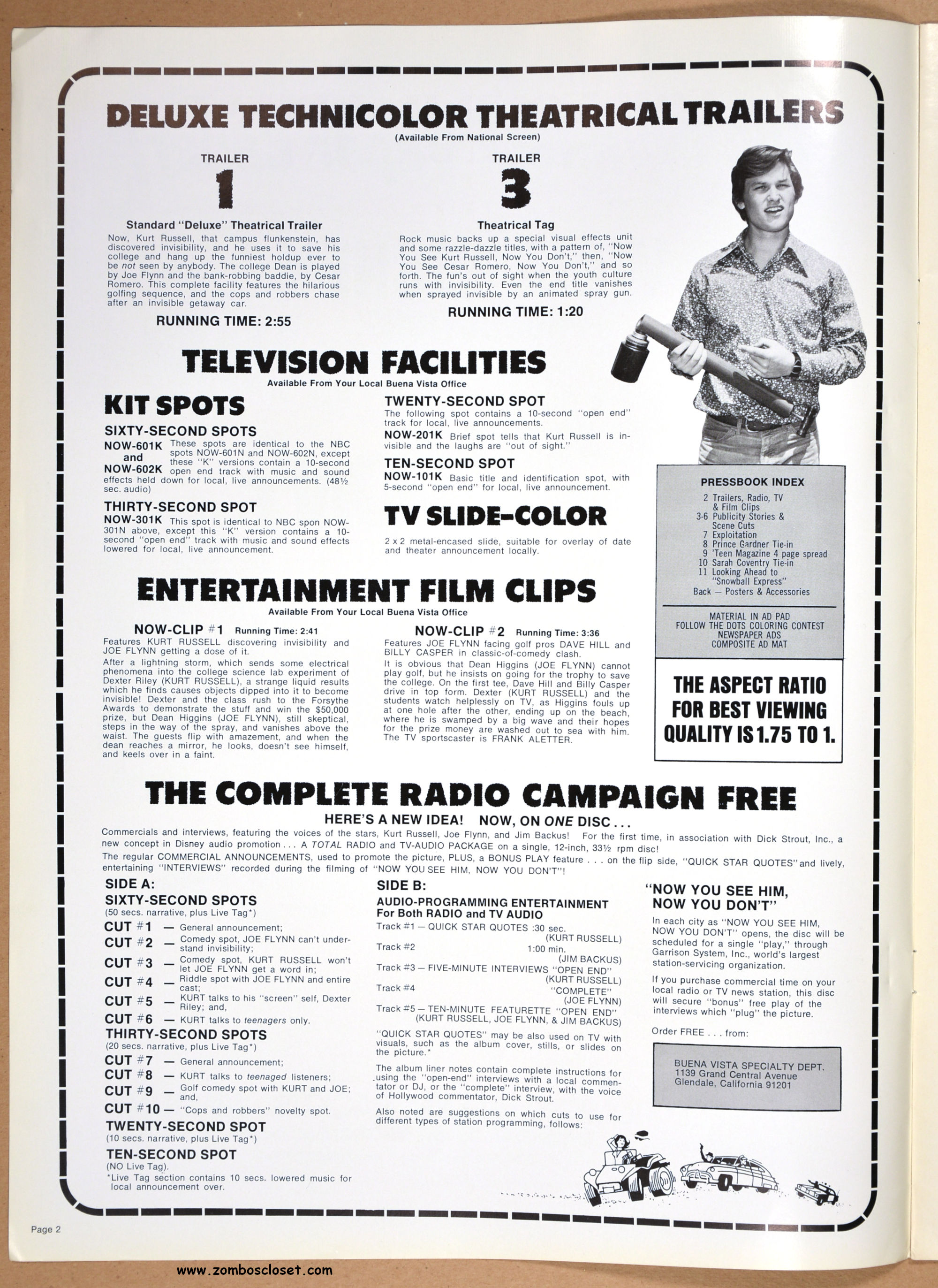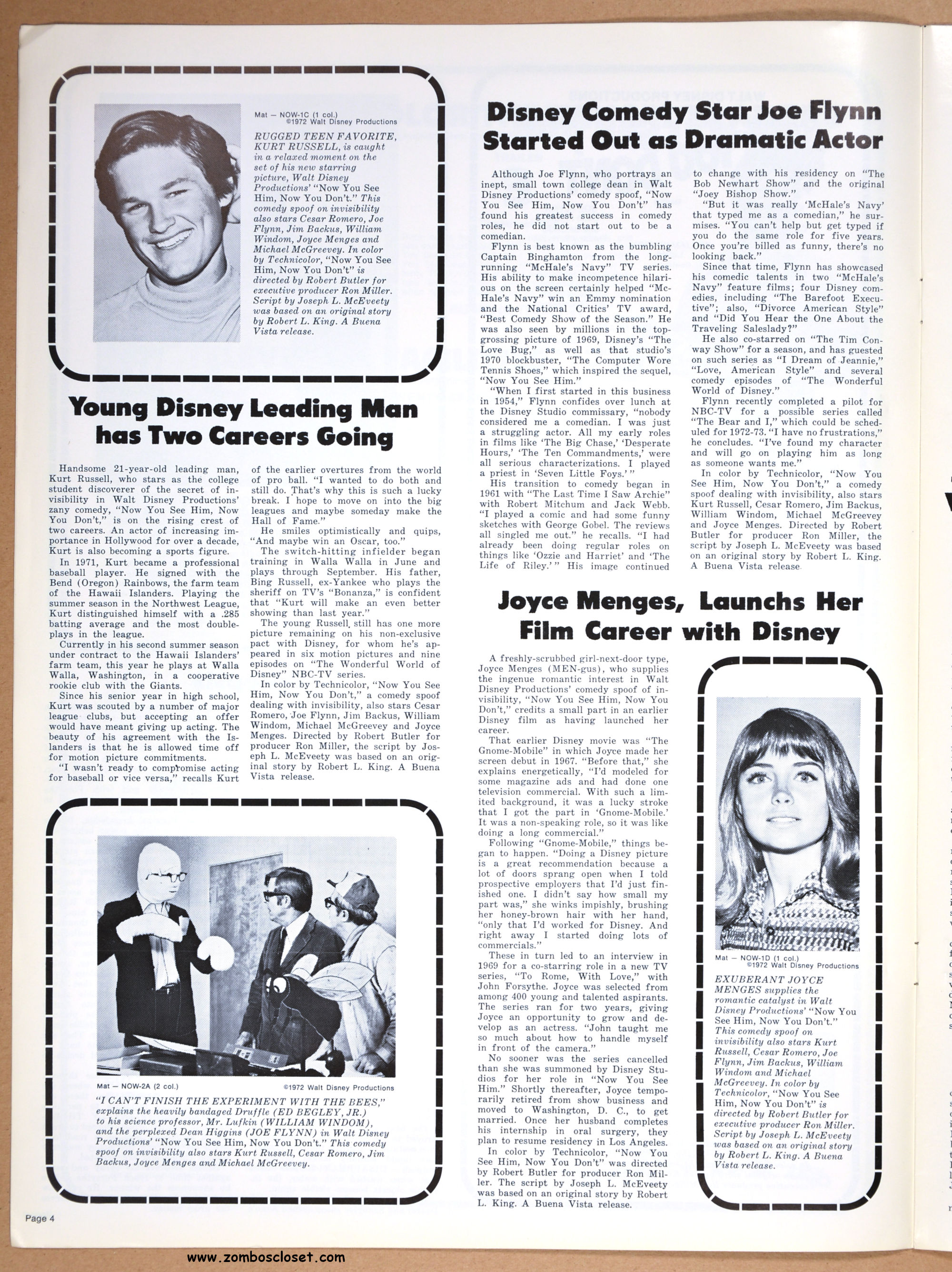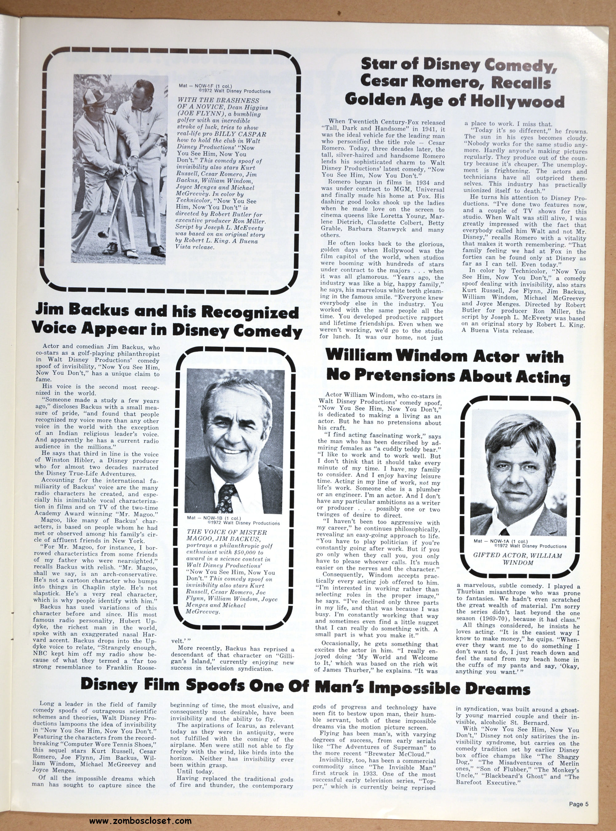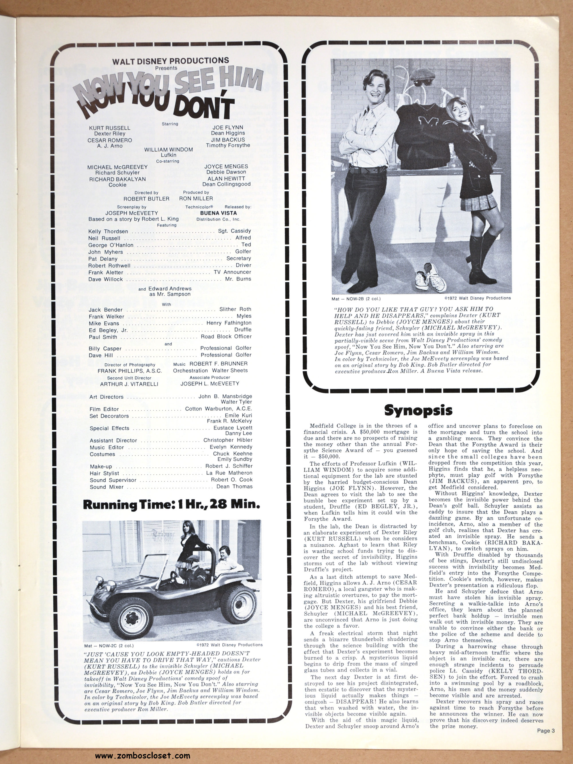 Wikipedia notes this is the first Disney movie to be shown on television in a two-hour time slot, in 1975. Previous movies were edited or shown in two one-hour time slots. As usual, Disney heaps on the tie-ins, from jewelry to wallets and purses, to the Dell comic book. There’s also a tie-in to ‘Teen magazine. A plus for the movie is all the memorable stars appearing in it like Kurt Russell, Jim Backus, William Windom, and Cesar Romero to name some of them. The New York Times reviewer, Howard Thompson, at the time, said to try the real McCoy and see the original The Invisible Man, although other critics were kinder.