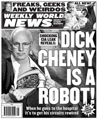 Max, yes the Weekly World News is meant to be bizarre and goofy, which is why it’s fun to read. But I must admit they hit the nail on the head with Cheney: he is a robot. I don’t know how they saw through that one.