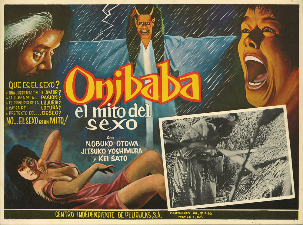 Note the el mito del sexo (the myth of the sex) angle pushed on the lobby card. A sexual theme runs through the movie, but it's impetus comes from conditions of dominance, predation, and desperation. Onibaba is a noirish tale of lingering evils that's creepy as hell.