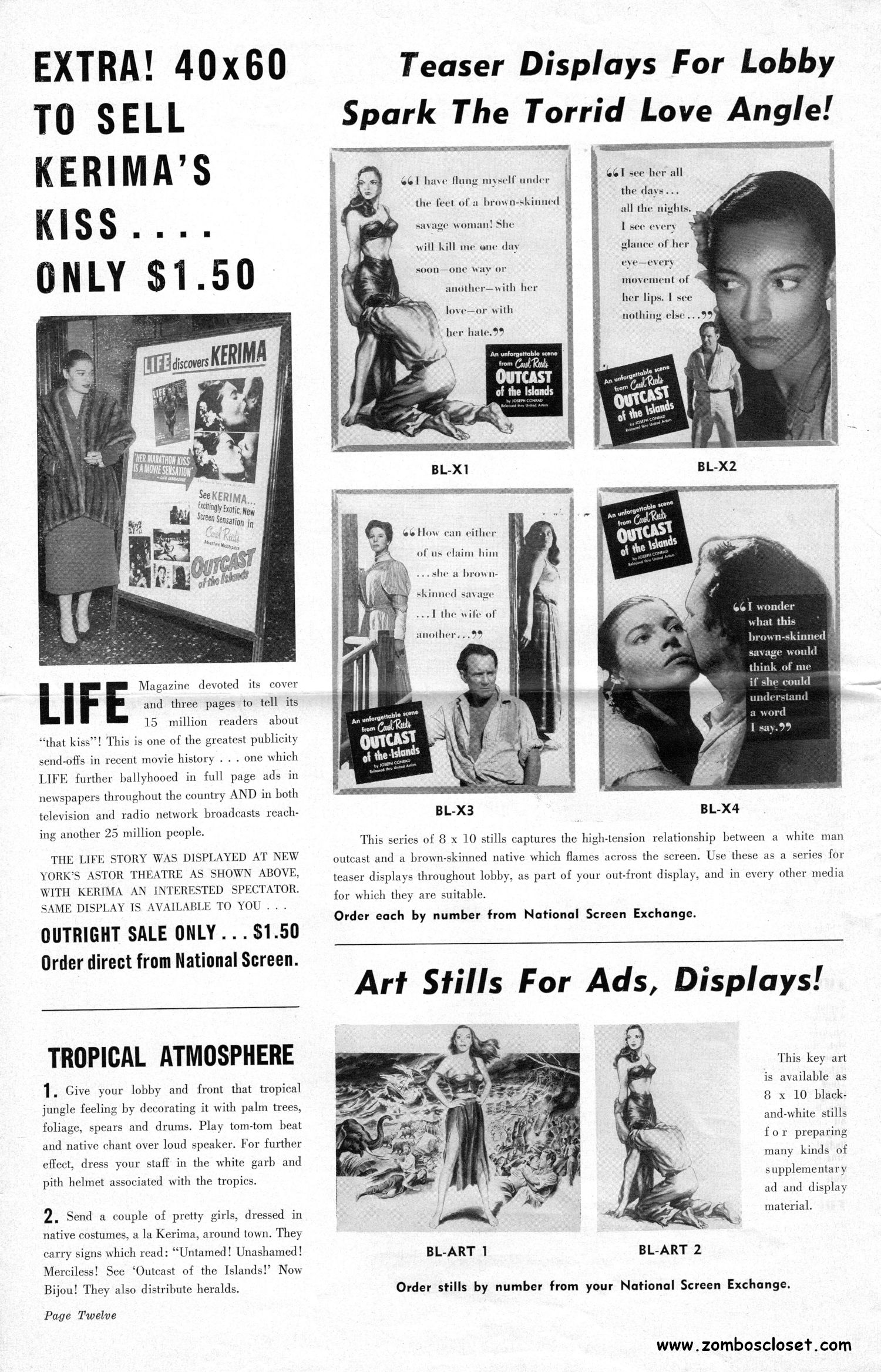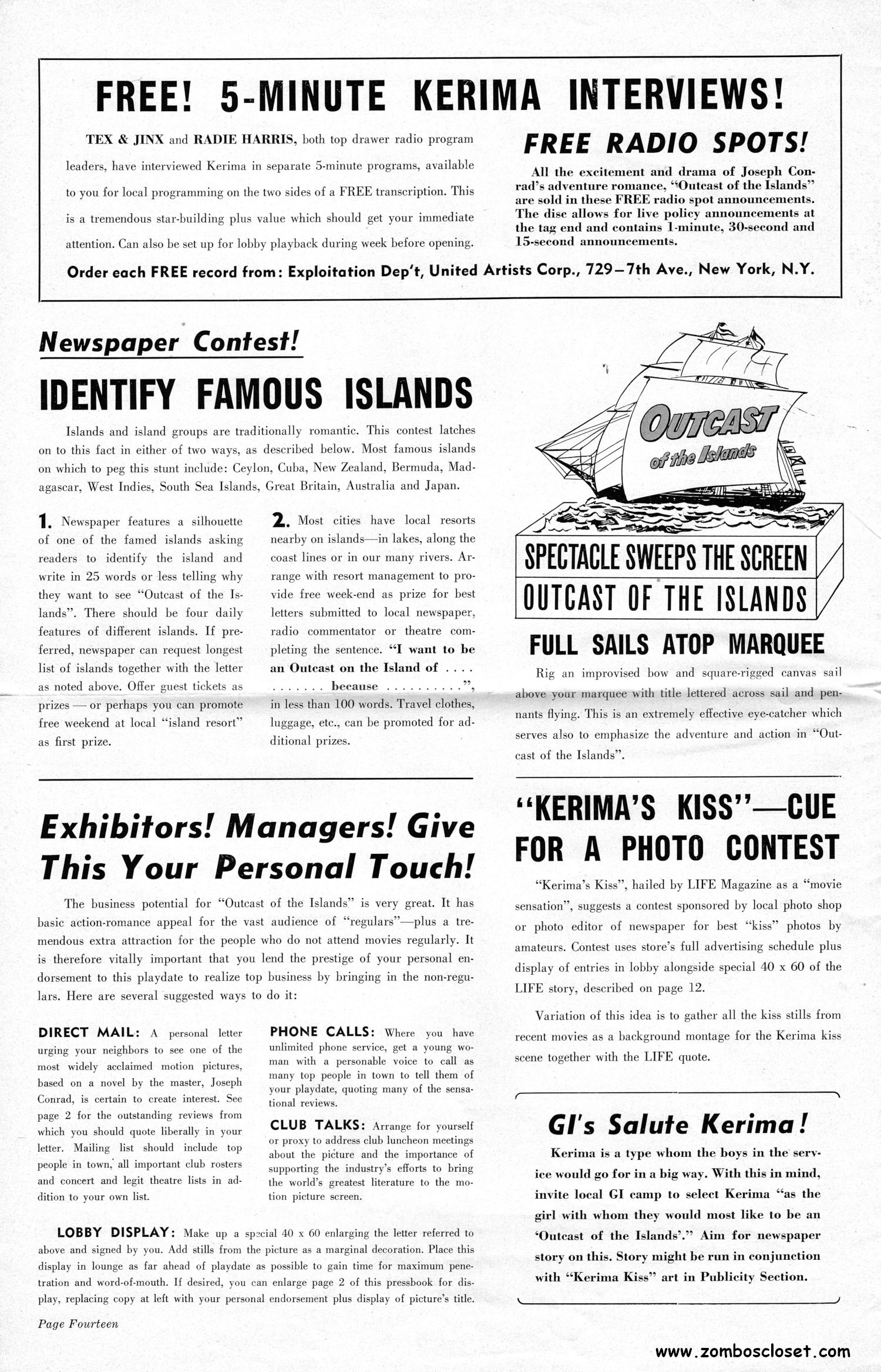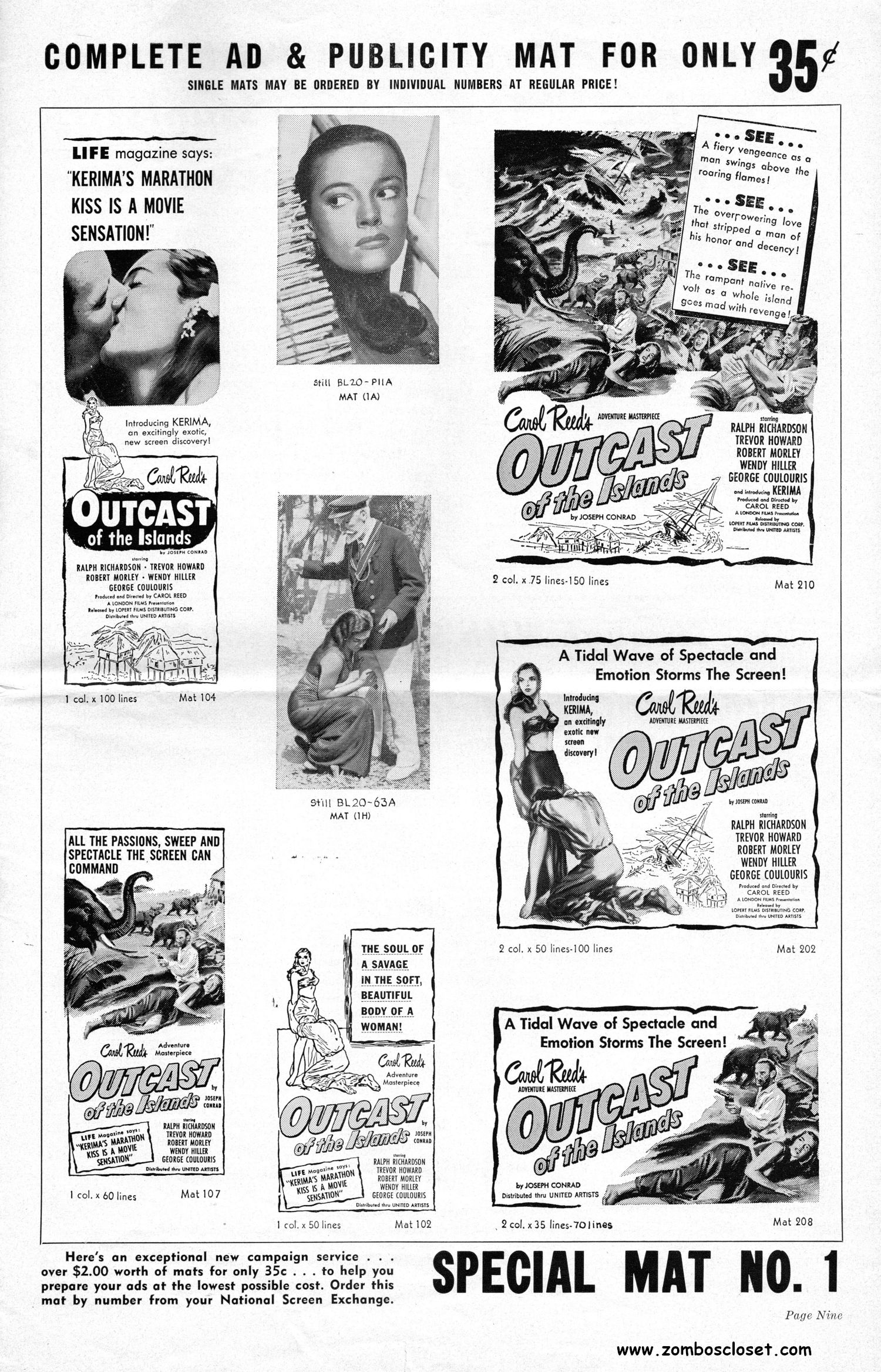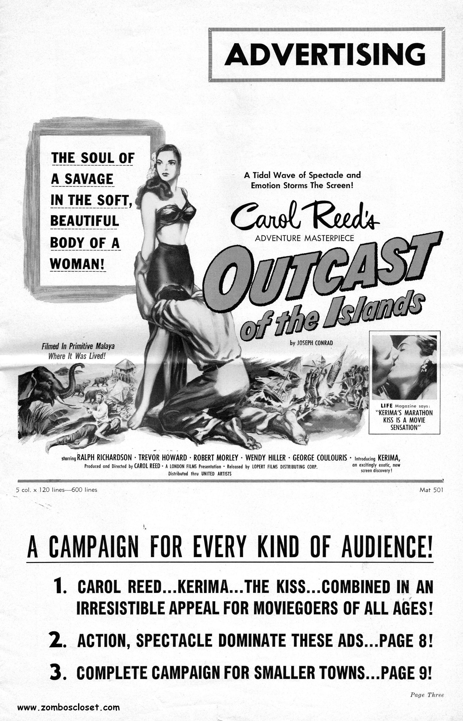 Dramatic poster art for Outcast of the Islands drew my attention to this pressbook. Looking at it, I find it interesting how some movies played up the exotic woman (here it's Kerima) in the tropical/jungle milieu, until the 1950s, in the horror and adventure genres; one of all image, no substance. Now, of course, there were the femme fatales in noir, and the standout movie starlets, but they stood apart from the pretty-cardboard women with an air of tropical mystery and vexing perfection like Kerima, Acquanetta, and Kathleen Burke (Panther Woman in Island of Lost Souls). Noteworthy in this pressbook is the use of the "MASS audiences and CLASS audiences are flocking to see…" promotion line. I don't recall seeing another blatant (although, let's face it, an inherent presumption for any movie) spelling-out of the makeup of the audience theaters should have expected to get for Outcast.