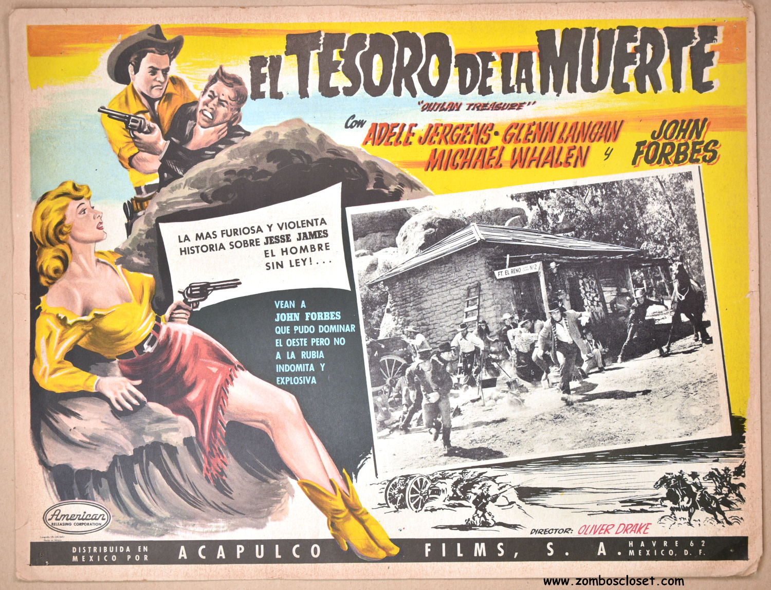 Lively colors, bared shoulder with a little bit more, and a rough and tumble wrestle with guns drawn. What more can you want from a rip roarin' western movie? Or lobby card? Although I doubt the seductive skin baring in this lobby card ever made it into the movie.