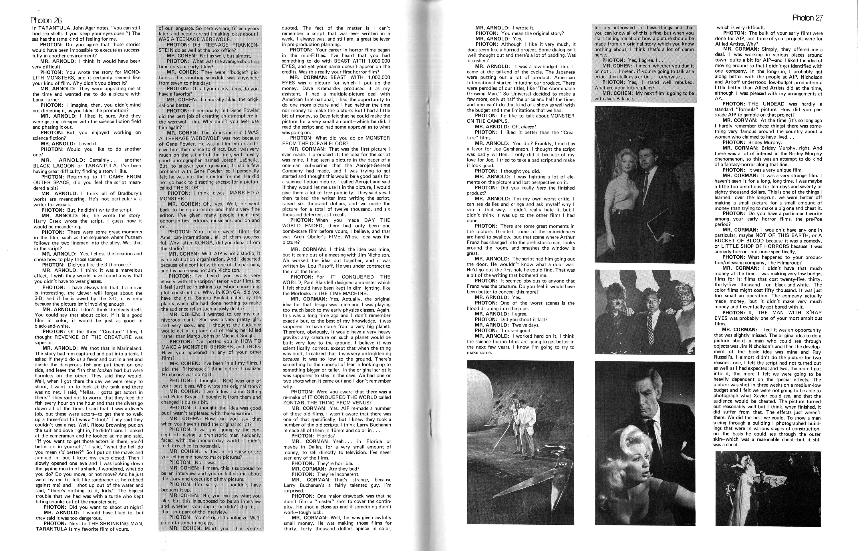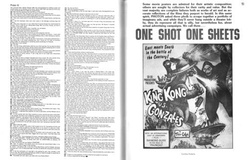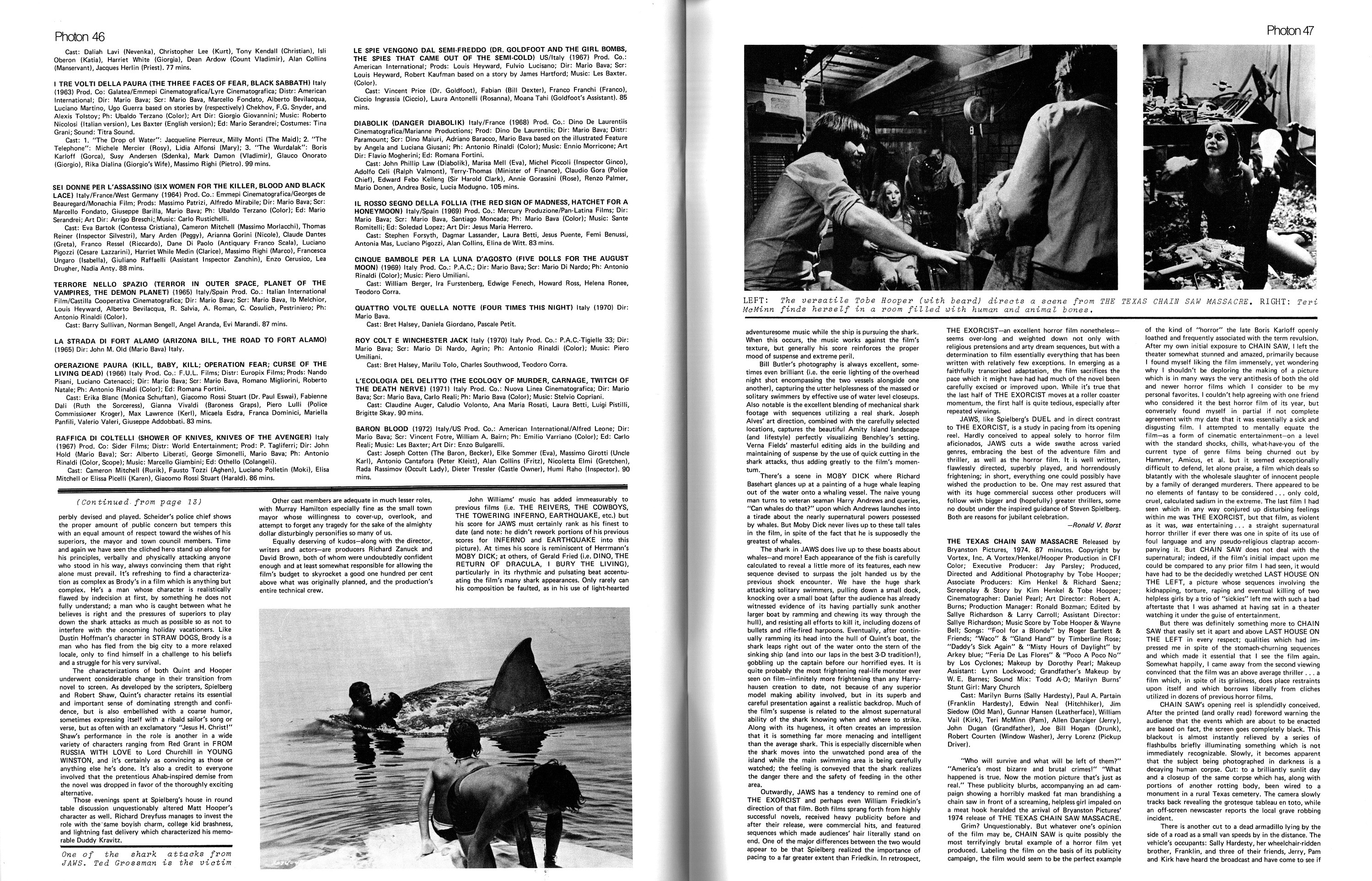 It's in the trees! This issue of Photon, number 26, is chock full of Curse of the Demon goodness, courtesy of Ron Borst and Scot Mac Queen. (Download the comic book reader file for Photon Issue 26 if you're so inclined–43MB.) This fantastique- movie fanzine of the 1970s went short on graphics and long on the written word. An impressive array of talent contributed informative articles every issue. Also in this issue, Bill Warren heaps praise on Phantom of the Paradise (and boy, he doesn't heap praise often), and Mario Bava's Illusion of Reality is explored by Alain Silver and Jame Ursini. Unlike many monster magazines of the day that would provide a quick read, Mark Franks' Photon required you set aside a week or so. So put the coffee on and enjoy.