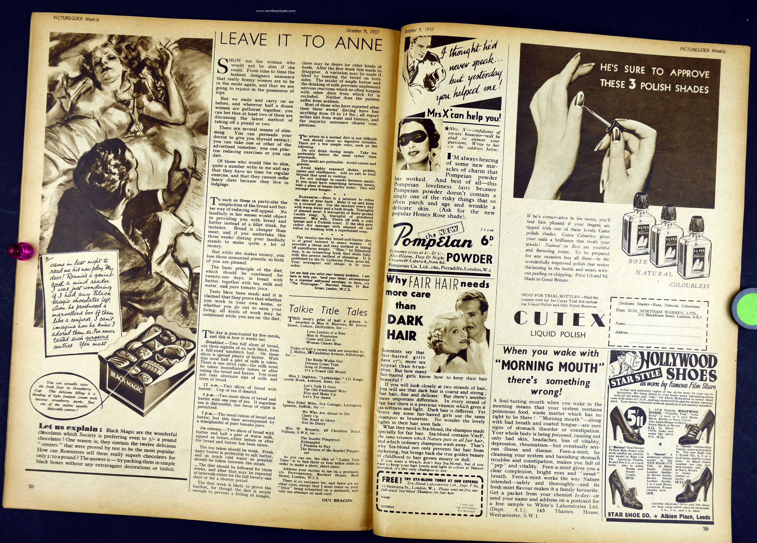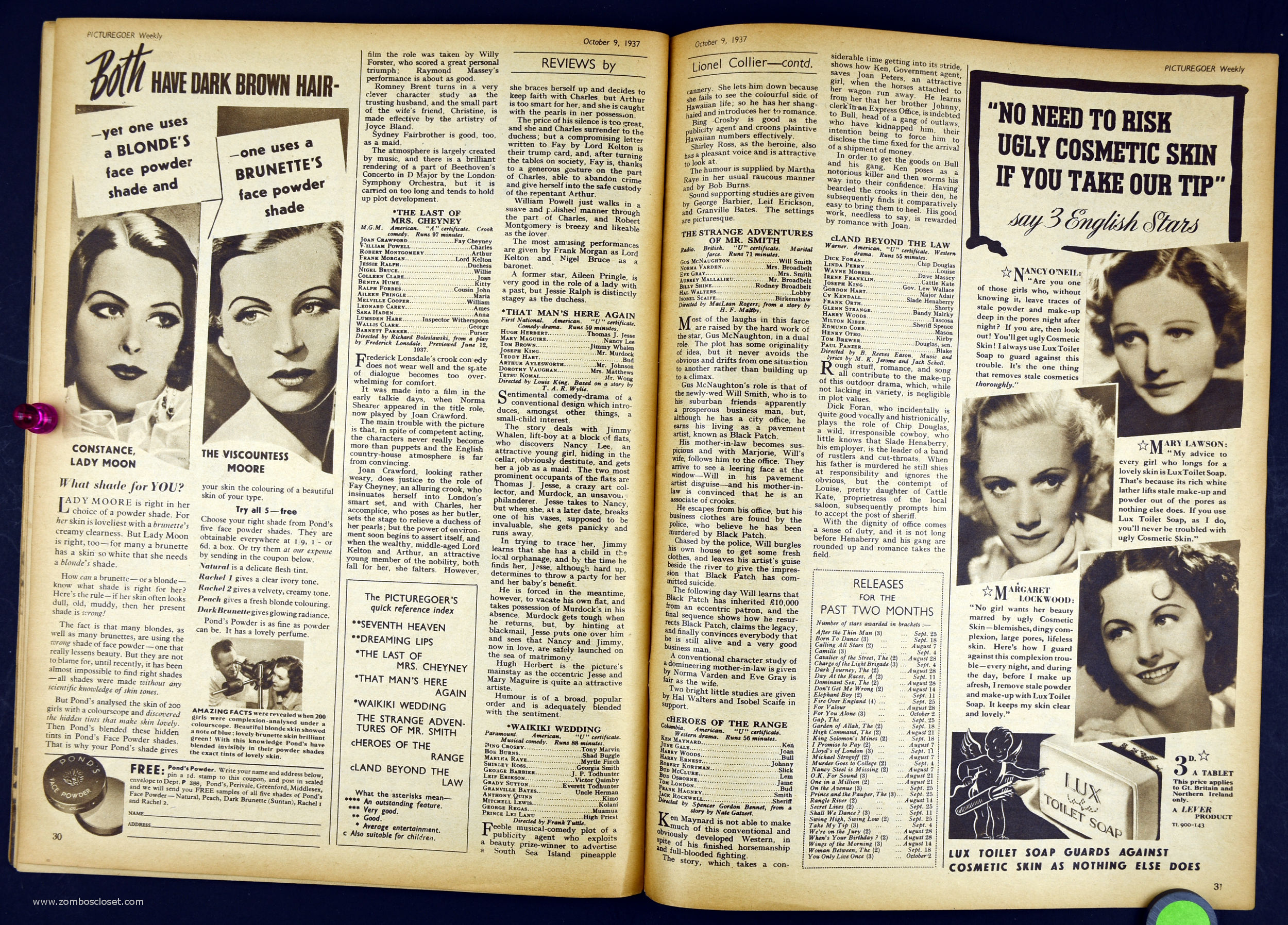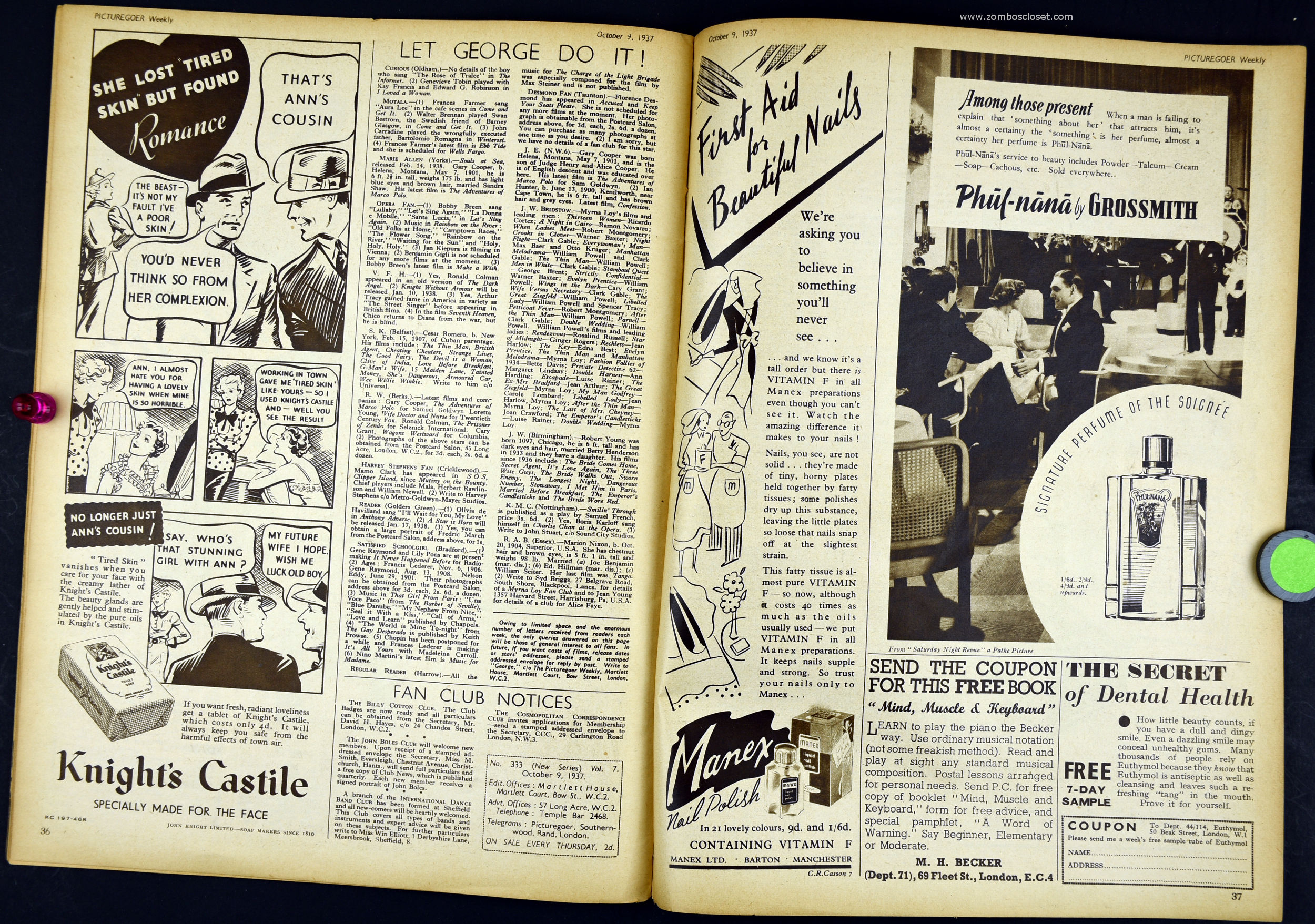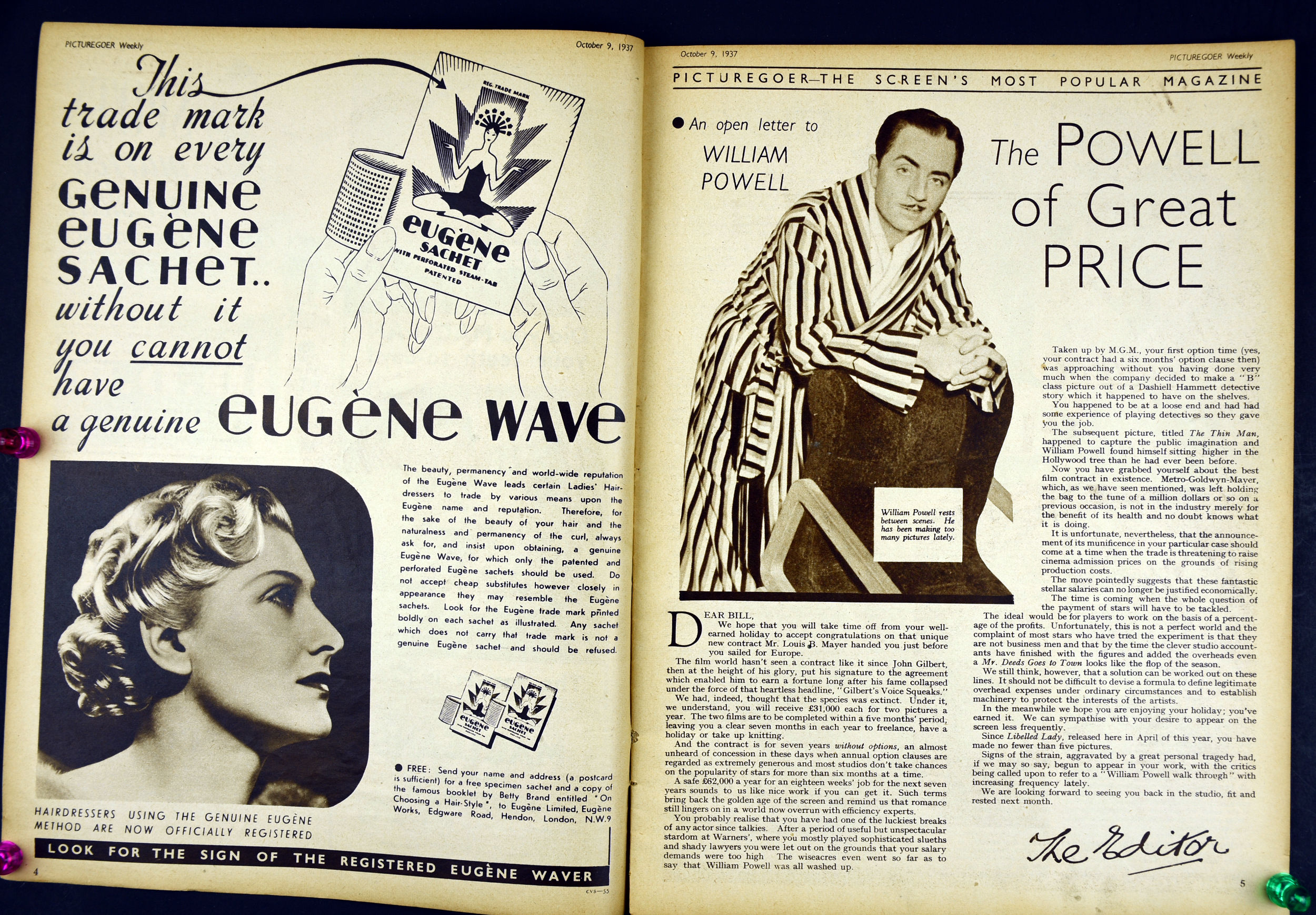 Here's another issue of Picturegoer magazine, courtesy of Professor Kinema. In this issue, No. 333 from 1937, the standouts are: nifty period advertisements; an open letter to actor William Powell, from the editor, congratulating him on his lucrative film contract while condemning the increase in movie theater ticket prices; Max Breen lauds over Maureen O'Sullivan; women dare challenge the pants-wearing in Men Wear the Pants in Pictureland; and Leave It to Anne explains how to keep that slim Hollywood figure the starlets have.