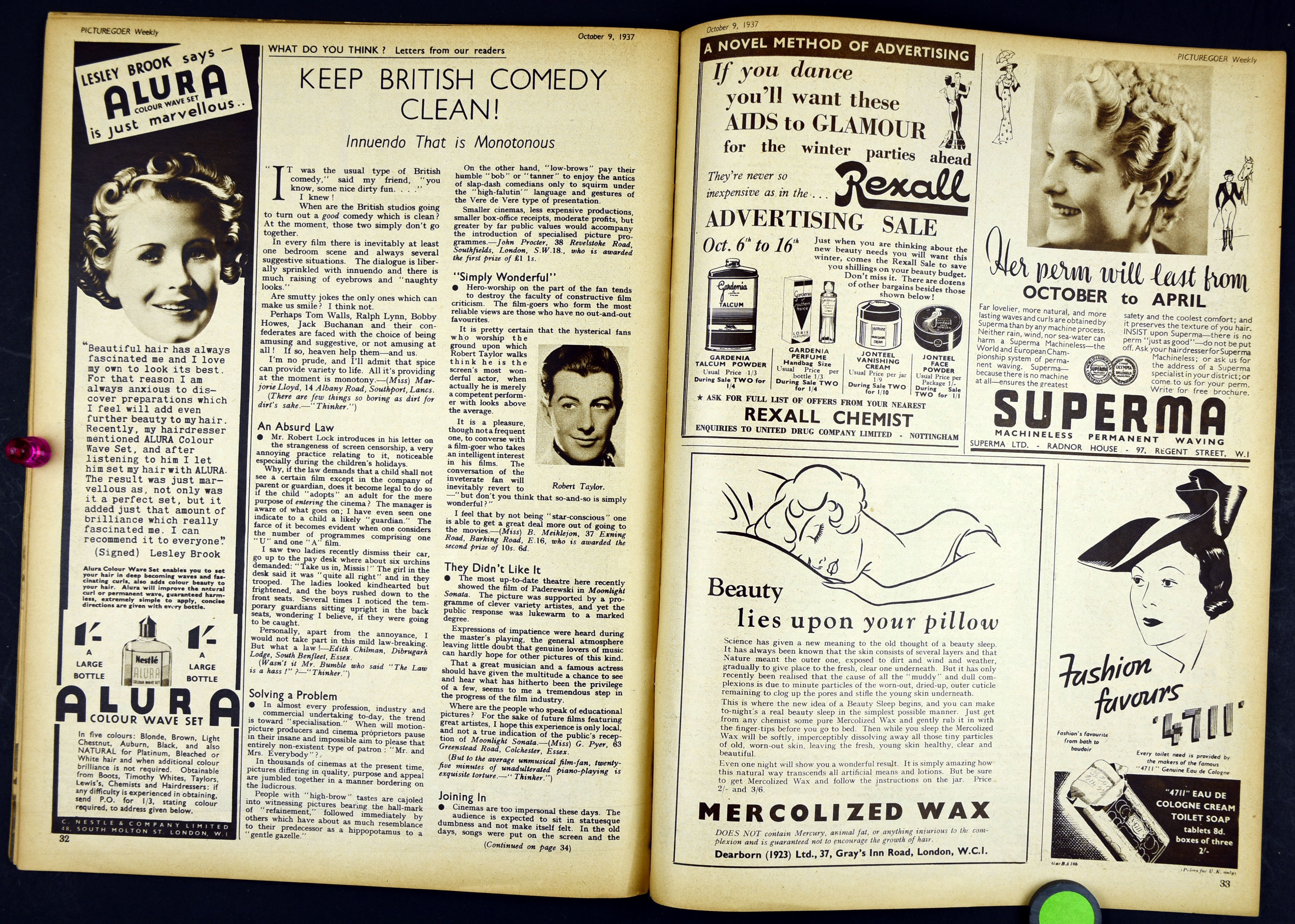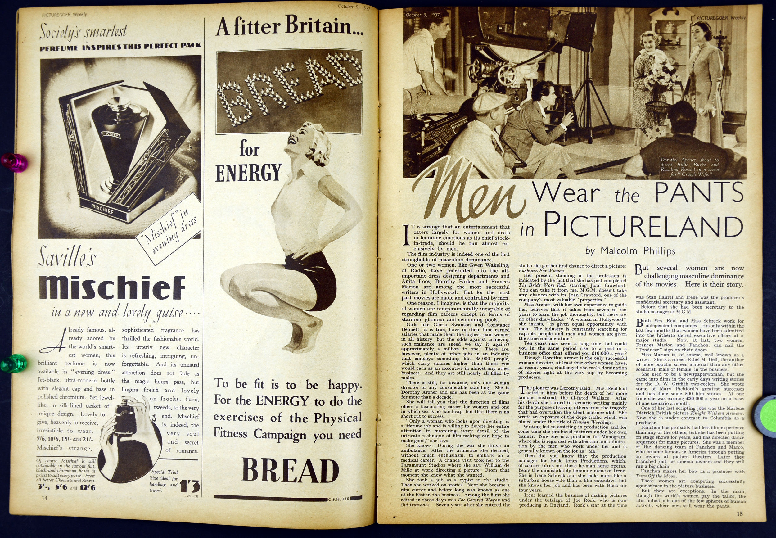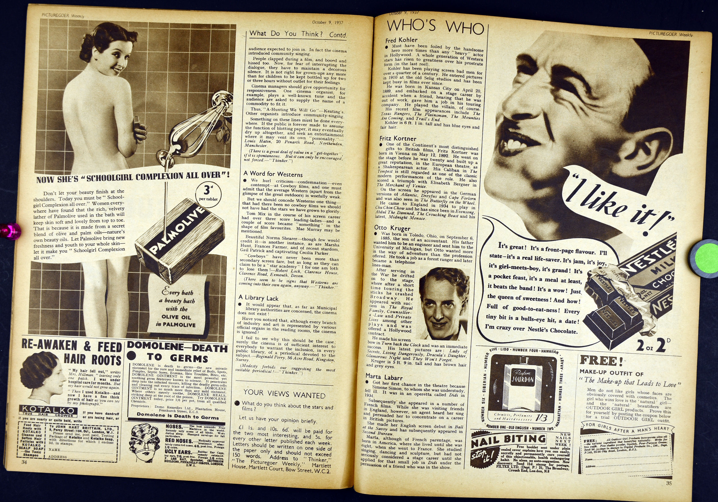 Here's another issue of Picturegoer magazine, courtesy of Professor Kinema. In this issue, No. 333 from 1937, the standouts are: nifty period advertisements; an open letter to actor William Powell, from the editor, congratulating him on his lucrative film contract while condemning the increase in movie theater ticket prices; Max Breen lauds over Maureen O'Sullivan; women dare challenge the pants-wearing in Men Wear the Pants in Pictureland; and Leave It to Anne explains how to keep that slim Hollywood figure the starlets have.