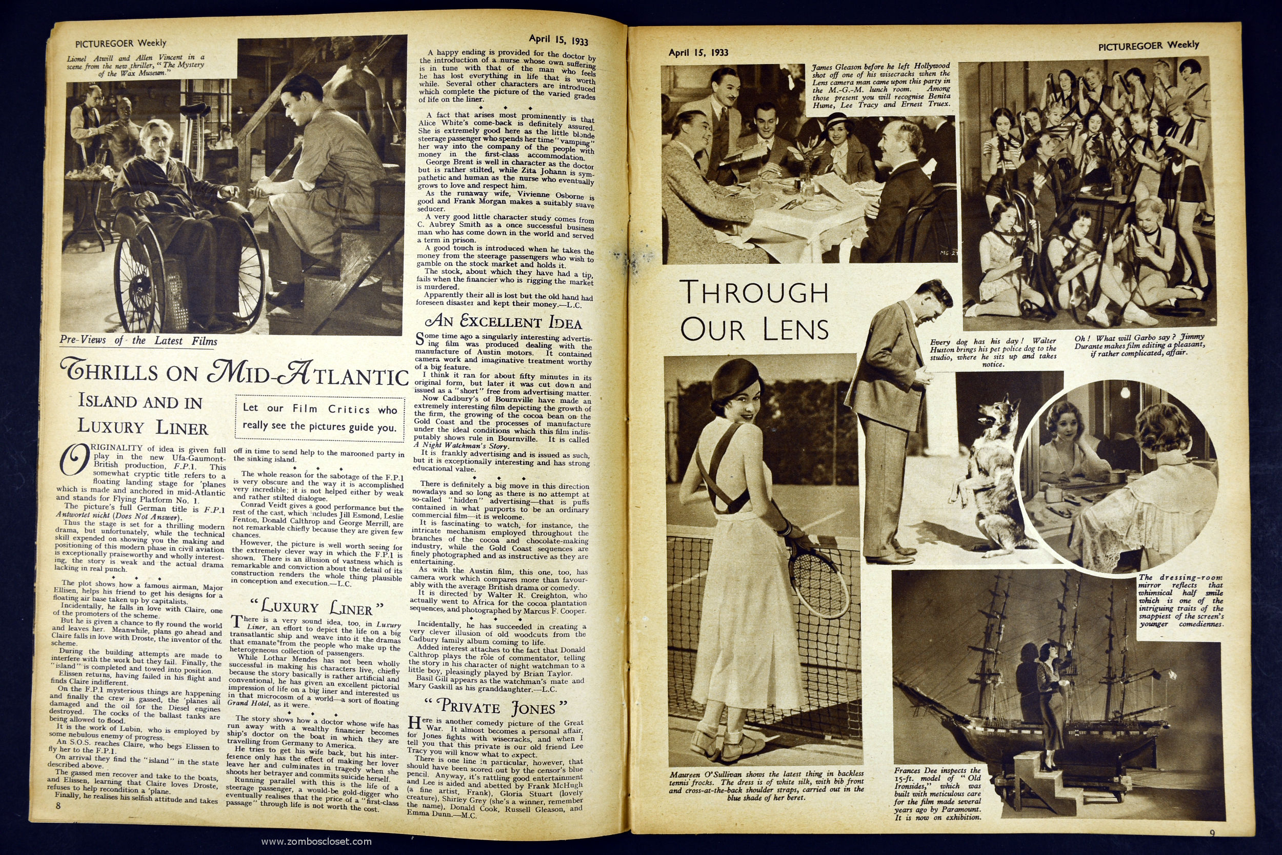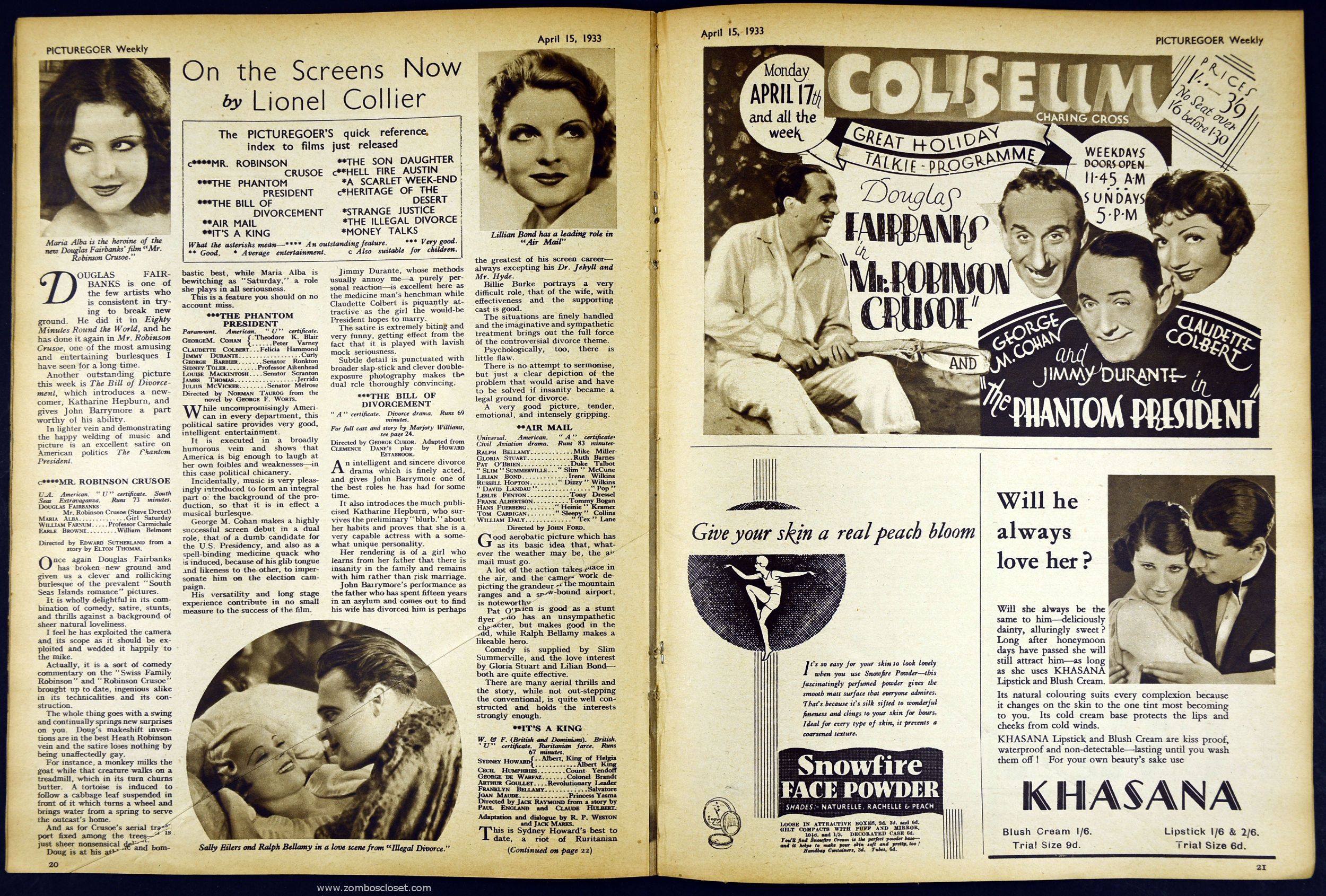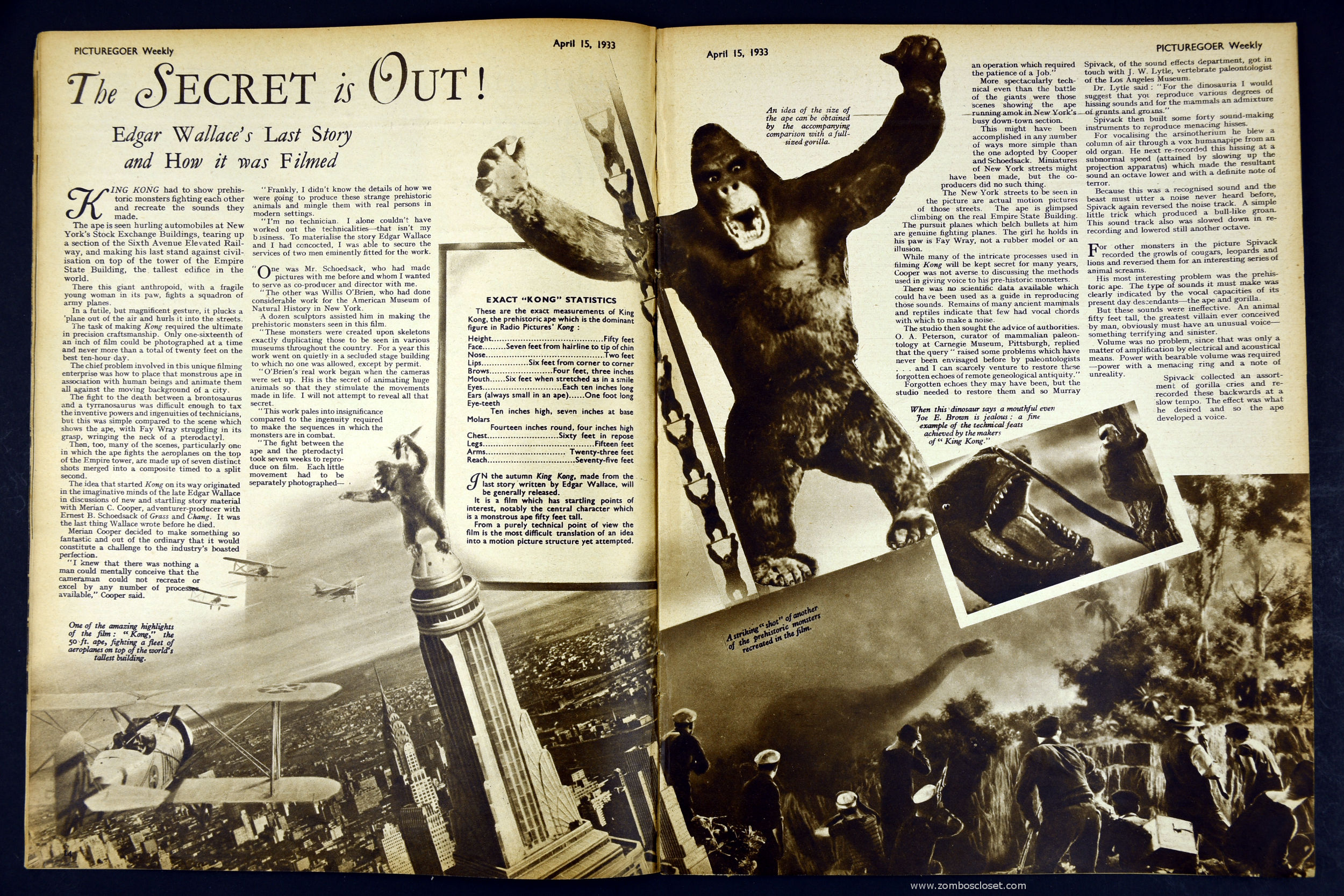 Courtesy of Professor Kinema's Archives comes this 1933 issue of the British Picturegoer magazine. Aside from the fun of seeing the period ads and getting a glimpse of Hollywood glamour circa 1933, of particular interest to readers of From Zombos' Closet are pages 14 and 15. Did you know that King Kong stood 50 feet high? Or that each of his eyes was 10 inches long?