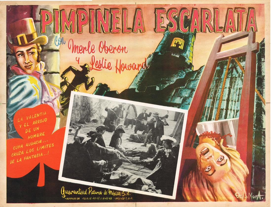 From Professor Kinema's collection comes this lurid, action-filled Mexican lobby card for The Scarlet Pimpernel. The American poster artwork is noticeably more staid and I don't recall a quillotine lopping off anyone's head being prominently touted in any of it. Of interest, the artist signed his work, appropriately enough, "Dela Mort."