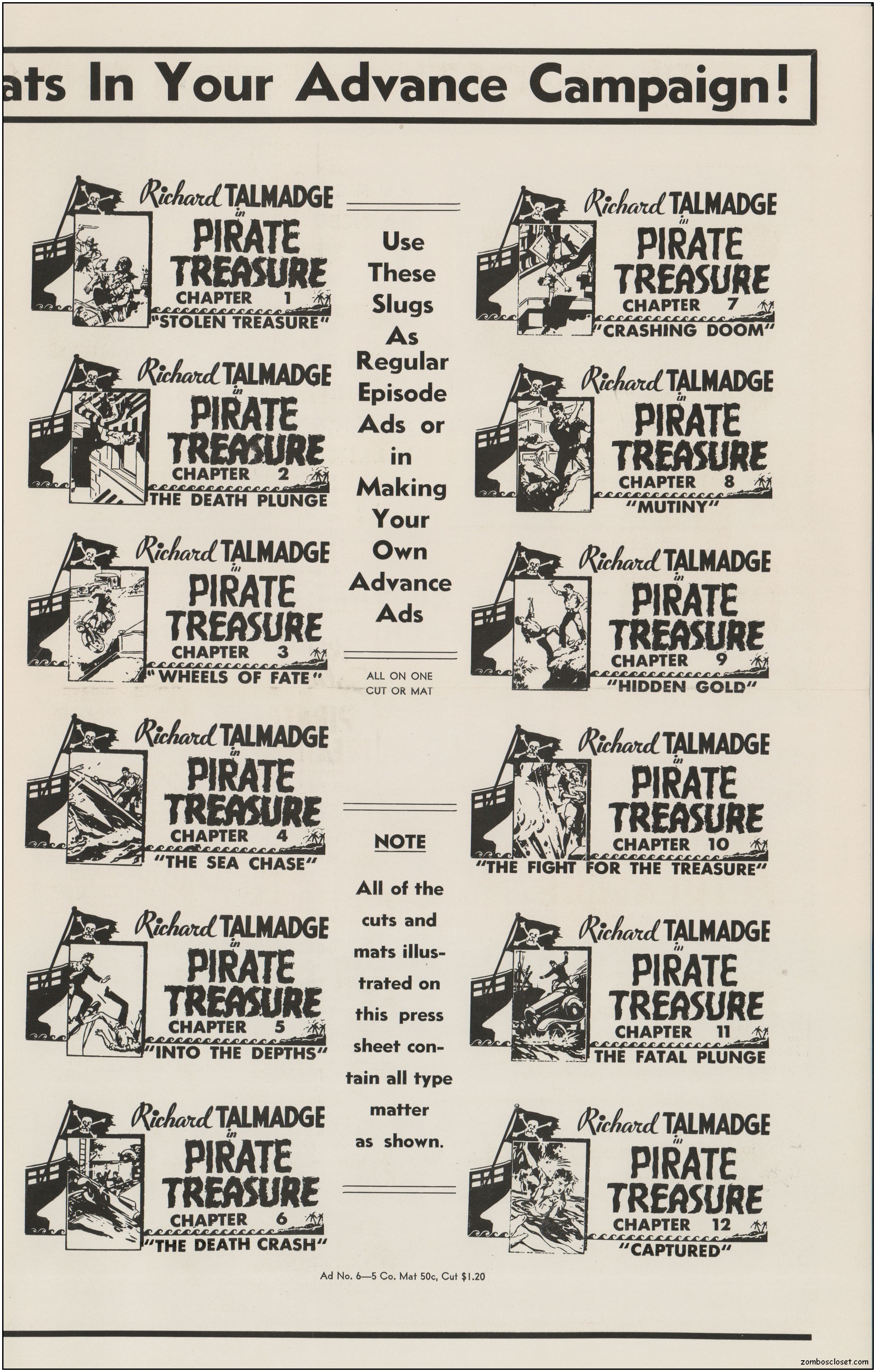 What drew my eye to this pressbook for Pirate Treasure, Universal’s swashbuckling movie serial, was the showmanship page. From lobby stunts, pirate coloring competition, pirate mask and hat, pirate treasure bags, heralds, hangers, and more, it’s a splash of thrills. The stunt work in this serial is noted as stellar too. Yo ho ho!