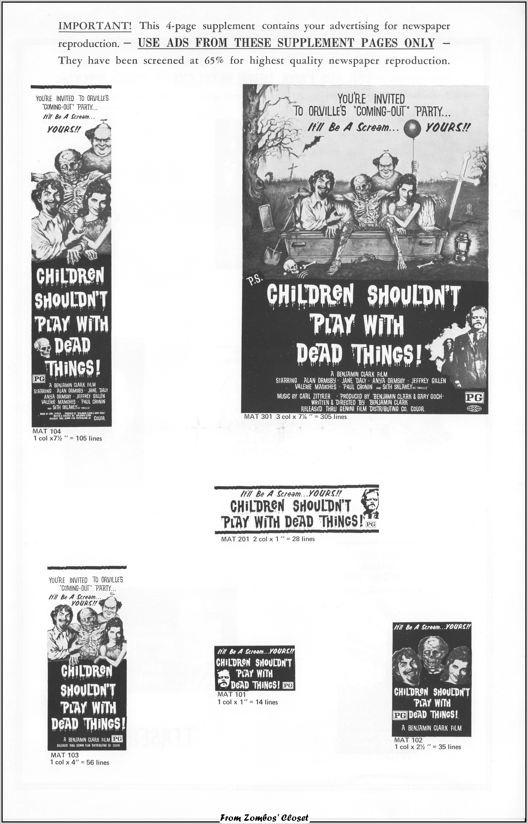 When you think of VHS, this one definitely comes to mind (for those of us who still think of VHS, that is). Alternate titles for Children Shouldn’t Play With Dead Things were Zreaks, Things from the Dead, Things from the Grave, and Revenge of the Living Dead. In Germany it was called Cemetery of the Dead, in Finland, Älä leiki kuolleilla, in Portugal, As Crianças Não Devem Brincar Com Coisas Mortas. Some trivia for you courtesy of IMDb: the names on the tombstones in the film are those of the crew members; they were made out of styrofoam (the tombstones, not the crew members). The film’s script was written in ten days (yes, I believe that).