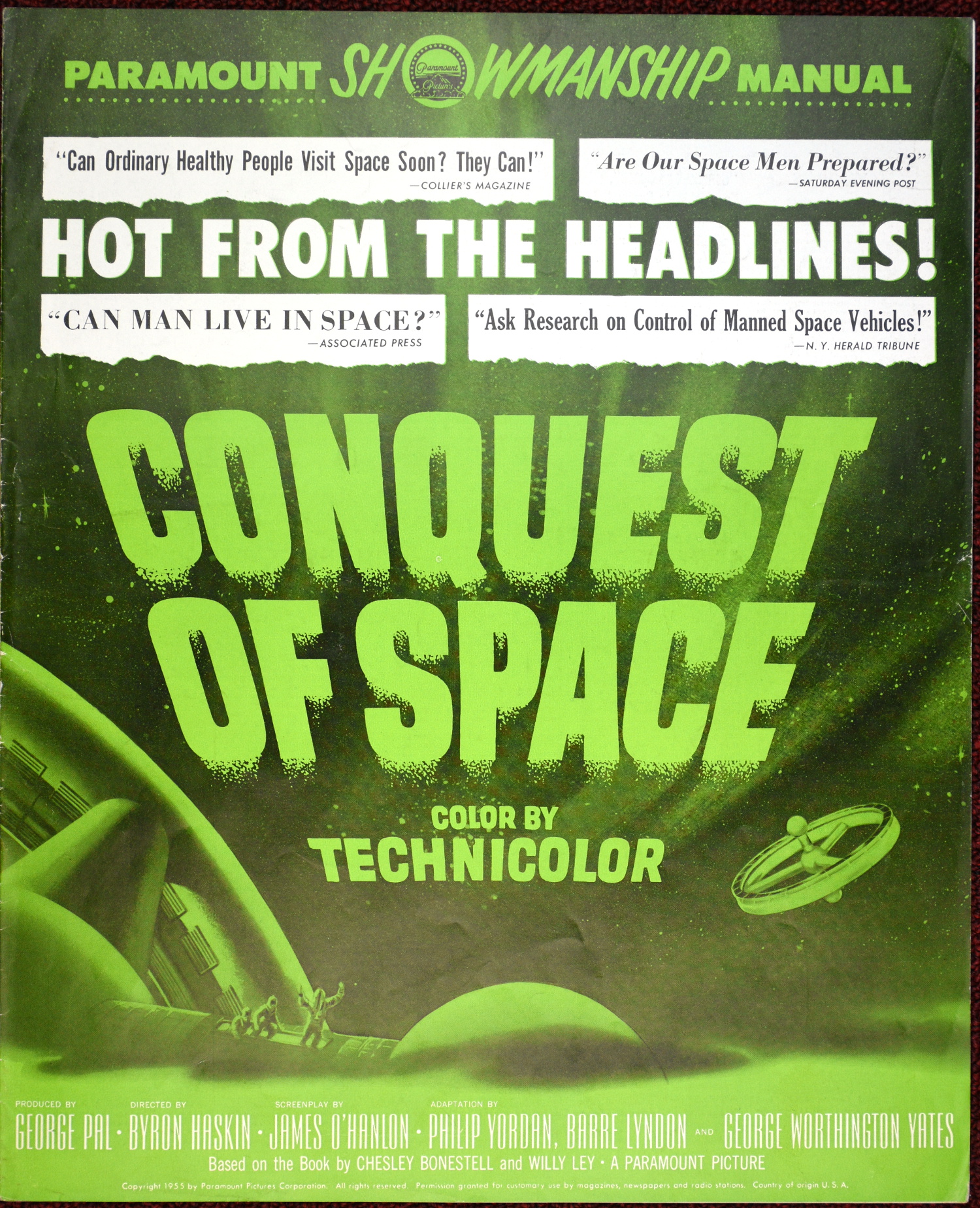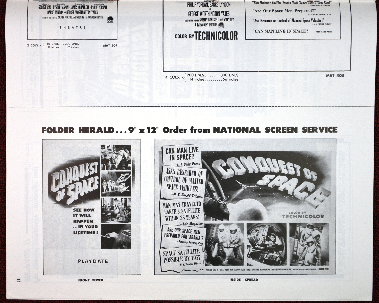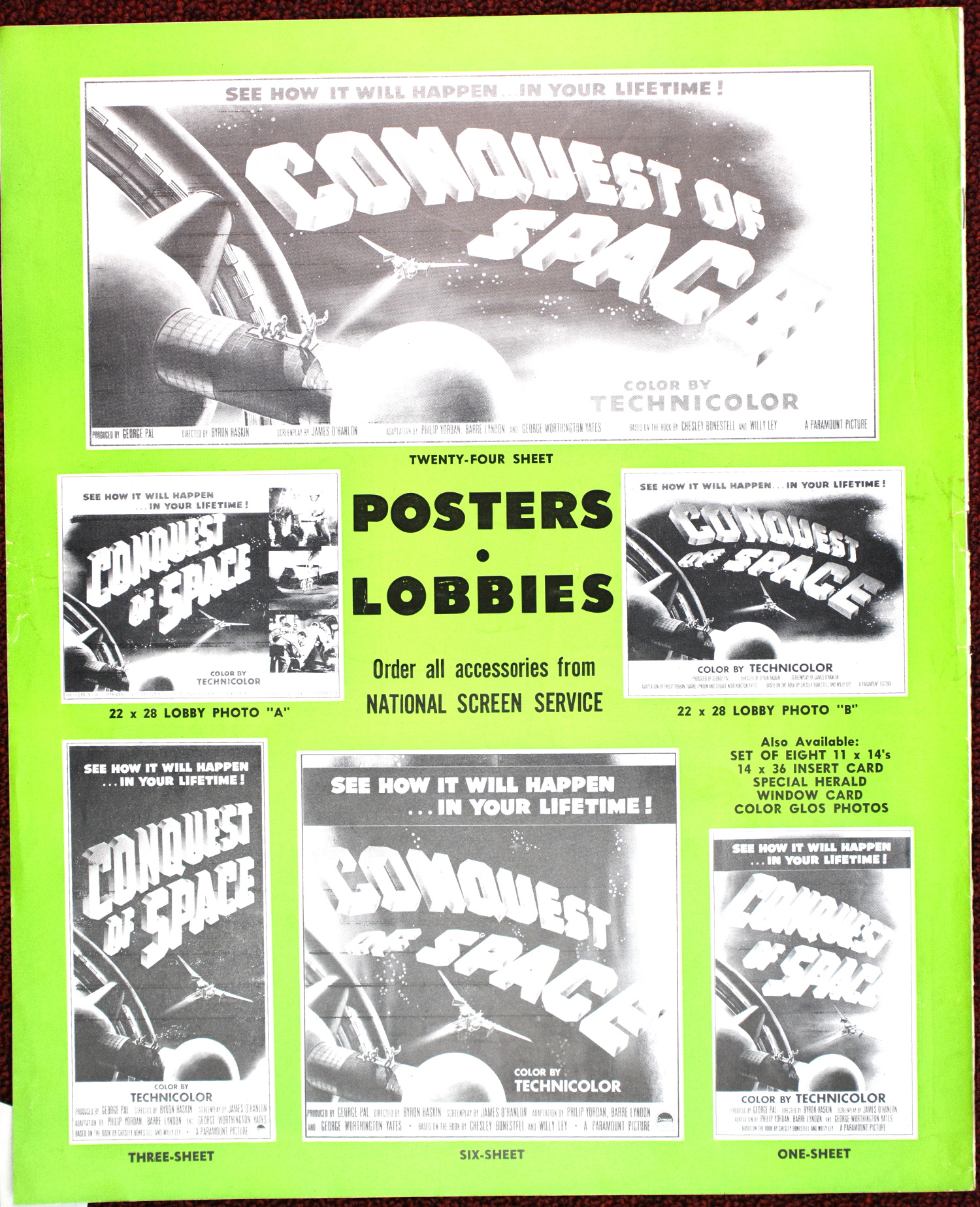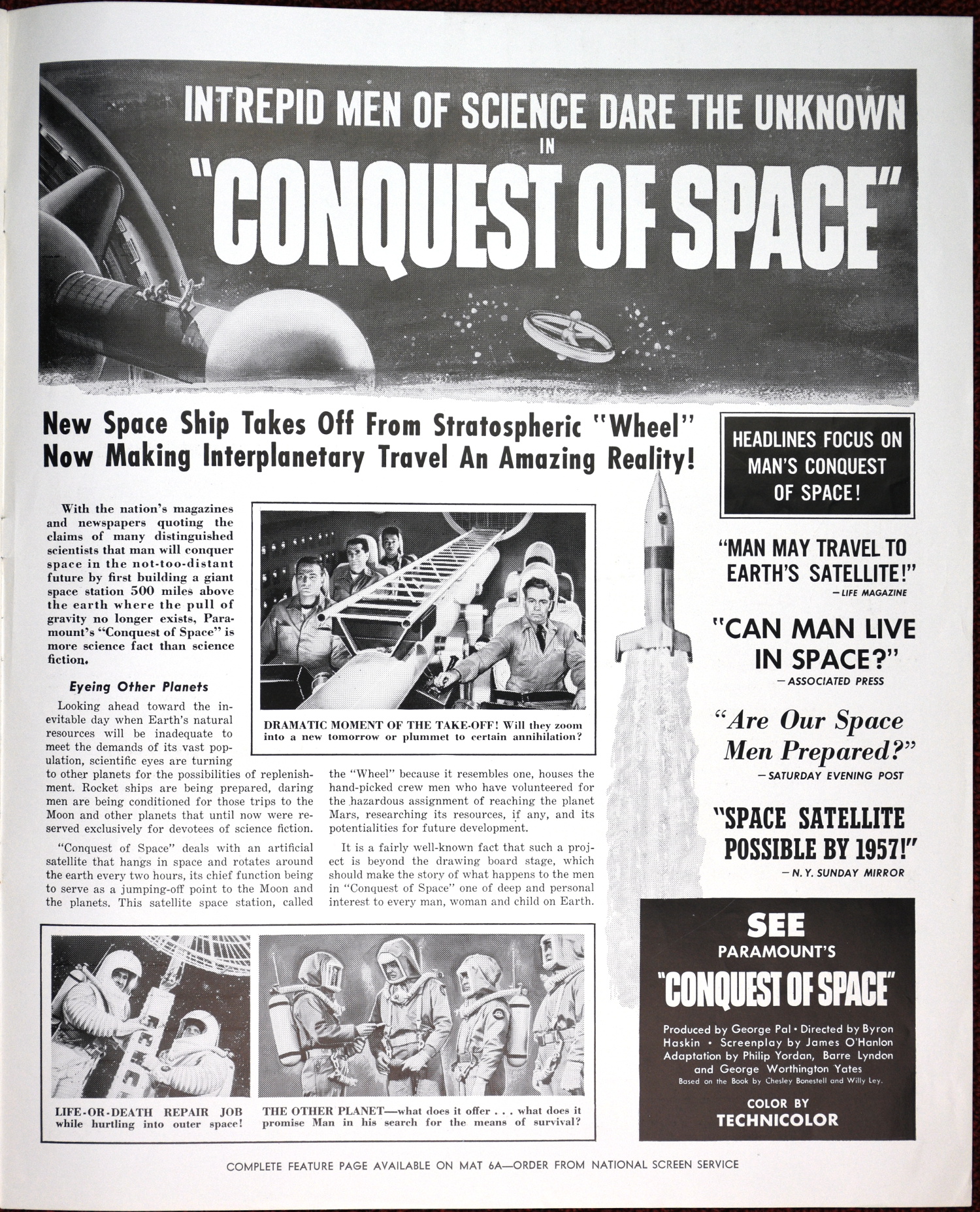 The fascination with outer space exploration and interplanetary travel (and evil aliens) fueled a lot of 1950s science fiction cinema. Usually it was either the after effects of space travel causing more harm than anticipated (the Quatermass Xperiment: The Creeping Unknown is a good example), or it was finding out that once you got to where you were going, monstrous alien monsters (I'm open to a better term if you've got one) wanted to eat you or do other nasty things (like in The Angry Red Planet). Then, of course, you had George Pal insisting on giving us movies that focused on the more positive and challenging aspects of space exploration. He even insisted on adding as much scientifically accurate information (at least what was known back then) as possible. Wild, right? Here's the pressbook for George Pal's Conquest of Space.
