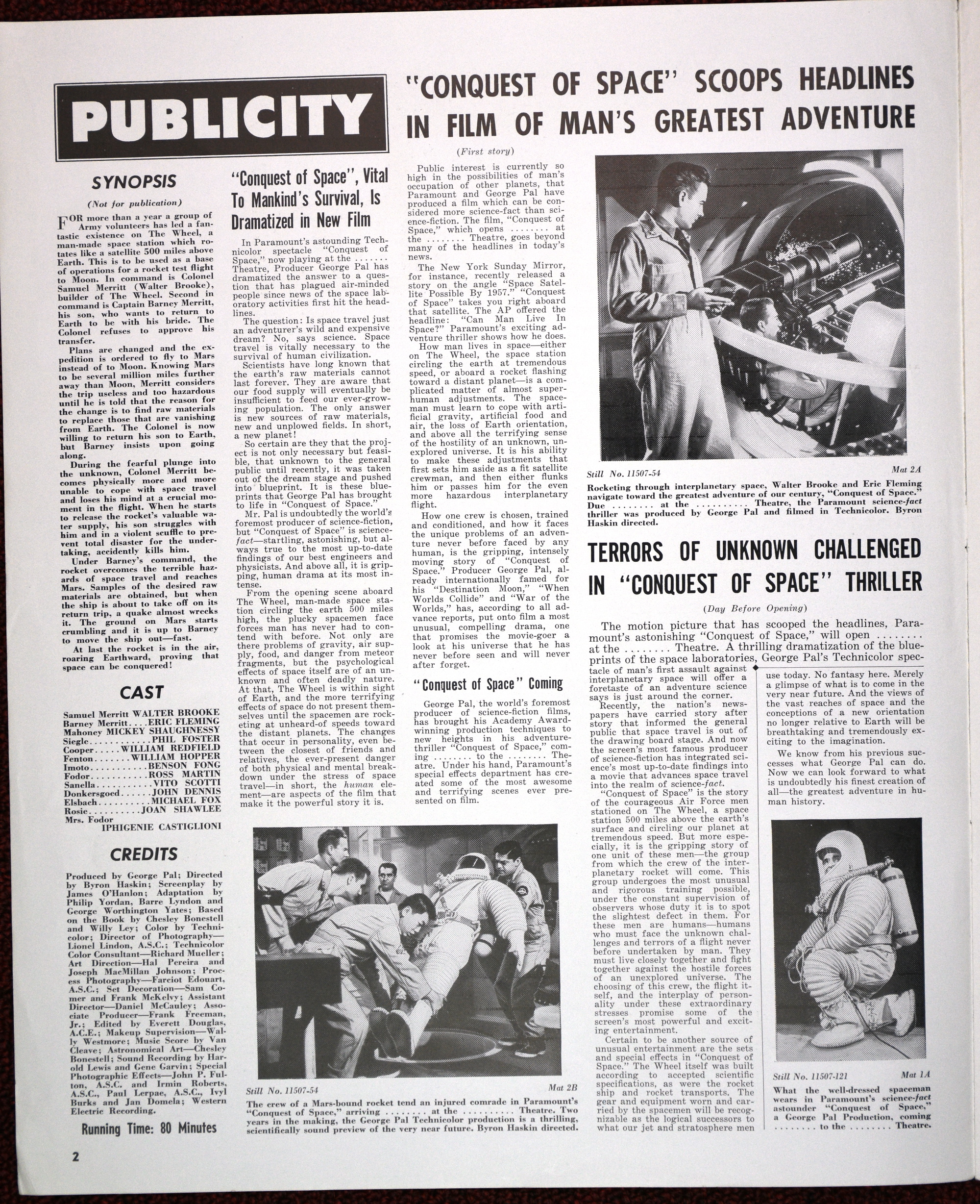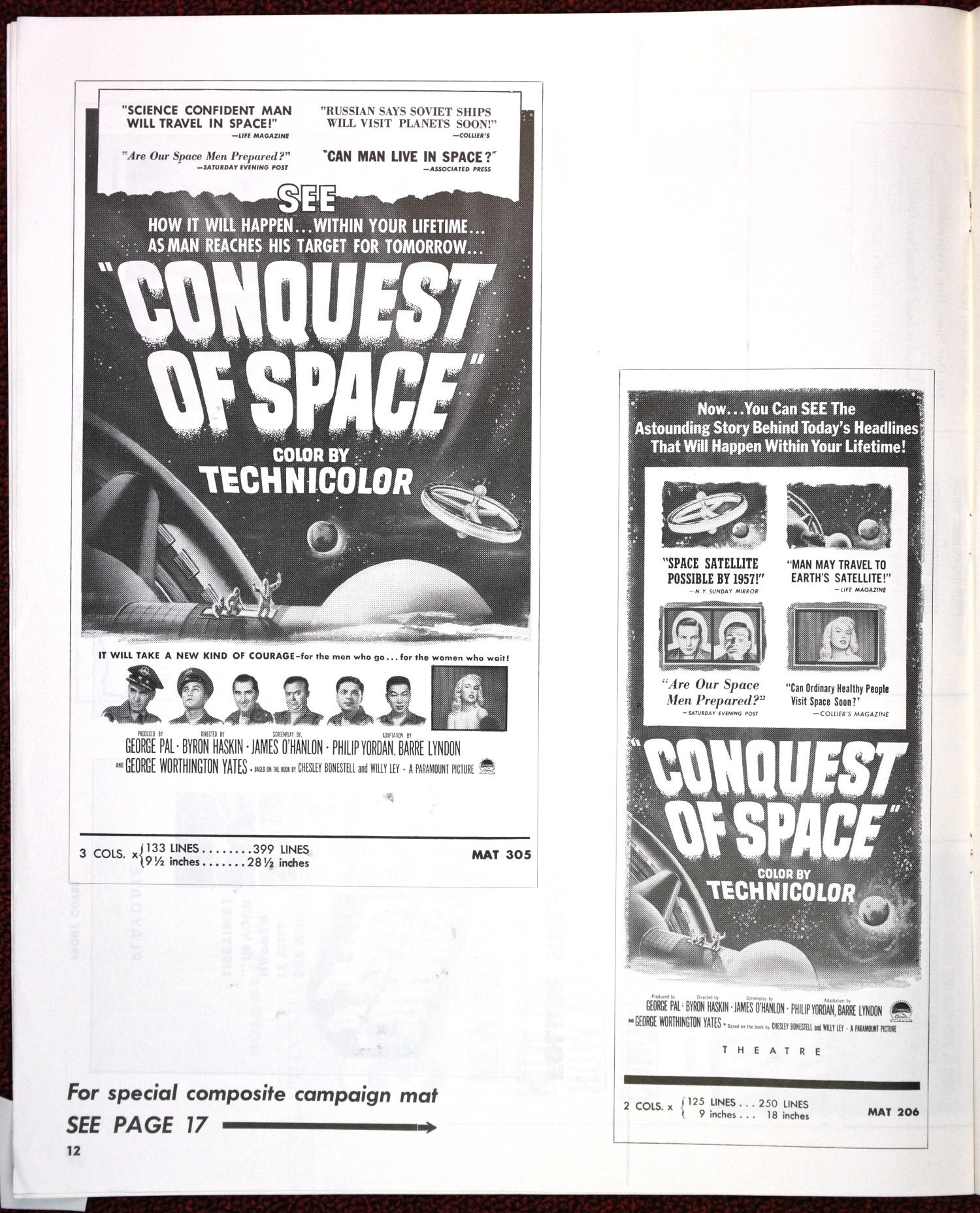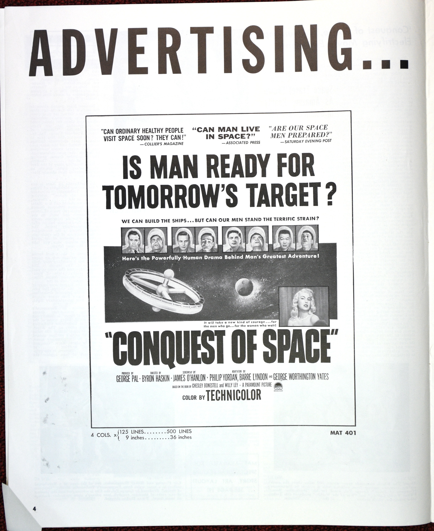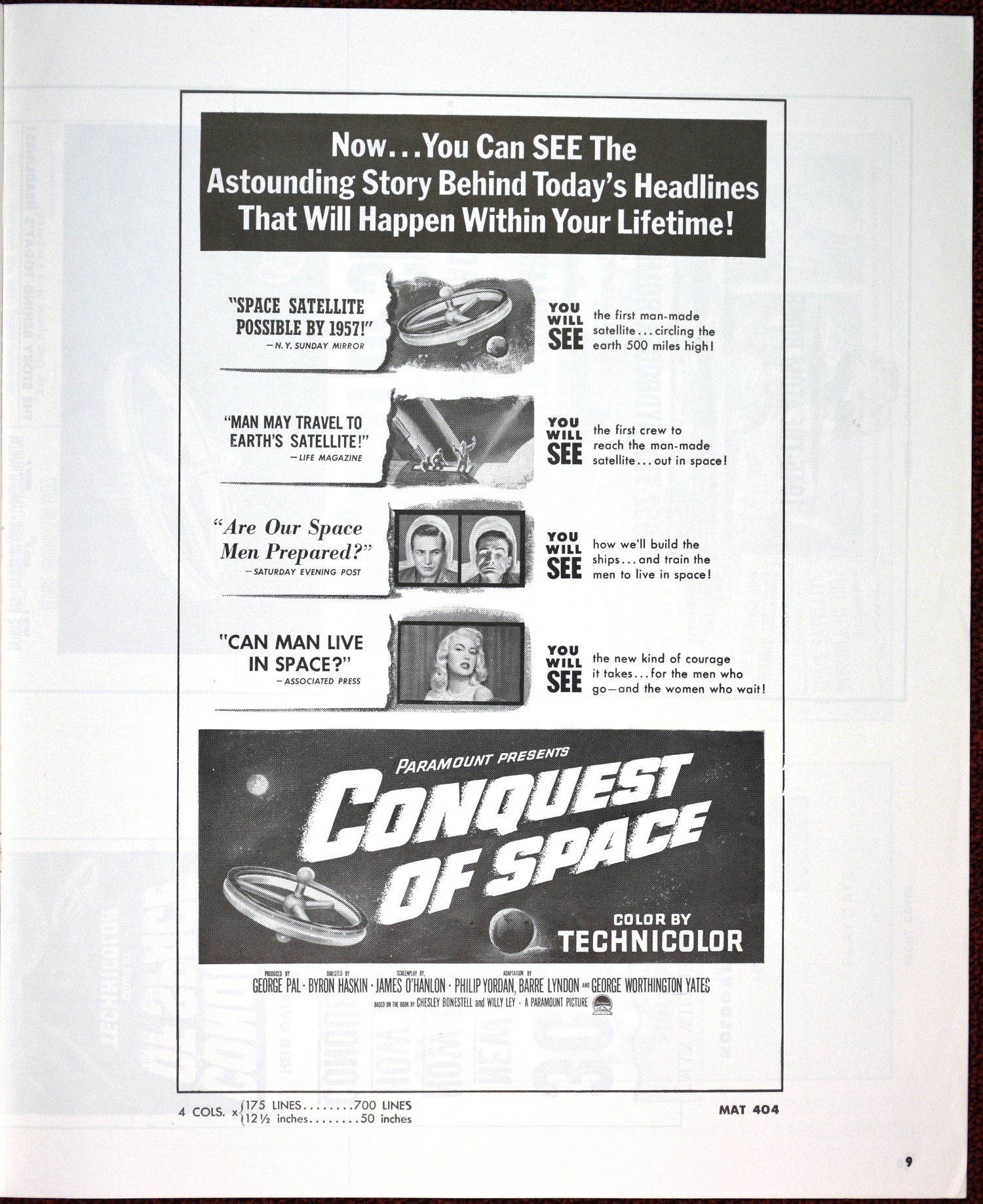 The fascination with outer space exploration and interplanetary travel (and evil aliens) fueled a lot of 1950s science fiction cinema. Usually it was either the after effects of space travel causing more harm than anticipated (the Quatermass Xperiment: The Creeping Unknown is a good example), or it was finding out that once you got to where you were going, monstrous alien monsters (I'm open to a better term if you've got one) wanted to eat you or do other nasty things (like in The Angry Red Planet). Then, of course, you had George Pal insisting on giving us movies that focused on the more positive and challenging aspects of space exploration. He even insisted on adding as much scientifically accurate information (at least what was known back then) as possible. Wild, right? Here's the pressbook for George Pal's Conquest of Space.