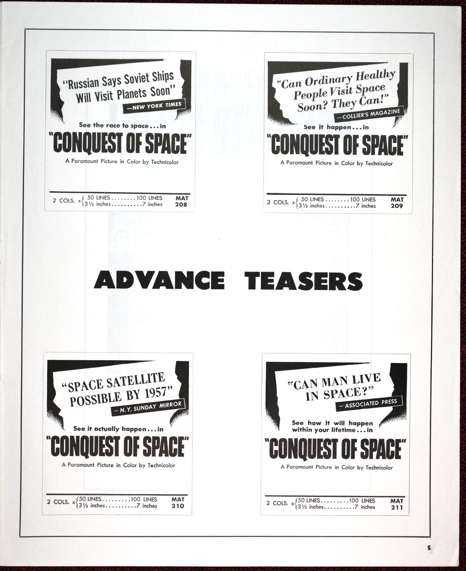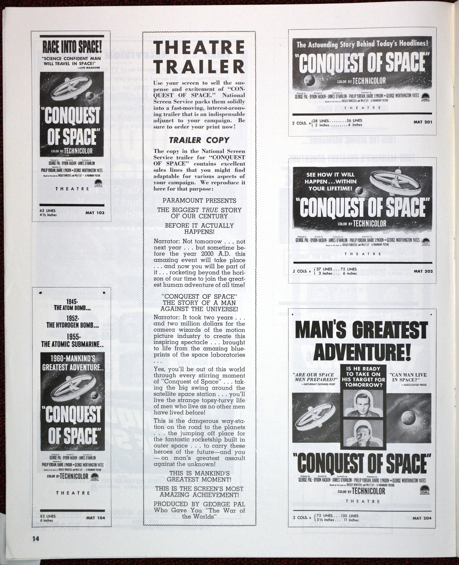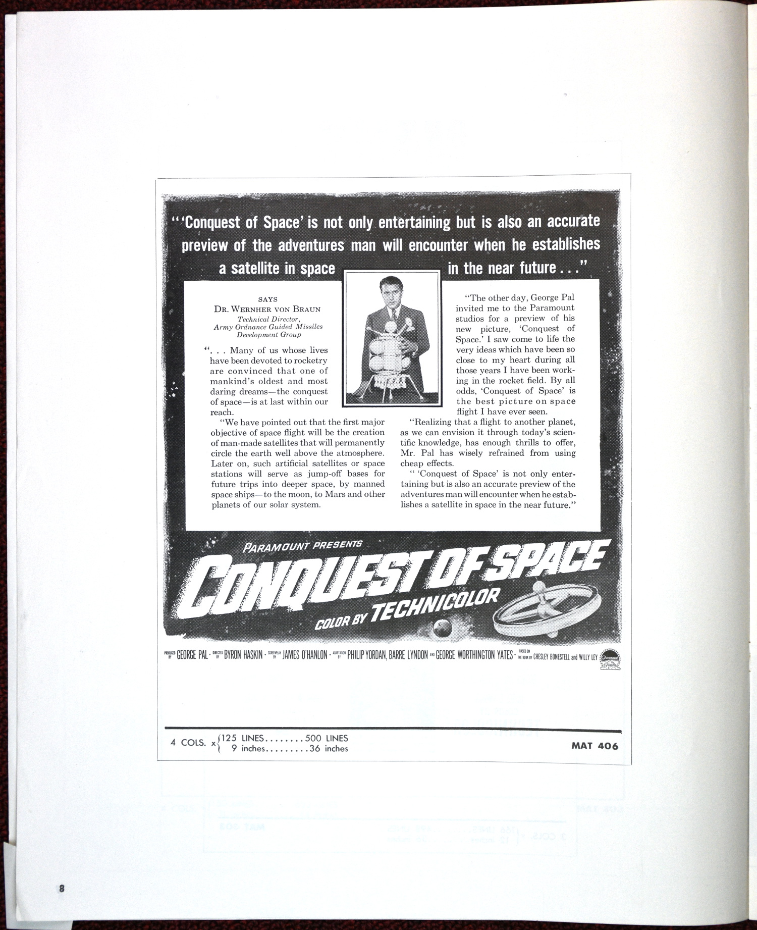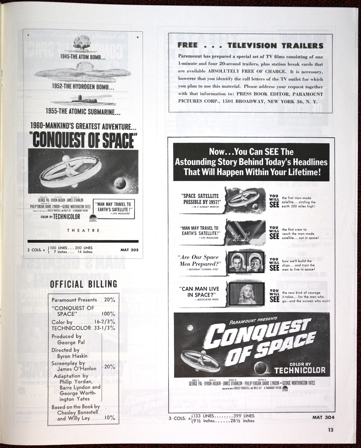 The fascination with outer space exploration and interplanetary travel (and evil aliens) fueled a lot of 1950s science fiction cinema. Usually it was either the after effects of space travel causing more harm than anticipated (the Quatermass Xperiment: The Creeping Unknown is a good example), or it was finding out that once you got to where you were going, monstrous alien monsters (I'm open to a better term if you've got one) wanted to eat you or do other nasty things (like in The Angry Red Planet). Then, of course, you had George Pal insisting on giving us movies that focused on the more positive and challenging aspects of space exploration. He even insisted on adding as much scientifically accurate information (at least what was known back then) as possible. Wild, right? Here's the pressbook for George Pal's Conquest of Space.