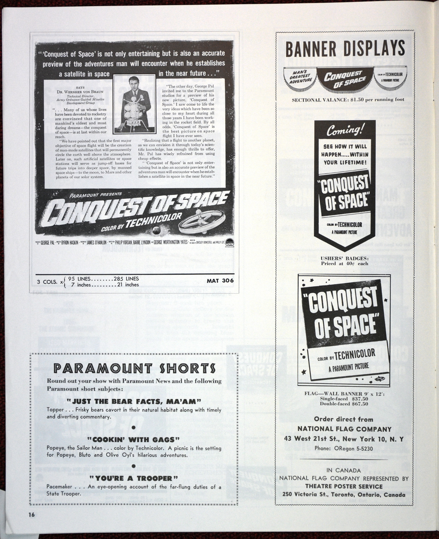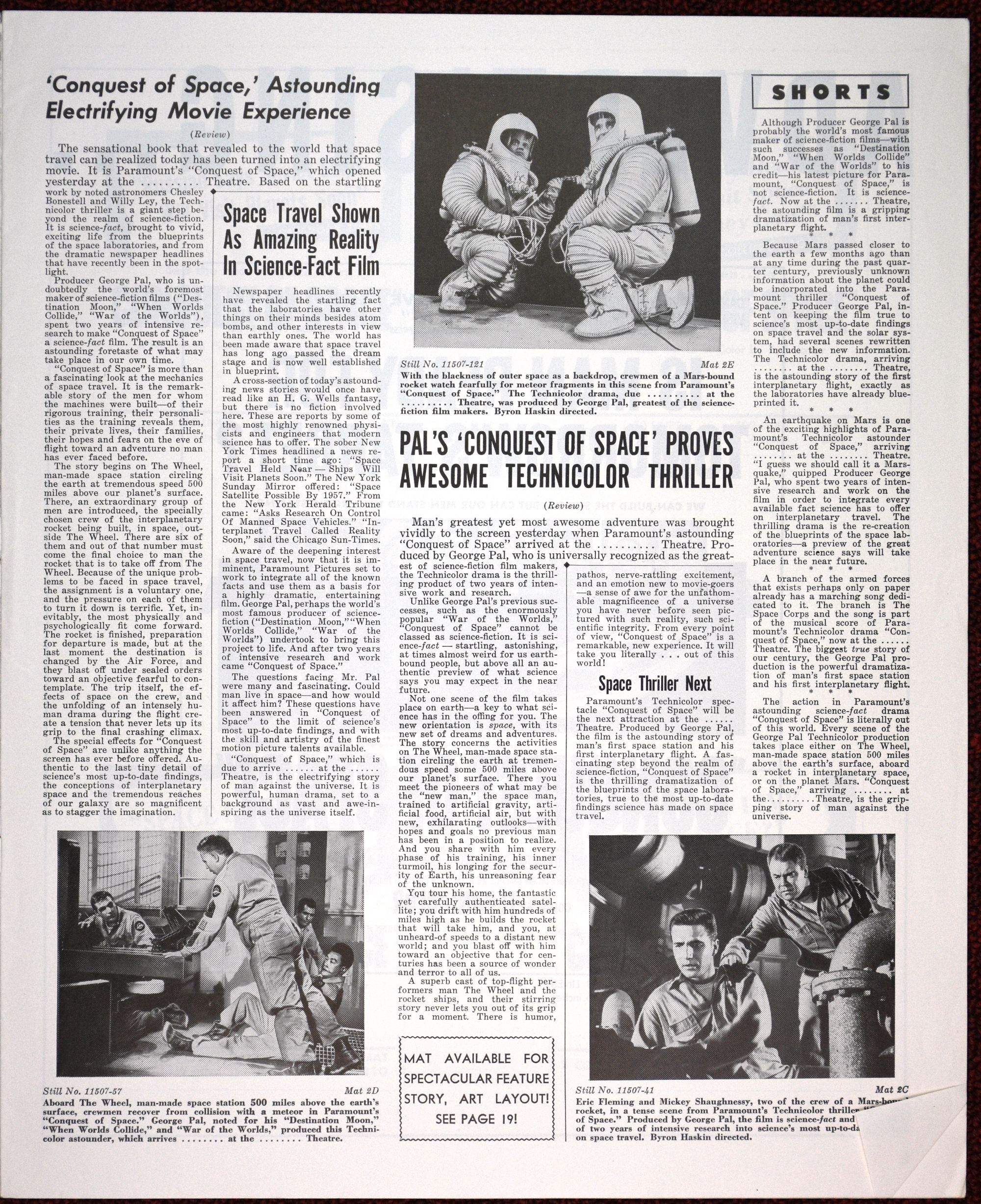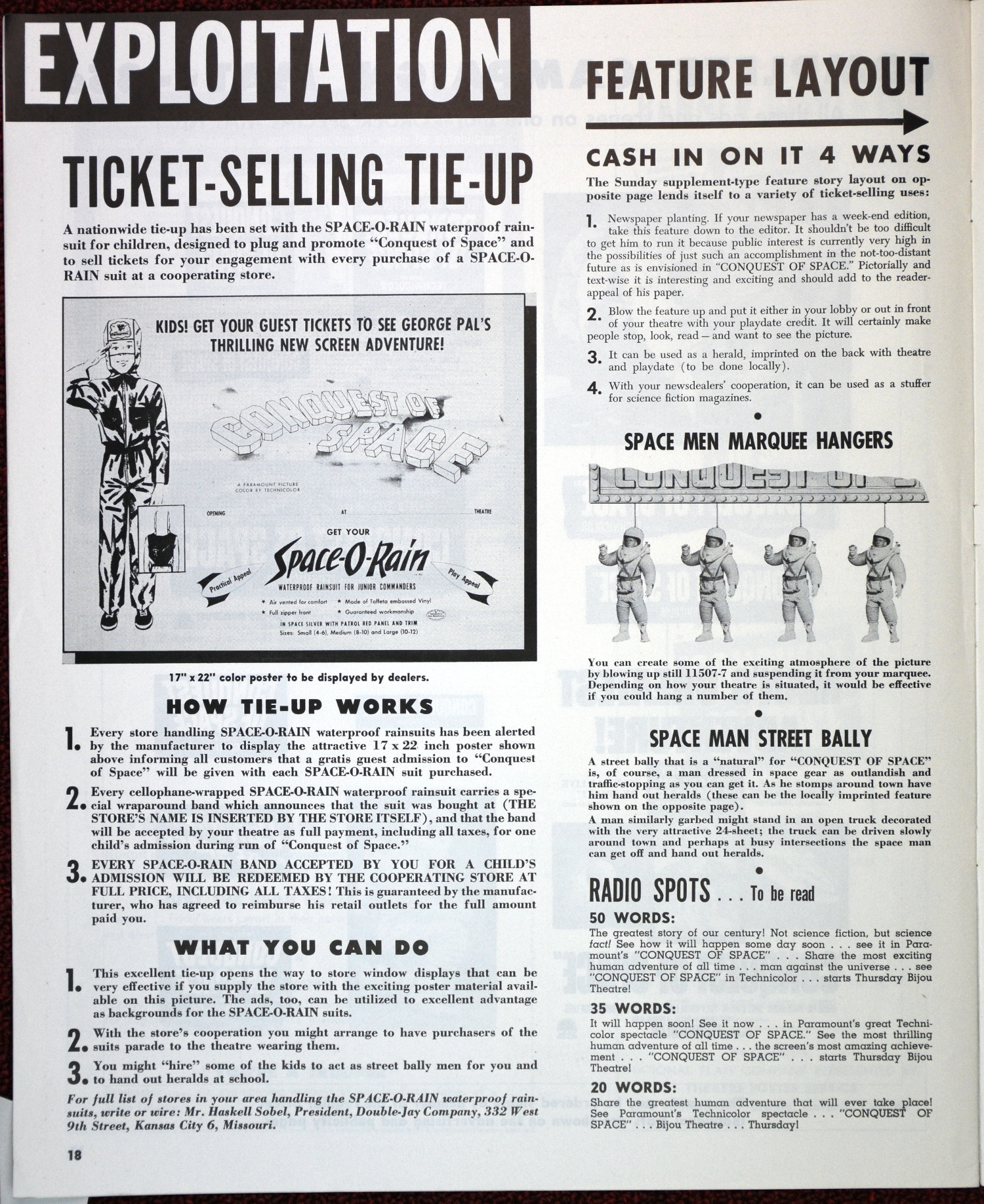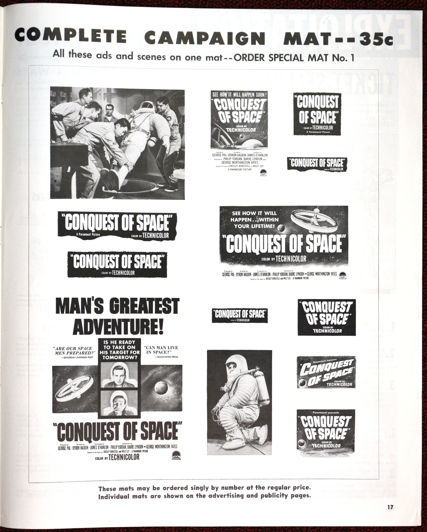 The fascination with outer space exploration and interplanetary travel (and evil aliens) fueled a lot of 1950s science fiction cinema. Usually it was either the after effects of space travel causing more harm than anticipated (the Quatermass Xperiment: The Creeping Unknown is a good example), or it was finding out that once you got to where you were going, monstrous alien monsters (I'm open to a better term if you've got one) wanted to eat you or do other nasty things (like in The Angry Red Planet). Then, of course, you had George Pal insisting on giving us movies that focused on the more positive and challenging aspects of space exploration. He even insisted on adding as much scientifically accurate information (at least what was known back then) as possible. Wild, right? Here's the pressbook for George Pal's Conquest of Space.