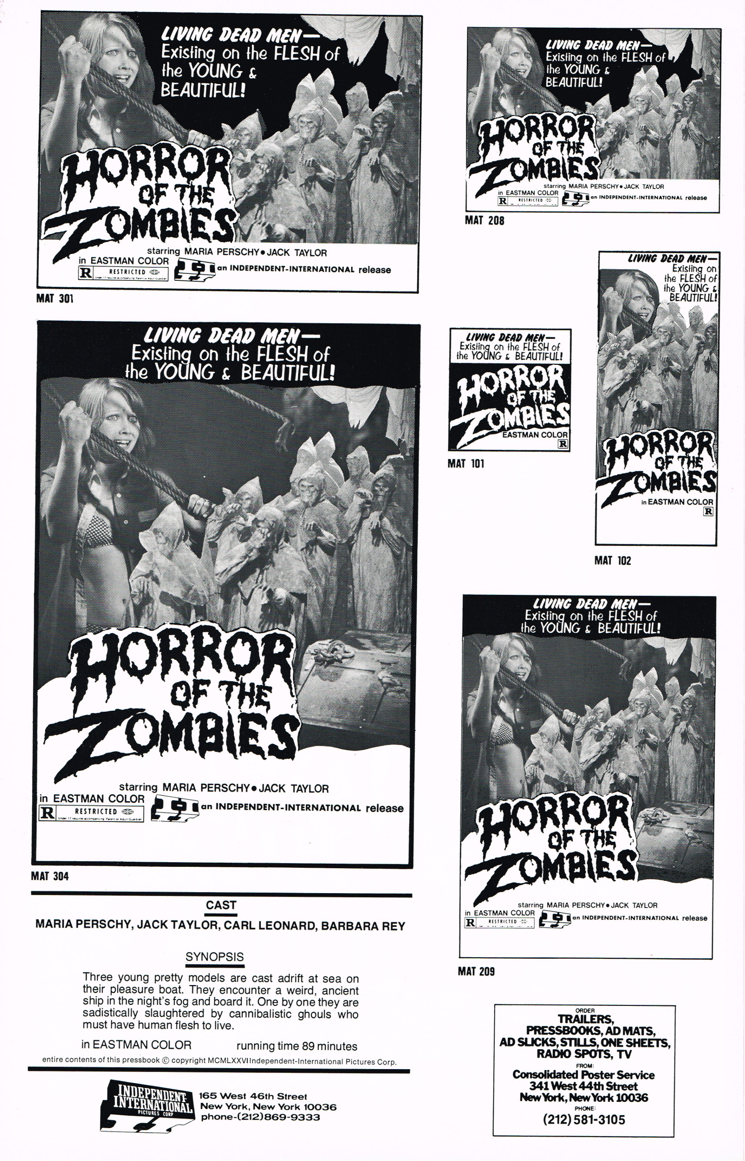 So I'm thinking if you're not young and beautiful, you're safe, right? By the 1970s, pressbooks were becoming cut-up and paste efforsts (worst efforts, clever huh) with lurid colors and few pages. This one is a double-sided sheet. That's it. Two beautiful girls stumble onto a ghost ship filled with flesh-eating ghouls. They (the girls) insist on checking it out so they can be devoured as they (the ghouls) check them out. Rescuers arrive for more snacks. And the illustration makes it look like she's fighting little people dead men with rope. In a bikini. Midnight show anyone? And yes, it's those Knights Templars back for more. This is the third installment, El Buque Maldito, in the Blind Dead series. It does have its atmosphere and creep factor, though, so midnight show, anyone?