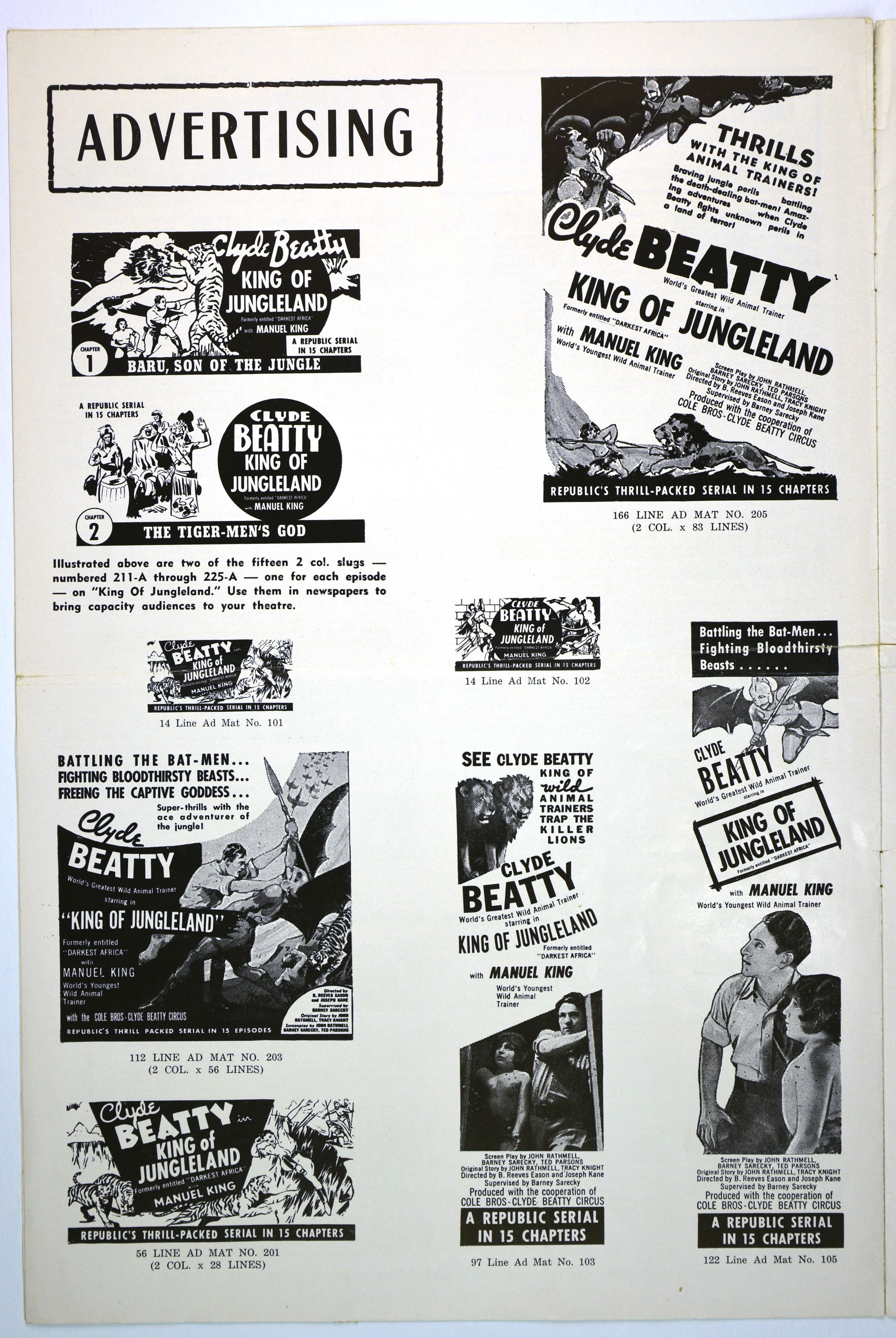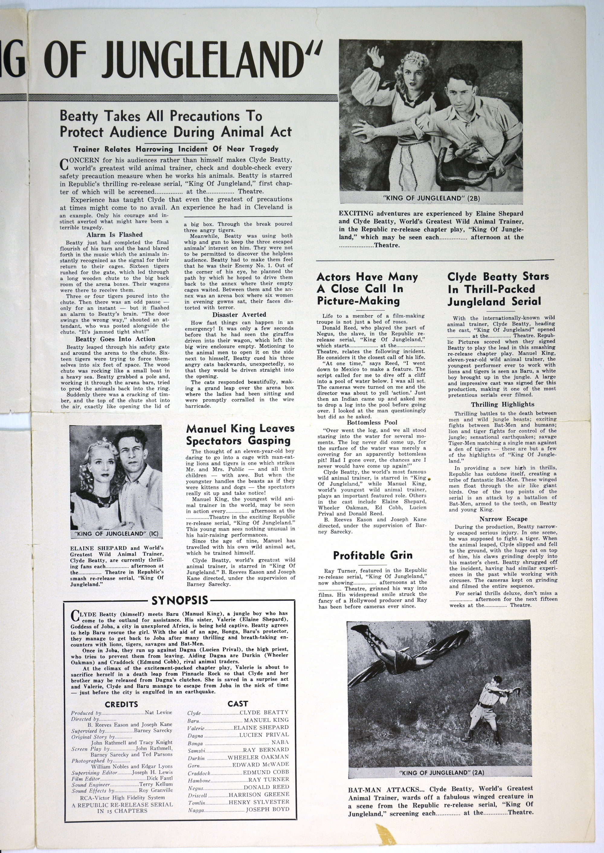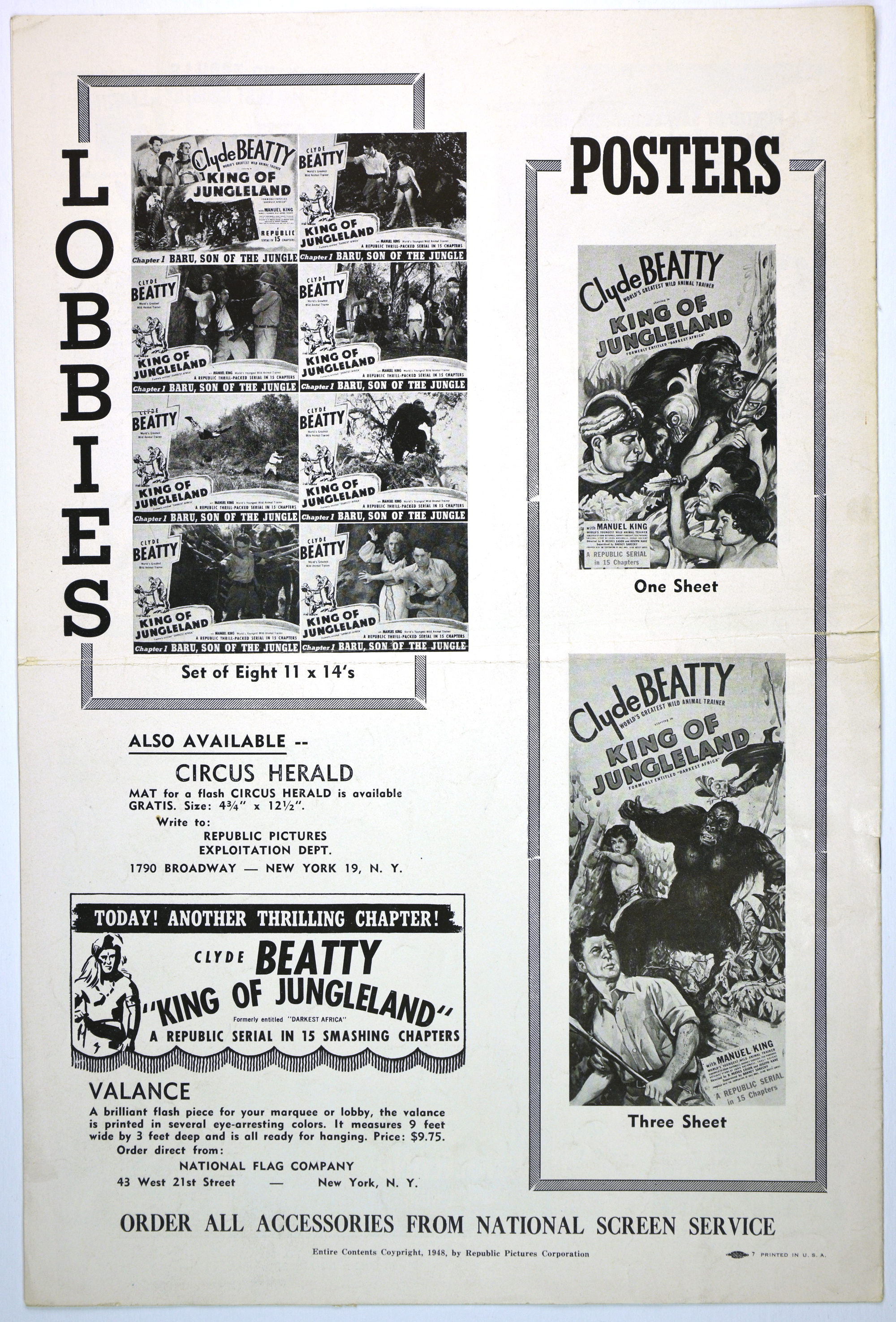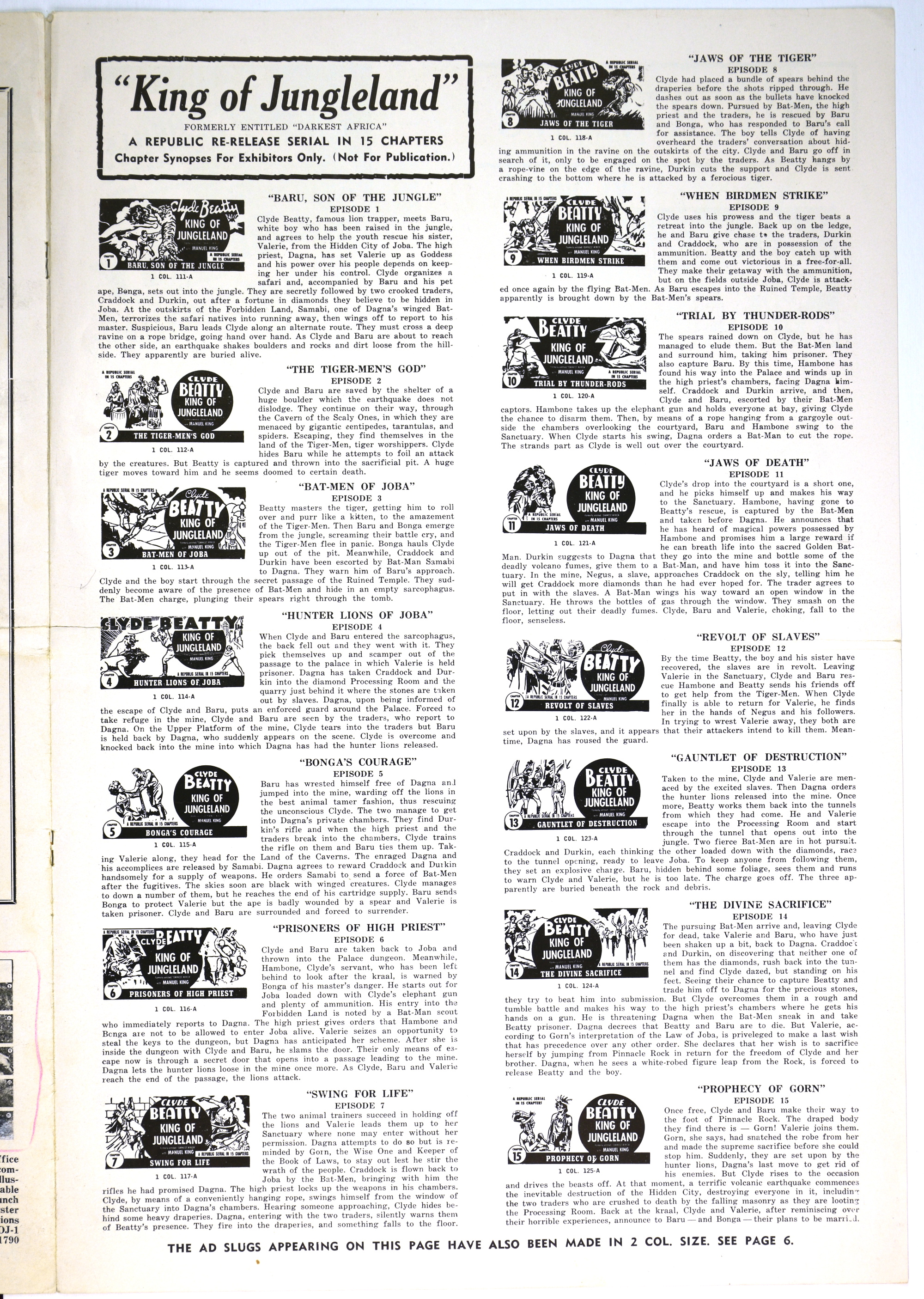 Wikipedia lists this as the first Republic serial made. Also, "Darkest Africa contained the first use of the flying special effects that Republic would go on to use in future serials, such as the acclaimed Adventures of Captain Marvel. This serial also showcased examples of the studio's model work that would be one of the factors in its future reputation and success. The destruction of the lost city in the final chapter is particularly highlighted by Cline as a "picturesque example." It was re-released to television and renamed Batmen of Africa to capitalize on the Adam West Batman craze. Hey, it's got Ray "Crash" Corrigan playing Bonga the ape: that works for me.