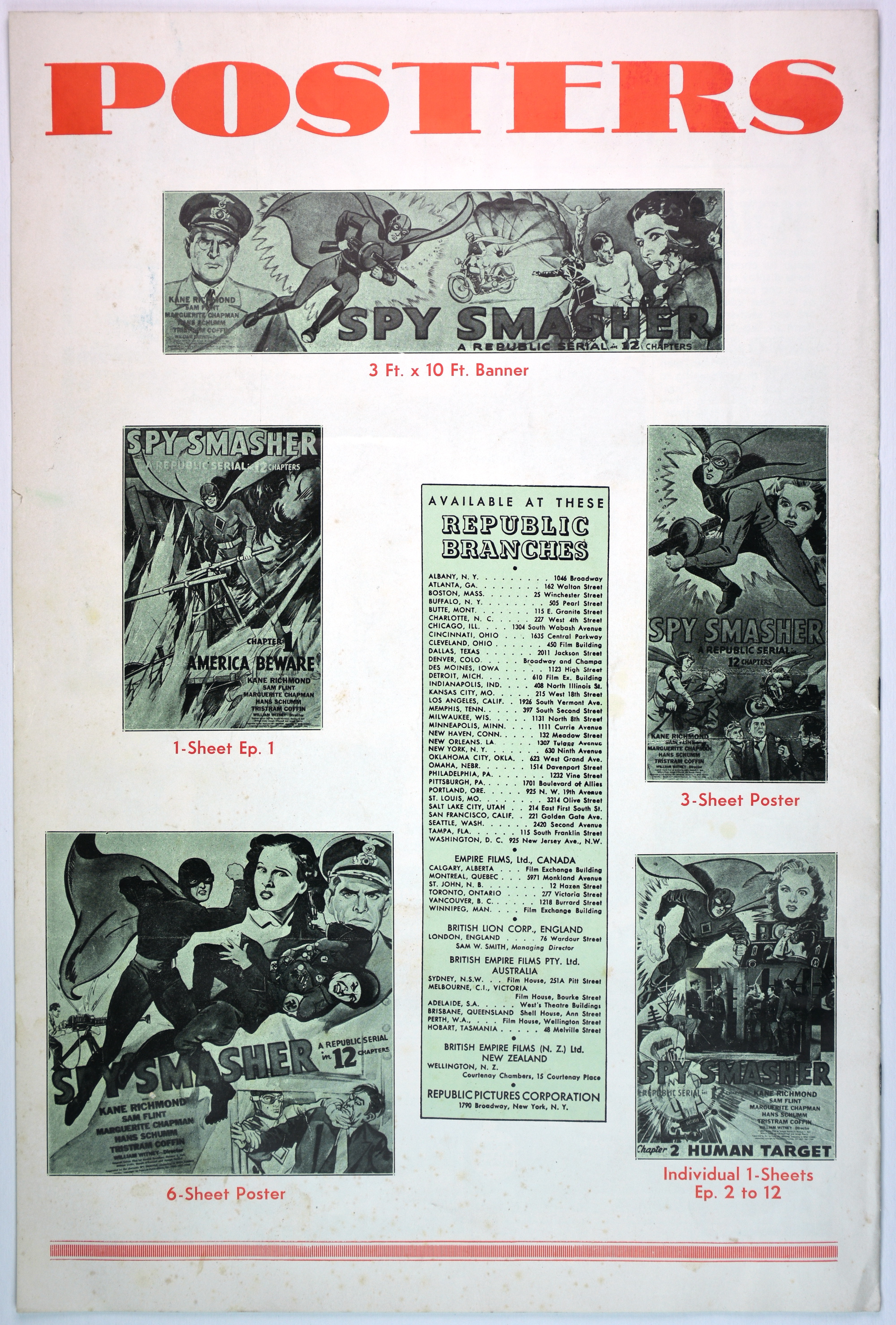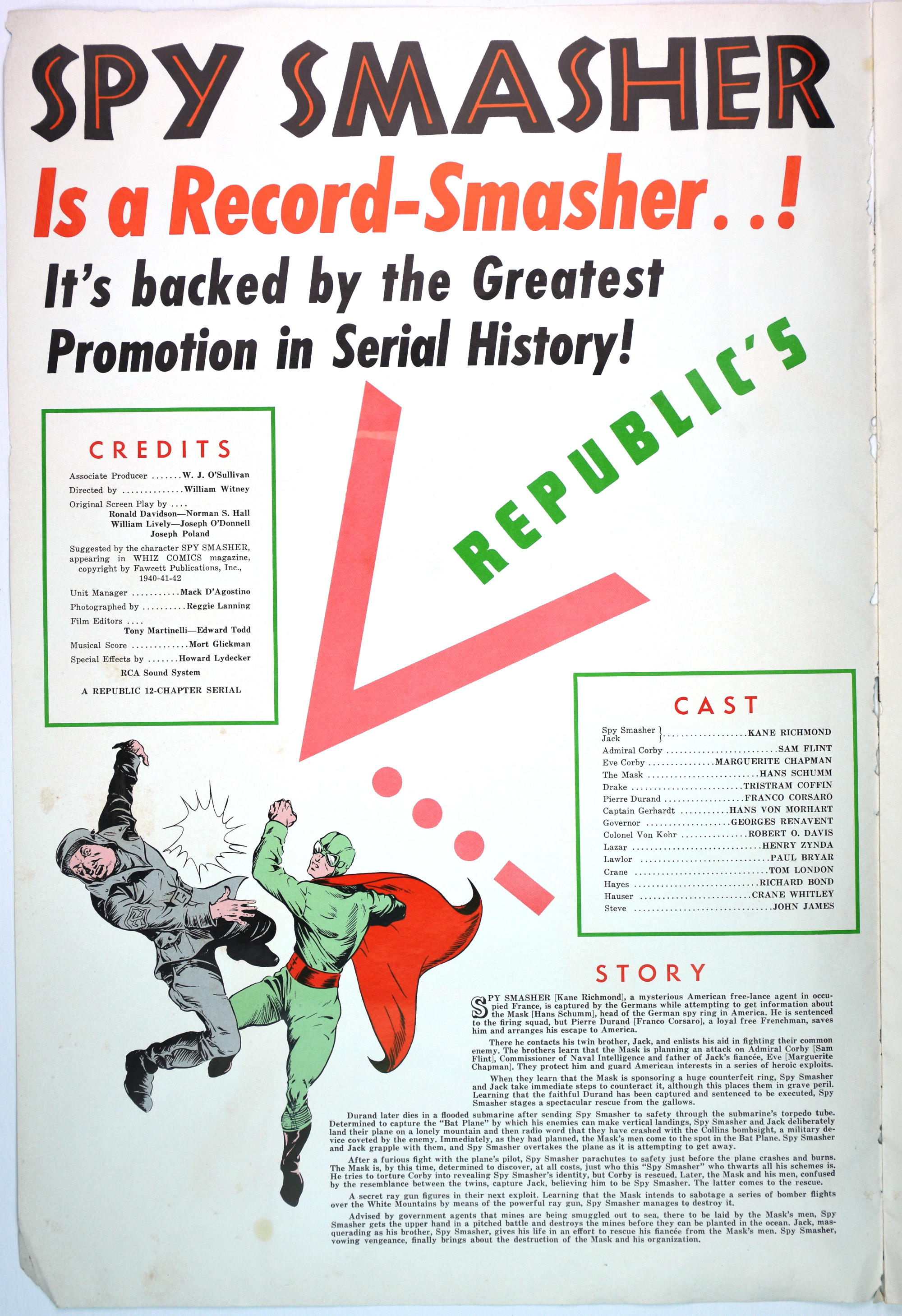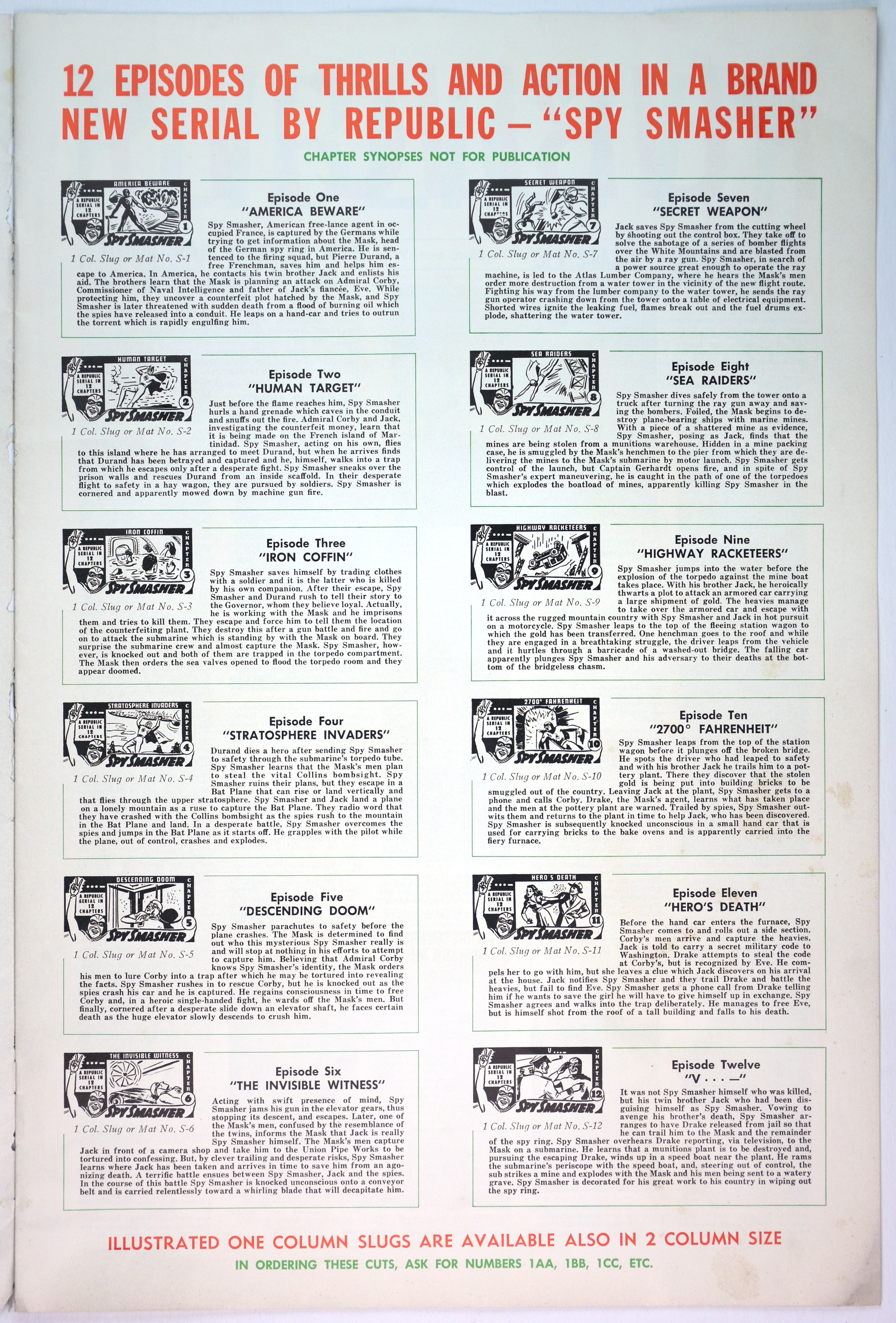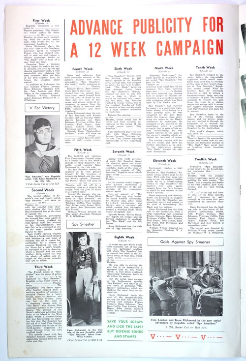 Here's the colorful pressbook for Republic Pictures' 12-chapter serial, Spy Smasher, which may be the best serial ever done. When originally shown, waiting for each cliffhanger ending to be resolved in the next episode was like waiting through the mid-season, after-season, before-season, and when-the-hell-is-the-season-starting for Game of Thrones or The Walking Dead to continue.