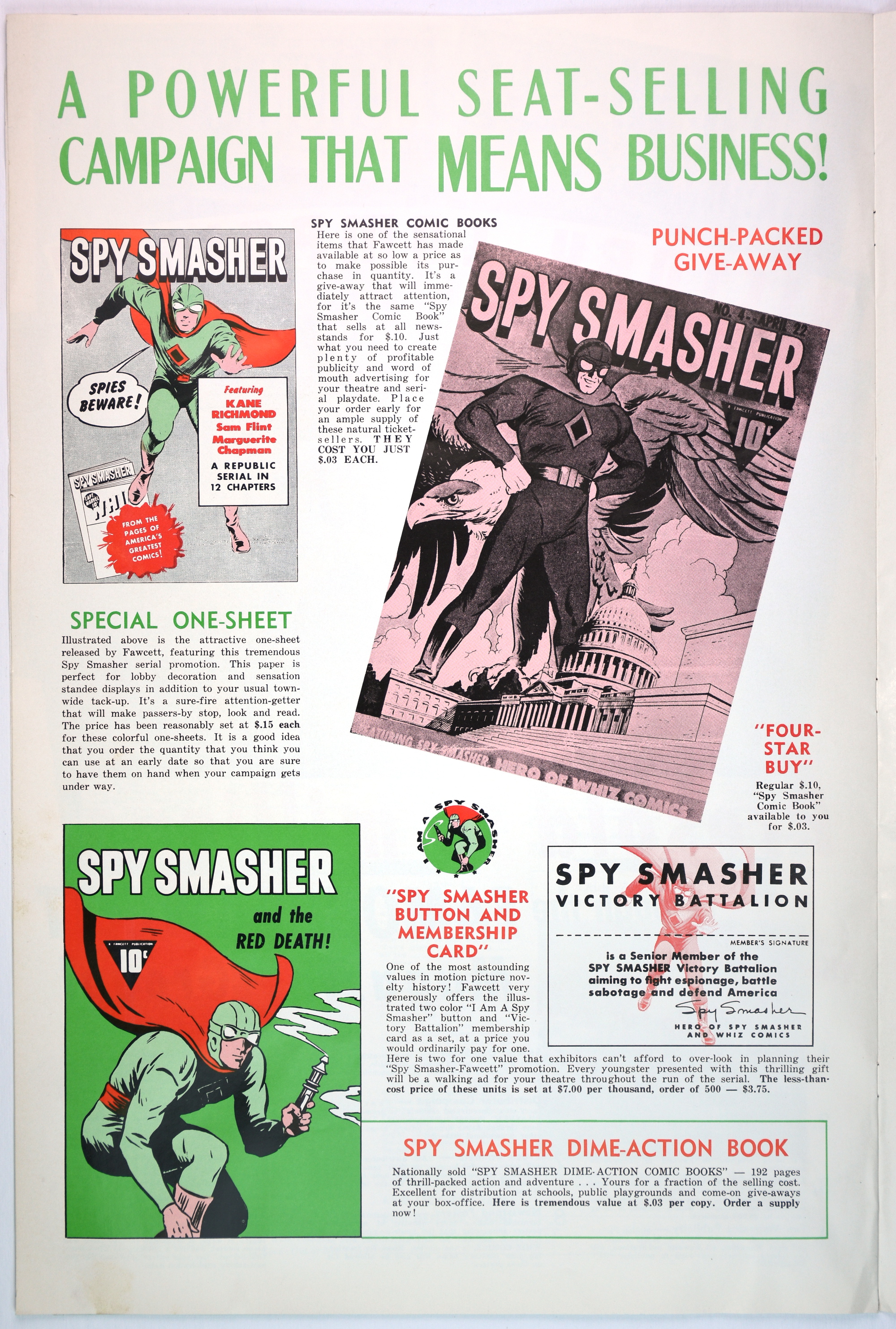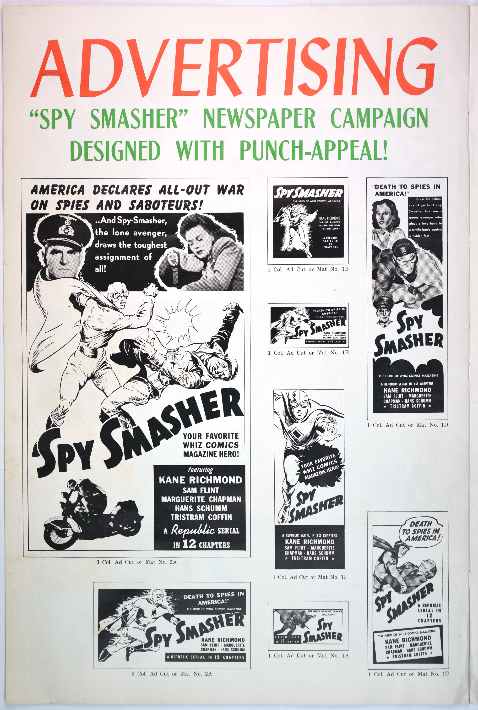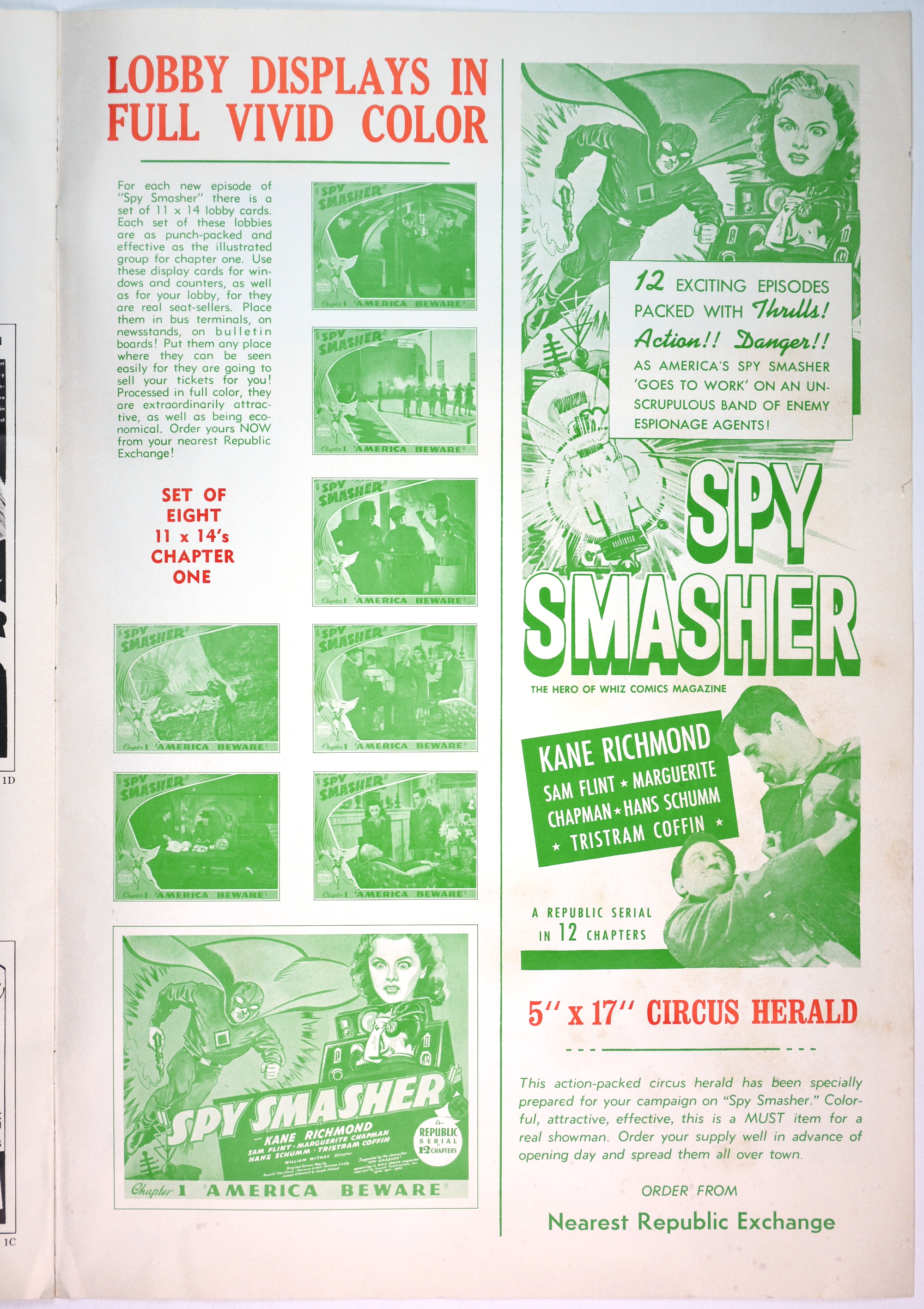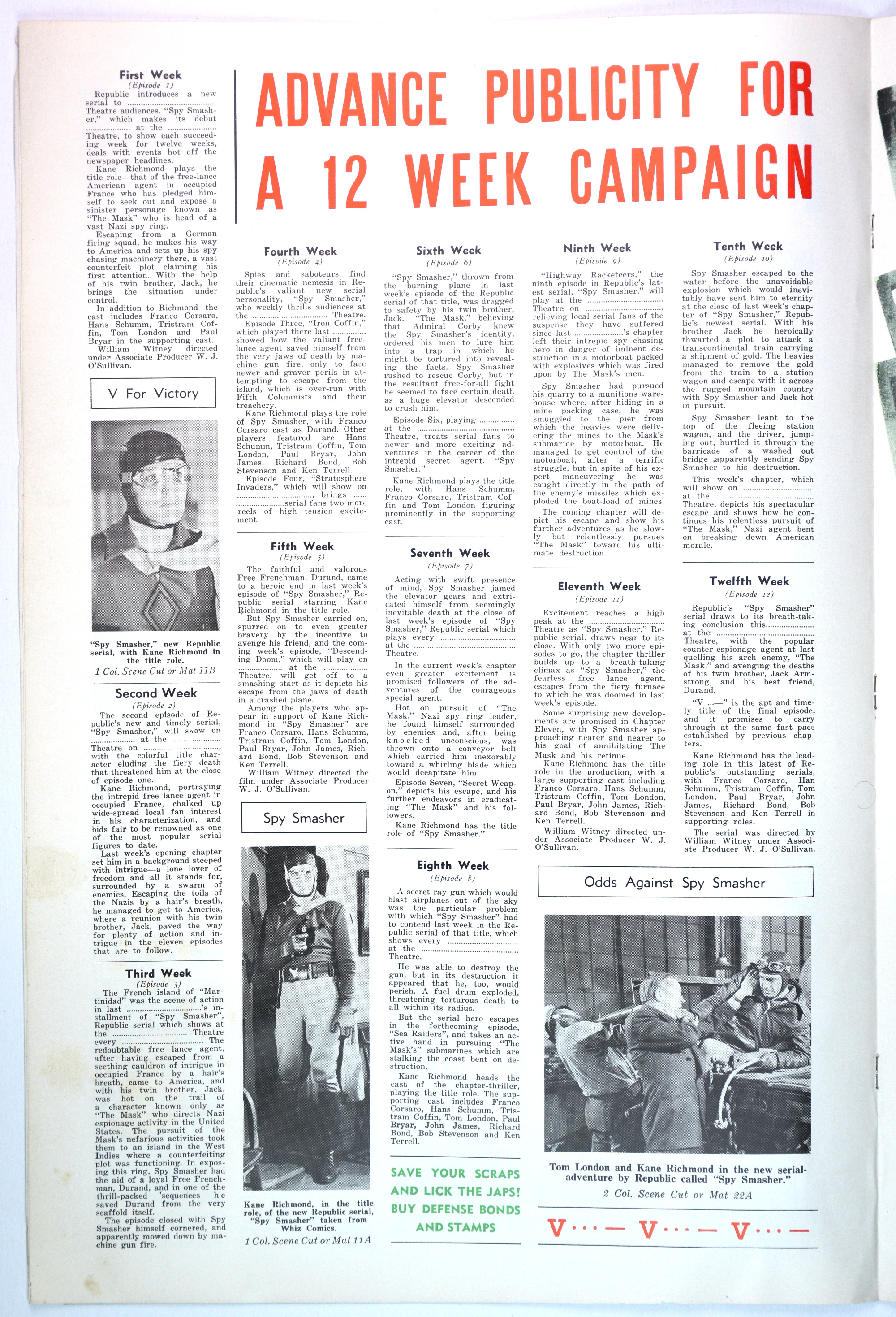 Here's the colorful pressbook for Republic Pictures' 12-chapter serial, Spy Smasher, which may be the best serial ever done. When originally shown, waiting for each cliffhanger ending to be resolved in the next episode was like waiting through the mid-season, after-season, before-season, and when-the-hell-is-the-season-starting for Game of Thrones or The Walking Dead to continue.