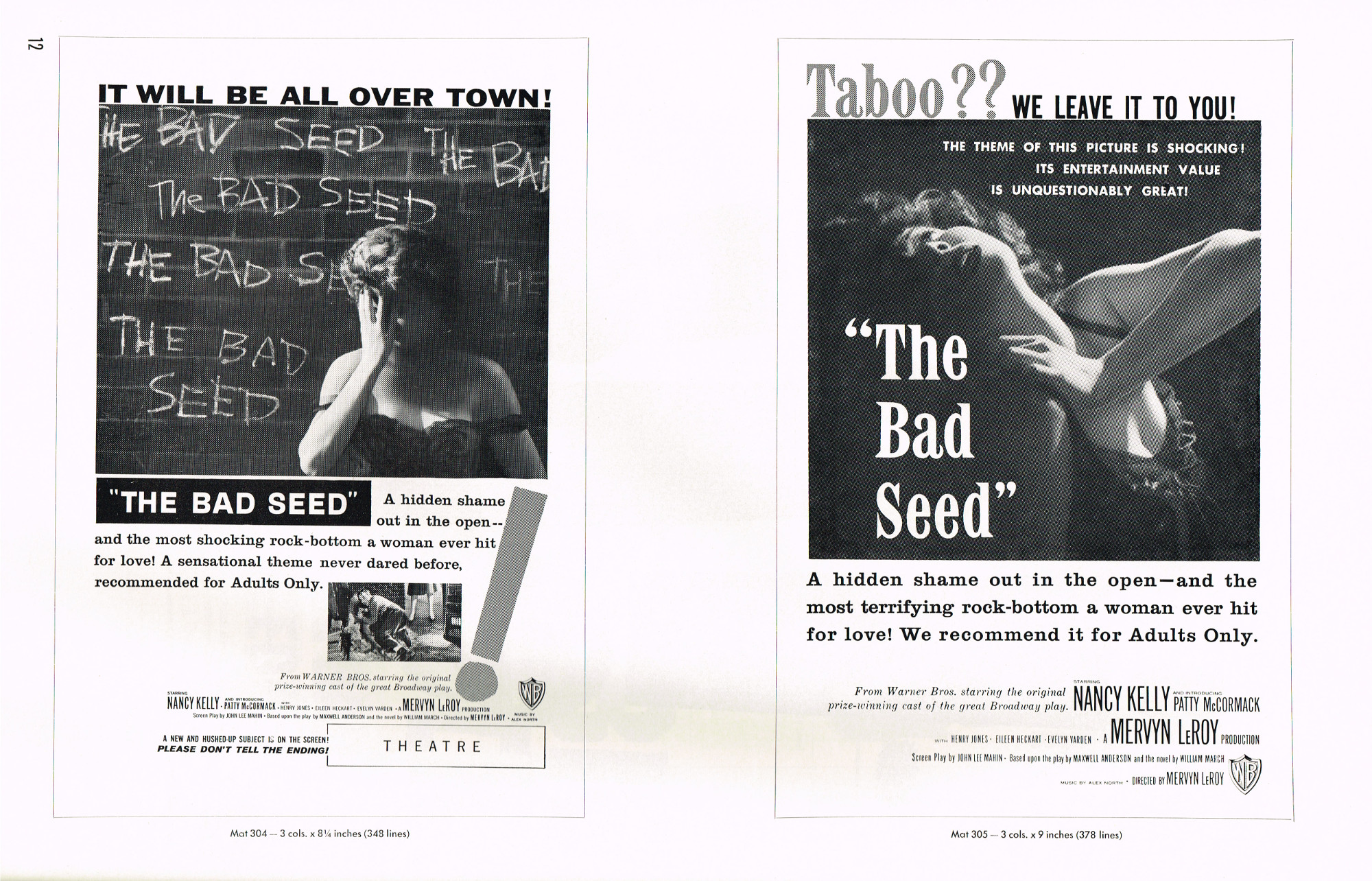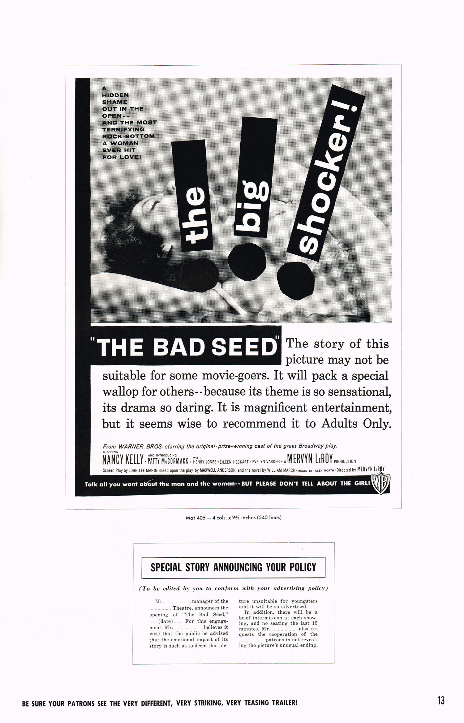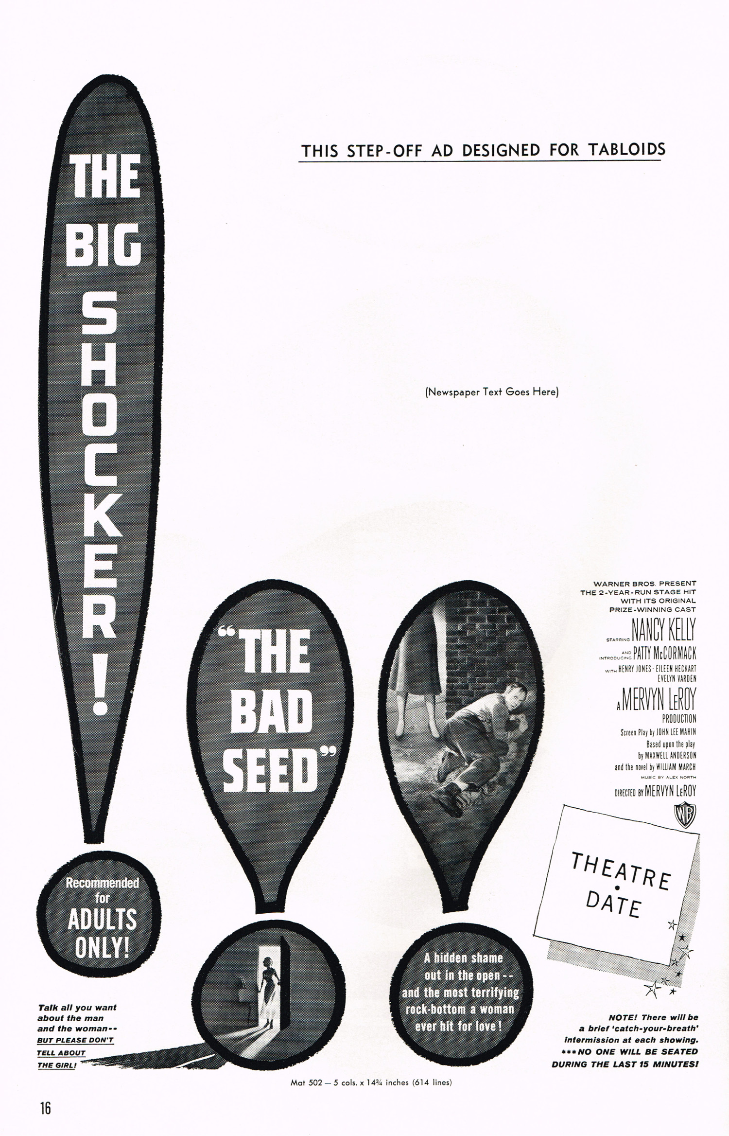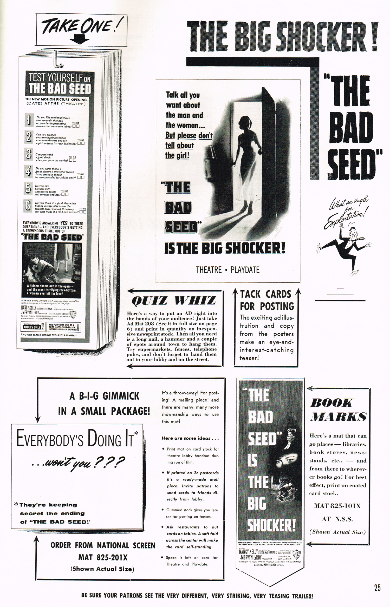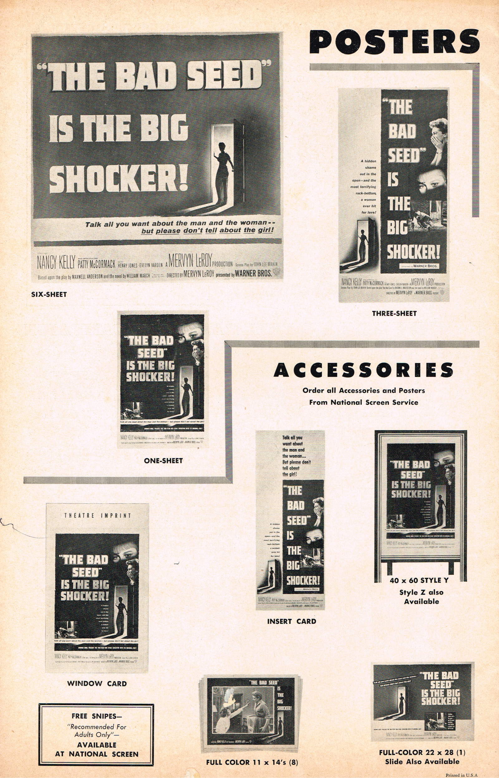 A big 28 page pressbook for a little girl. But what a little girl. The Bad Seed seemed pretty daring for the 1950s: making a kid a serial killer (and the daughter of a serial killer to imply a genetic bond). Of course the movie twists around the ending from the novel to appease the Motion Picture Production Code (and also to make it more sellable to the adult theater audience). There's an interesting filler article on page 24 that states Alfred Hitchcock wanted a walk-on part in the movie. Sounds like a smart piece of promotion more than the truth, but check it out.