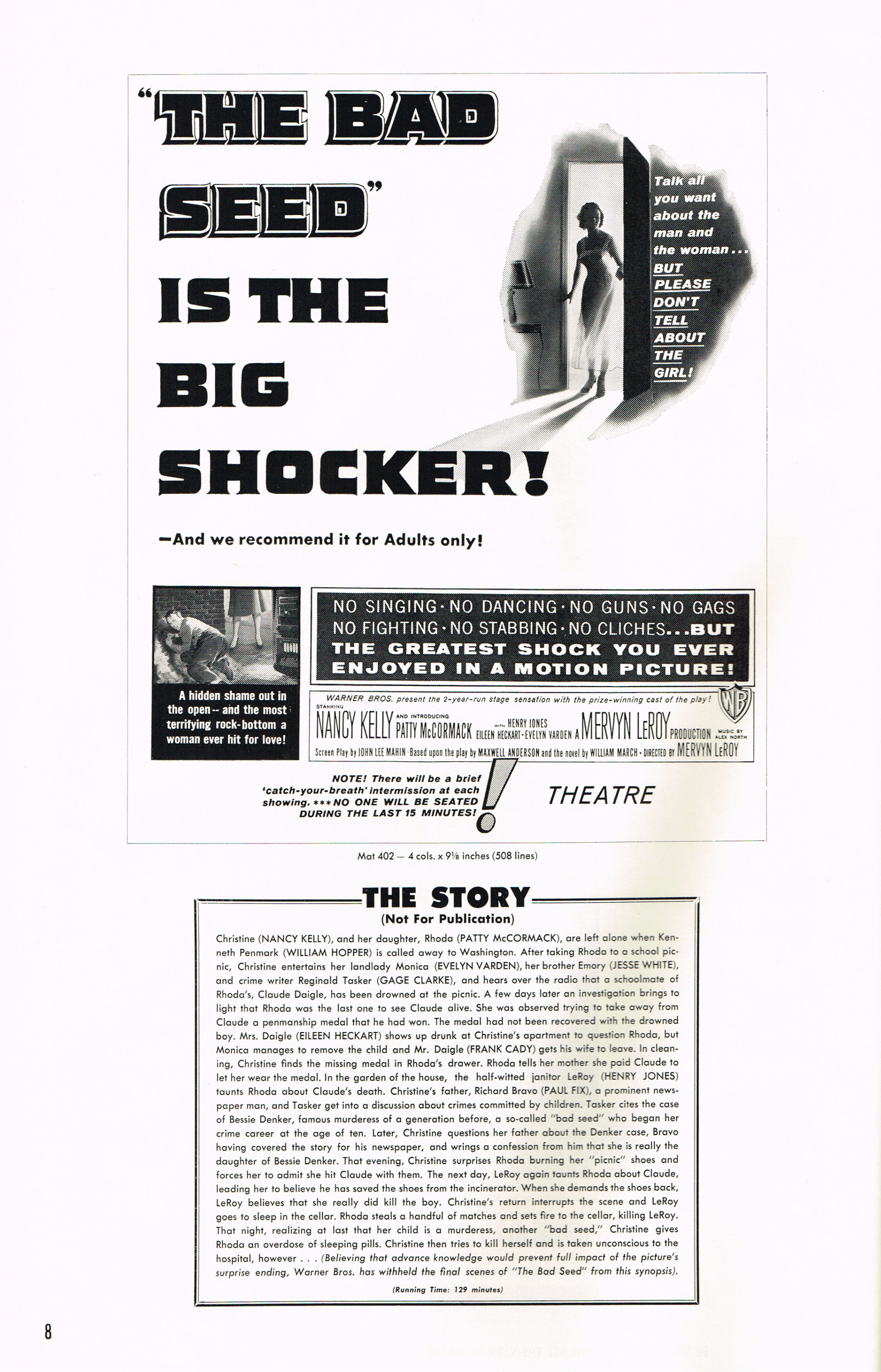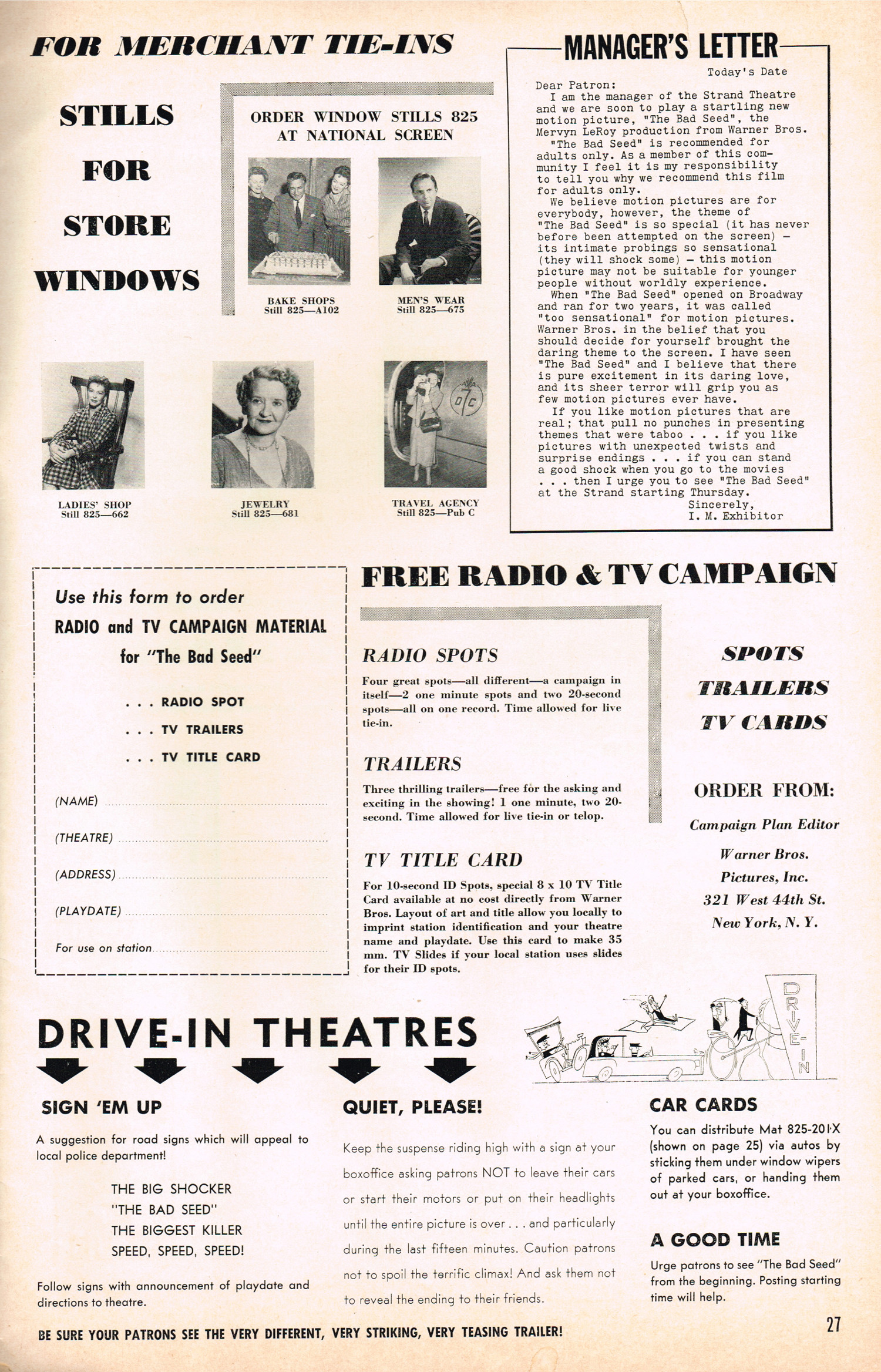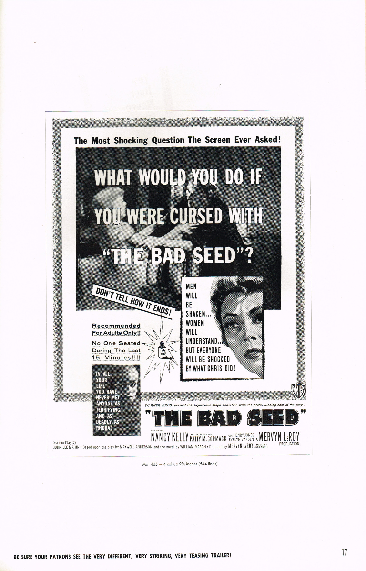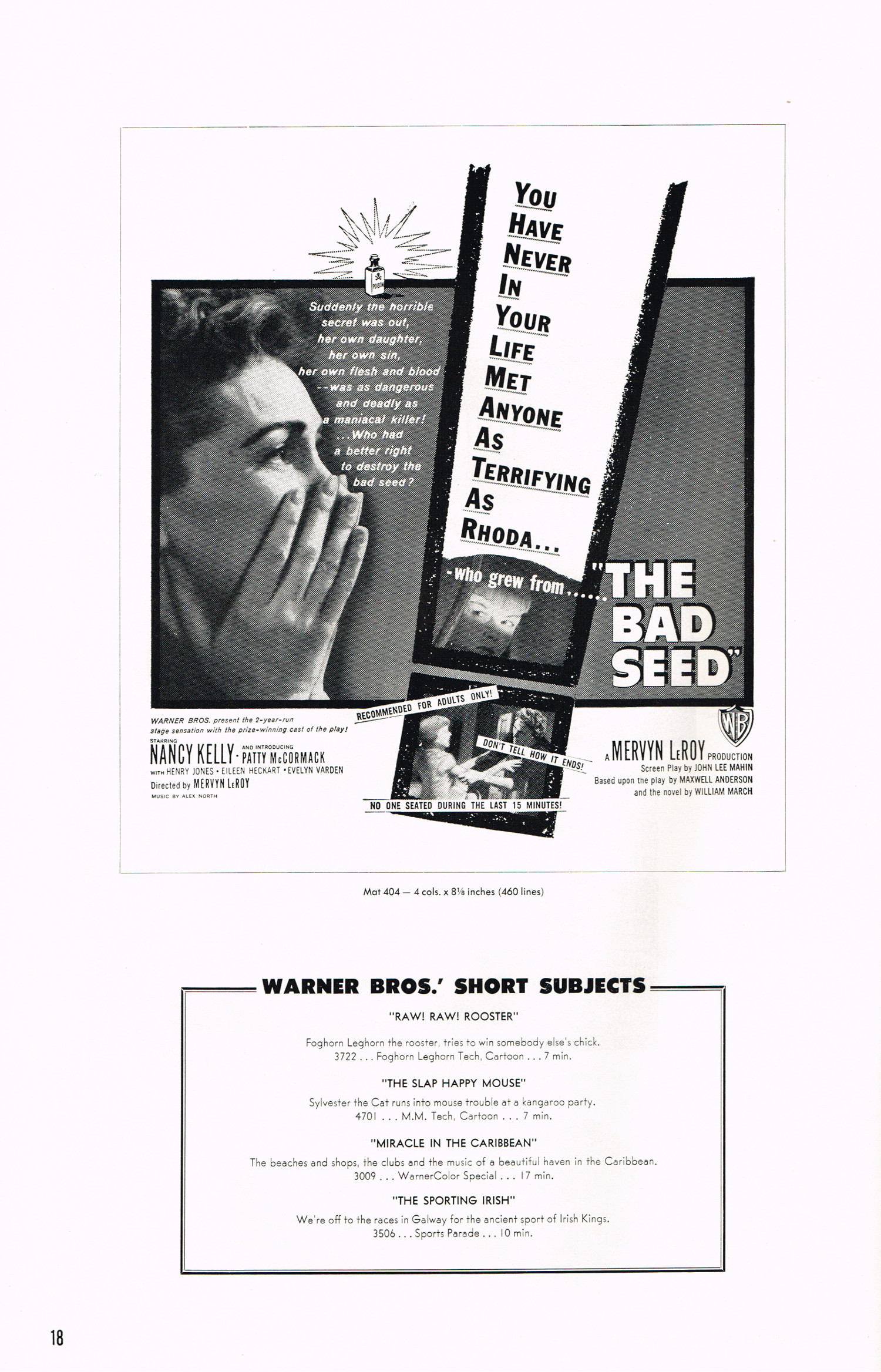 A big 28 page pressbook for a little girl. But what a little girl. The Bad Seed seemed pretty daring for the 1950s: making a kid a serial killer (and the daughter of a serial killer to imply a genetic bond). Of course the movie twists around the ending from the novel to appease the Motion Picture Production Code (and also to make it more sellable to the adult theater audience). There's an interesting filler article on page 24 that states Alfred Hitchcock wanted a walk-on part in the movie. Sounds like a smart piece of promotion more than the truth, but check it out.