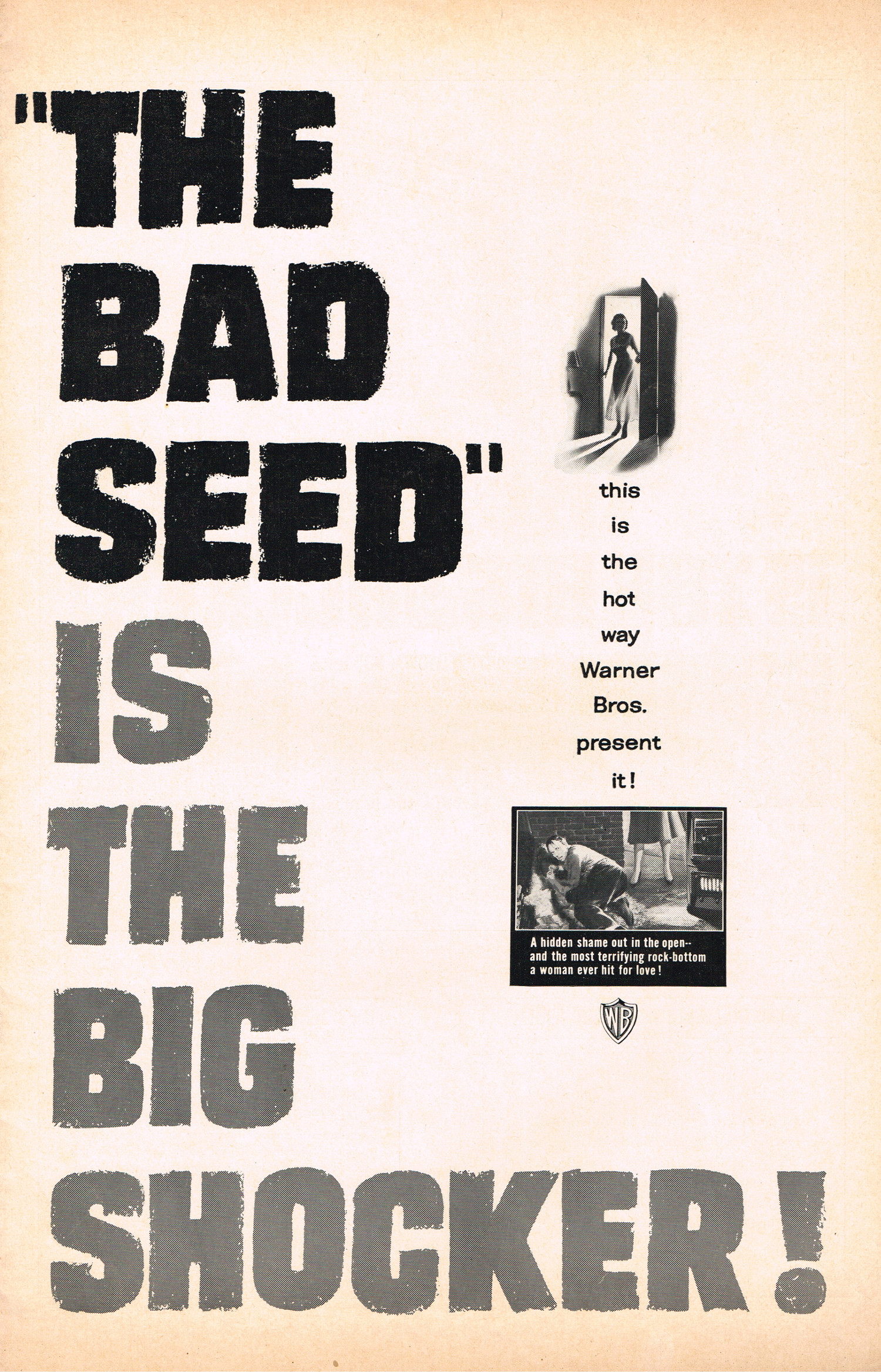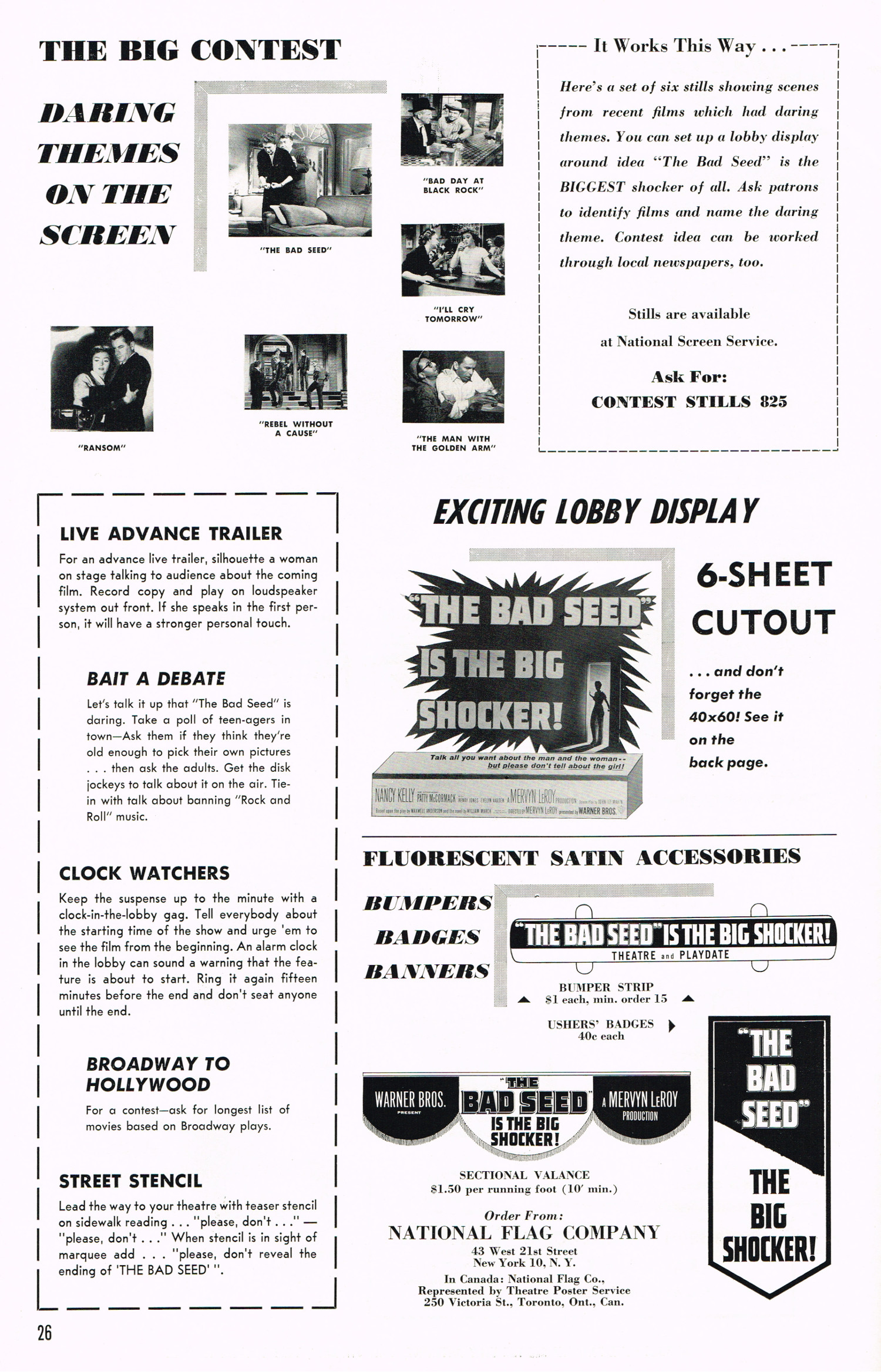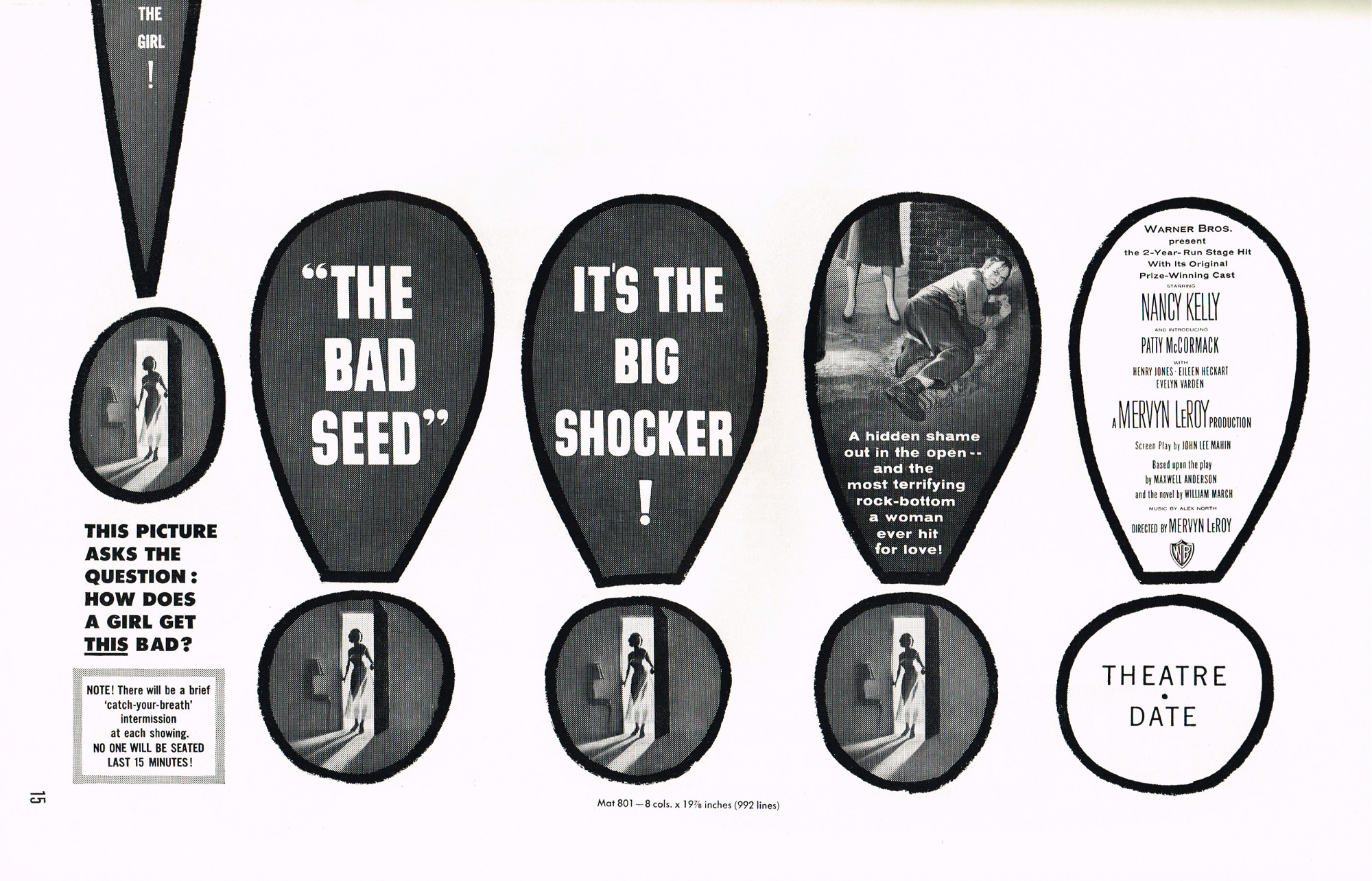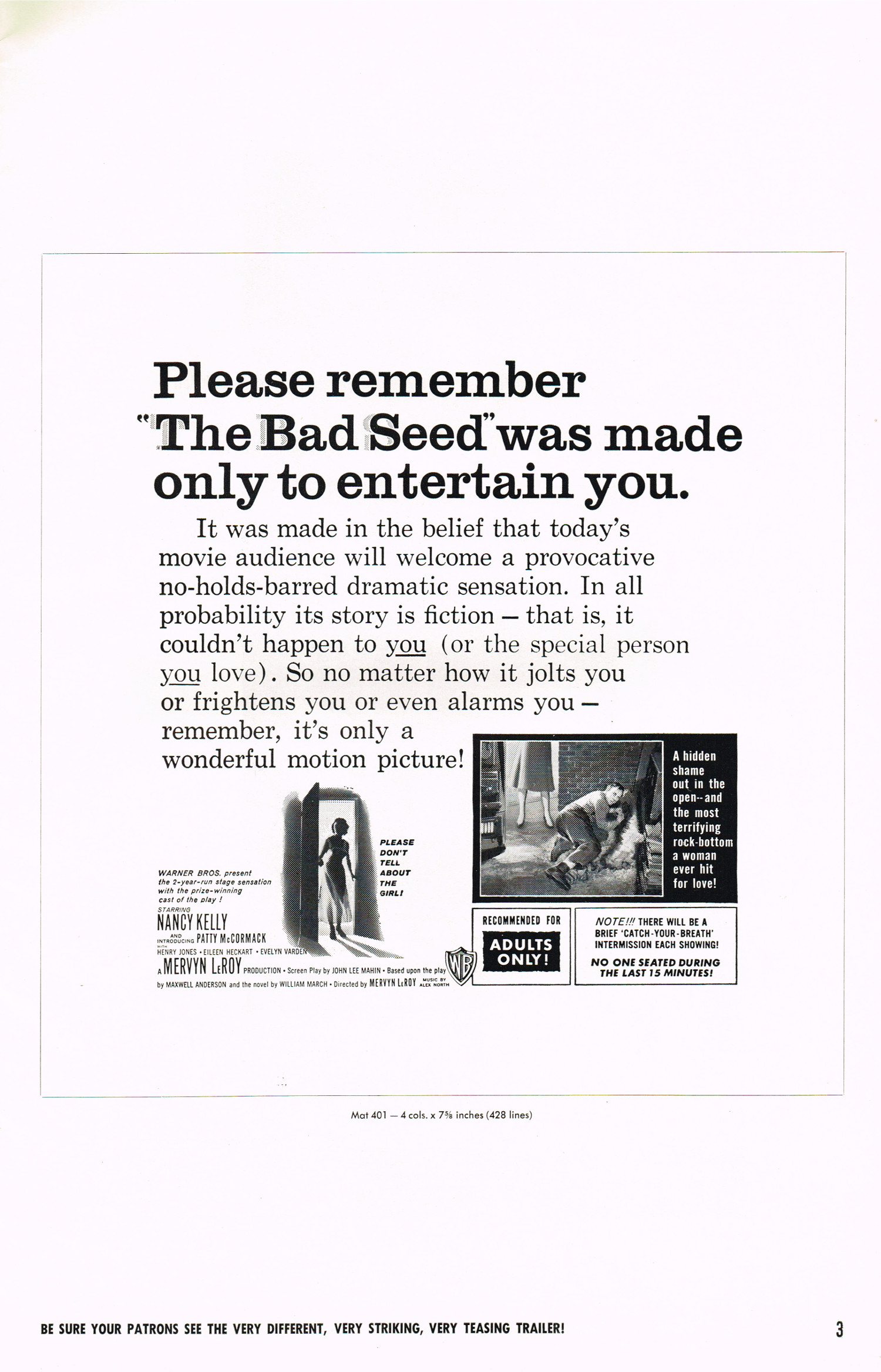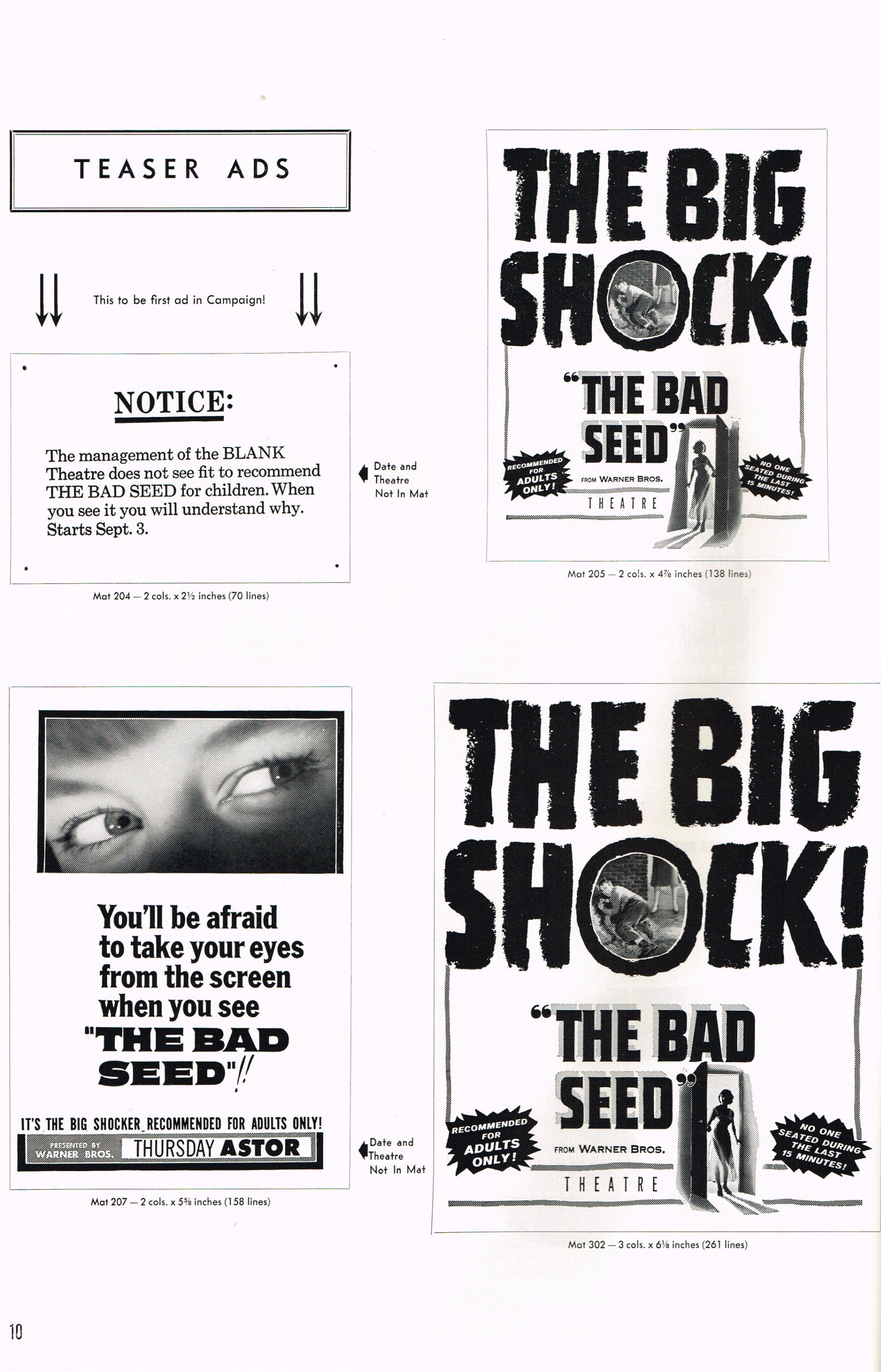 A big 28 page pressbook for a little girl. But what a little girl. The Bad Seed seemed pretty daring for the 1950s: making a kid a serial killer (and the daughter of a serial killer to imply a genetic bond). Of course the movie twists around the ending from the novel to appease the Motion Picture Production Code (and also to make it more sellable to the adult theater audience). There's an interesting filler article on page 24 that states Alfred Hitchcock wanted a walk-on part in the movie. Sounds like a smart piece of promotion more than the truth, but check it out.