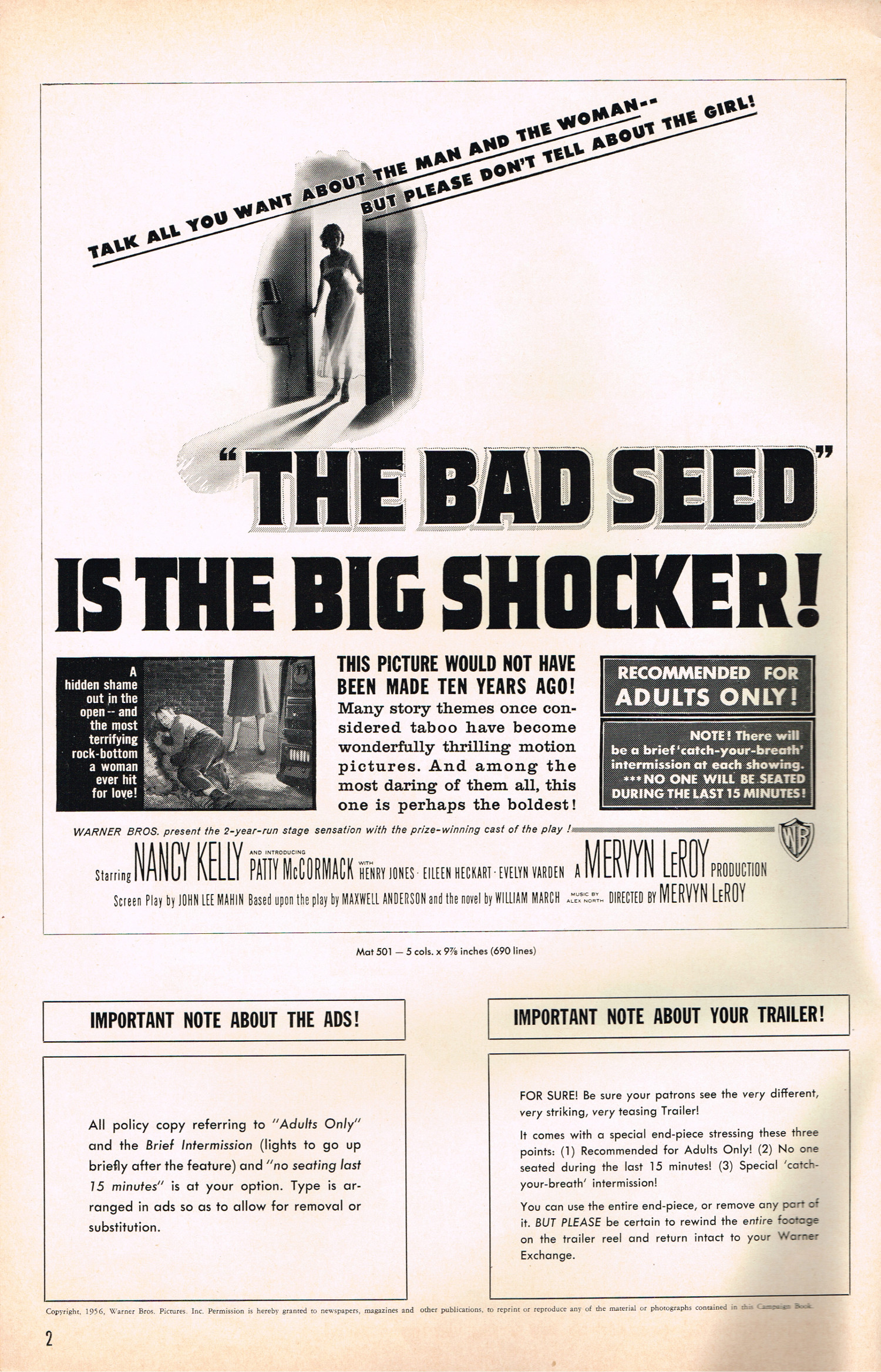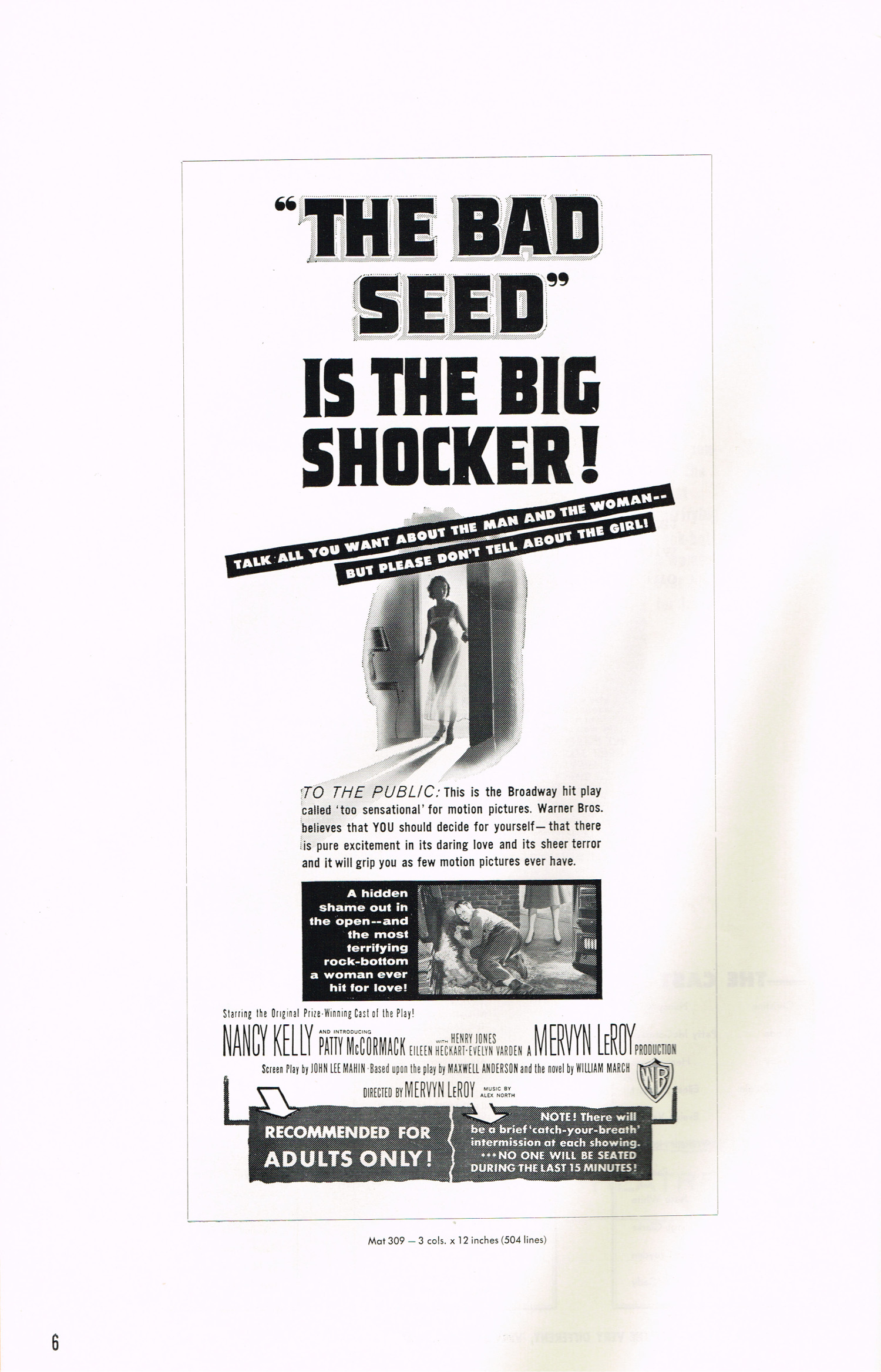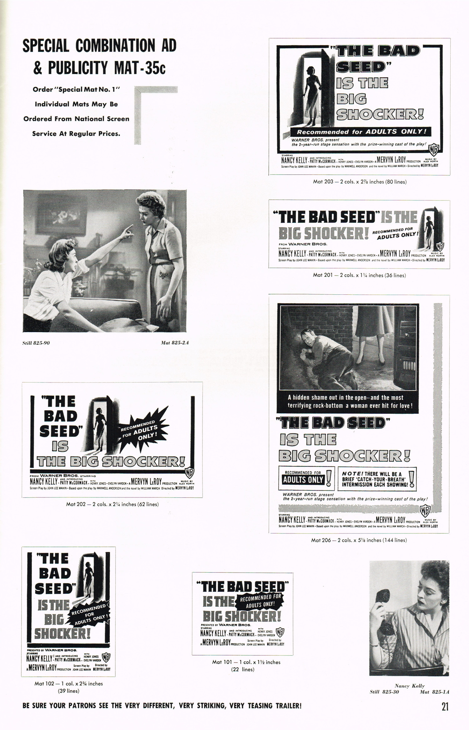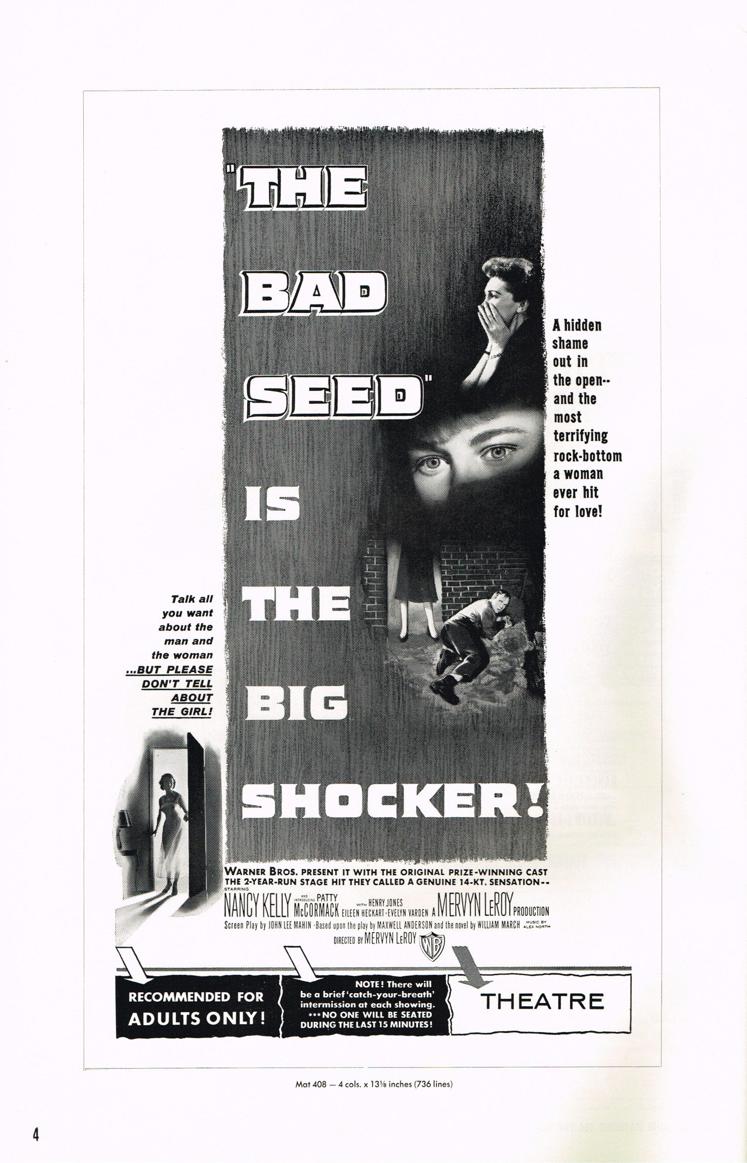 A big 28 page pressbook for a little girl. But what a little girl. The Bad Seed seemed pretty daring for the 1950s: making a kid a serial killer (and the daughter of a serial killer to imply a genetic bond). Of course the movie twists around the ending from the novel to appease the Motion Picture Production Code (and also to make it more sellable to the adult theater audience). There's an interesting filler article on page 24 that states Alfred Hitchcock wanted a walk-on part in the movie. Sounds like a smart piece of promotion more than the truth, but check it out.