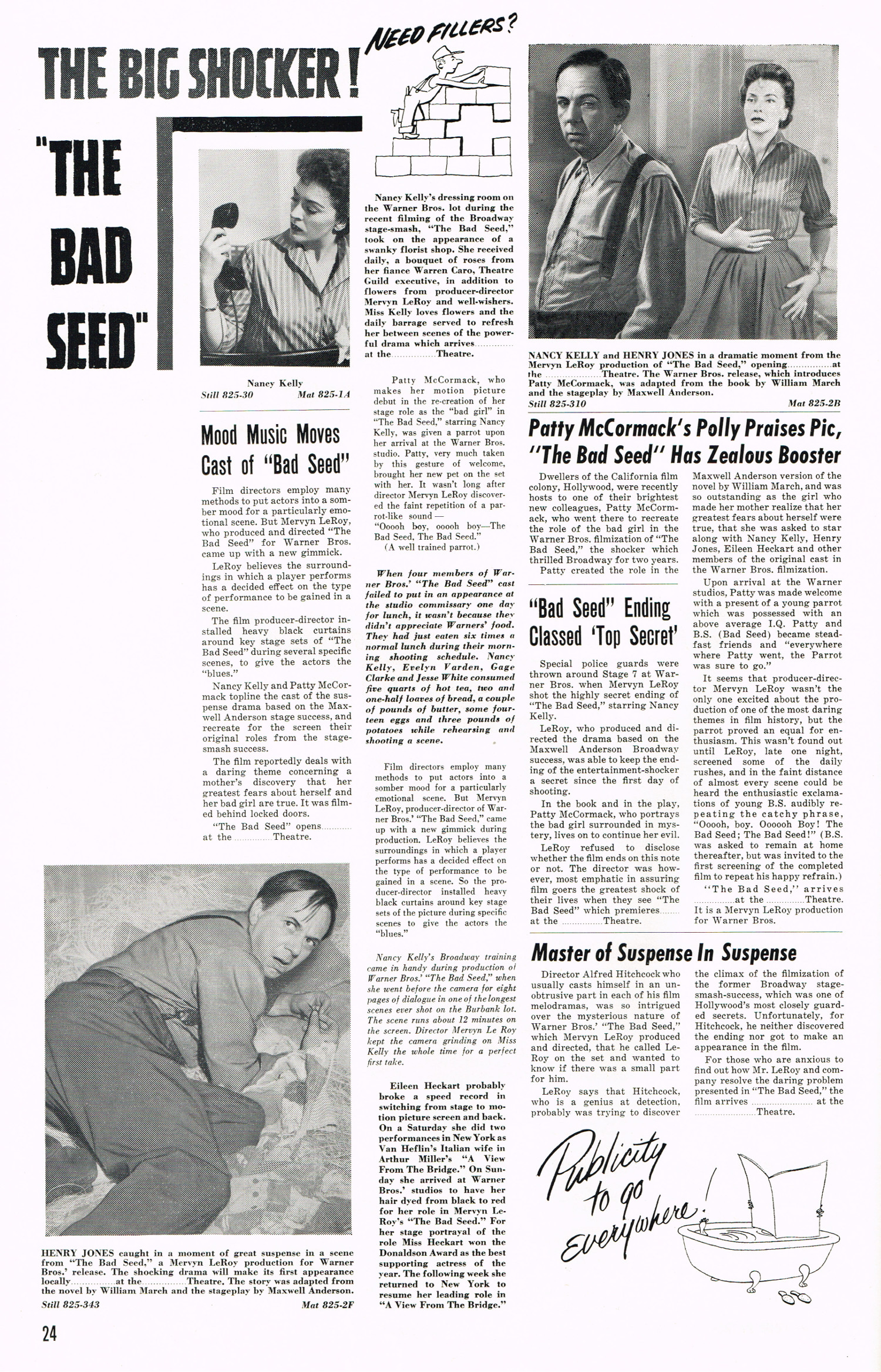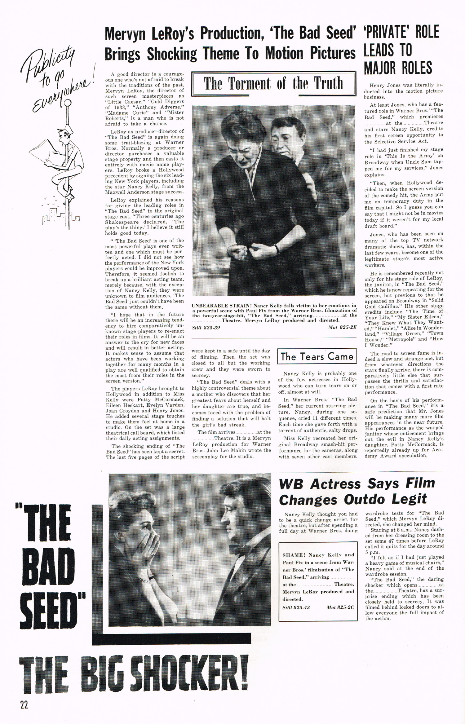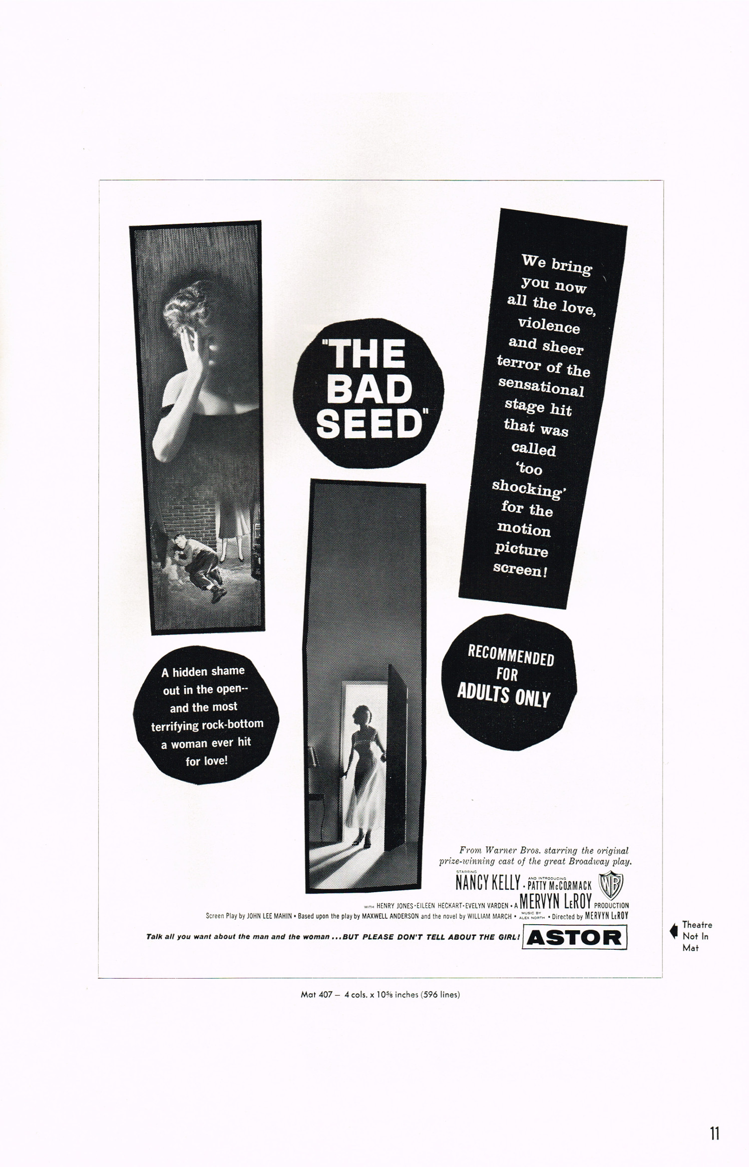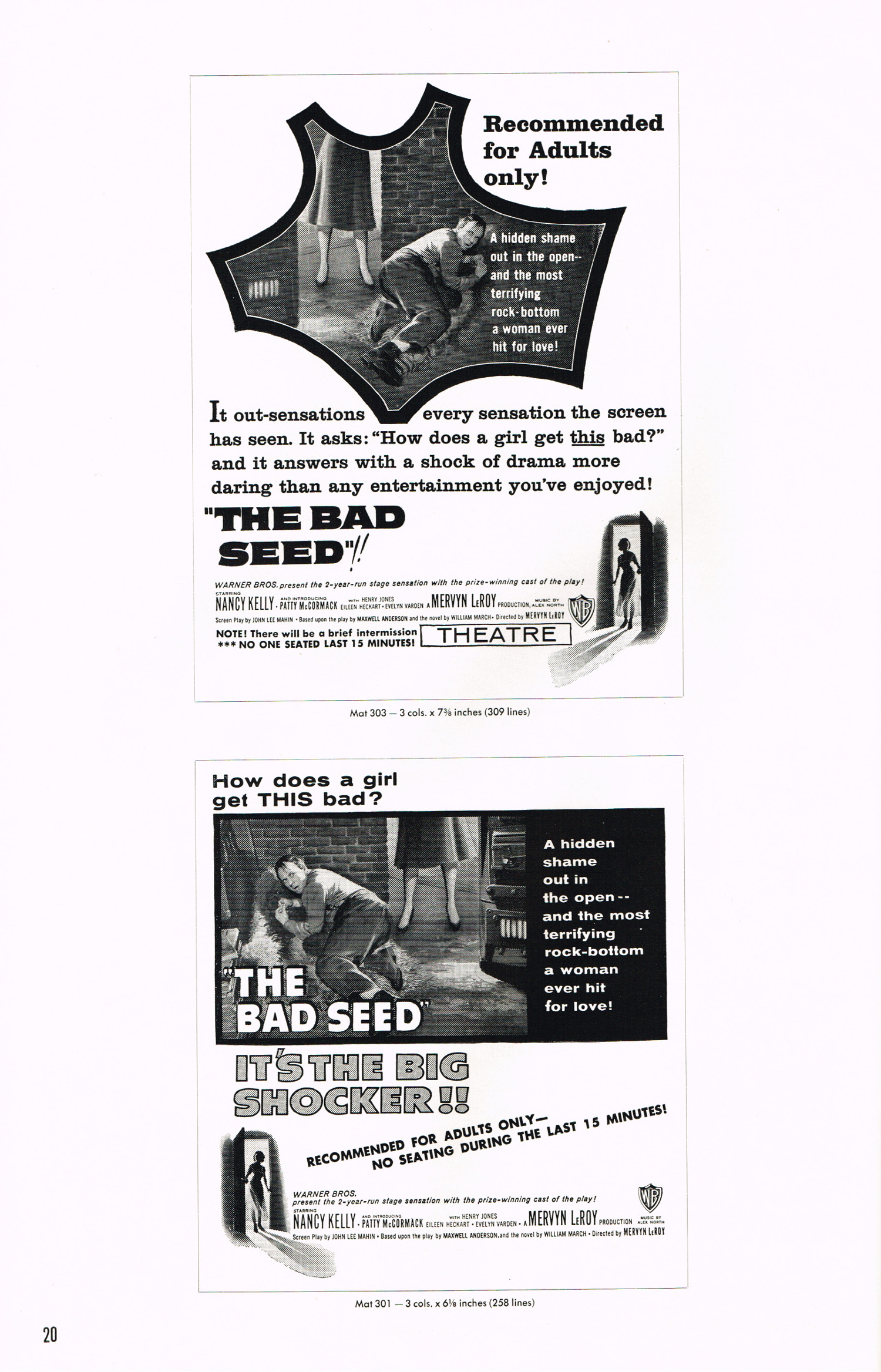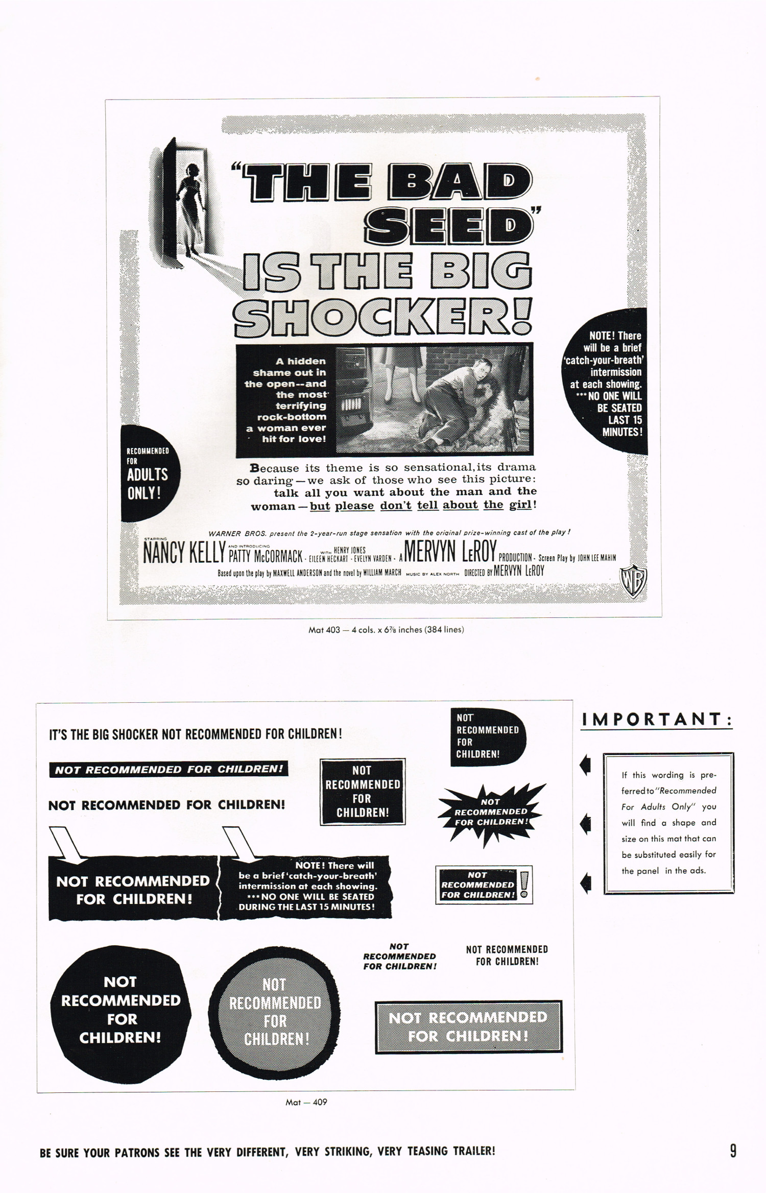A big 28 page pressbook for a little girl. But what a little girl. The Bad Seed seemed pretty daring for the 1950s: making a kid a serial killer (and the daughter of a serial killer to imply a genetic bond). Of course the movie twists around the ending from the novel to appease the Motion Picture Production Code (and also to make it more sellable to the adult theater audience). There's an interesting filler article on page 24 that states Alfred Hitchcock wanted a walk-on part in the movie. Sounds like a smart piece of promotion more than the truth, but check it out.