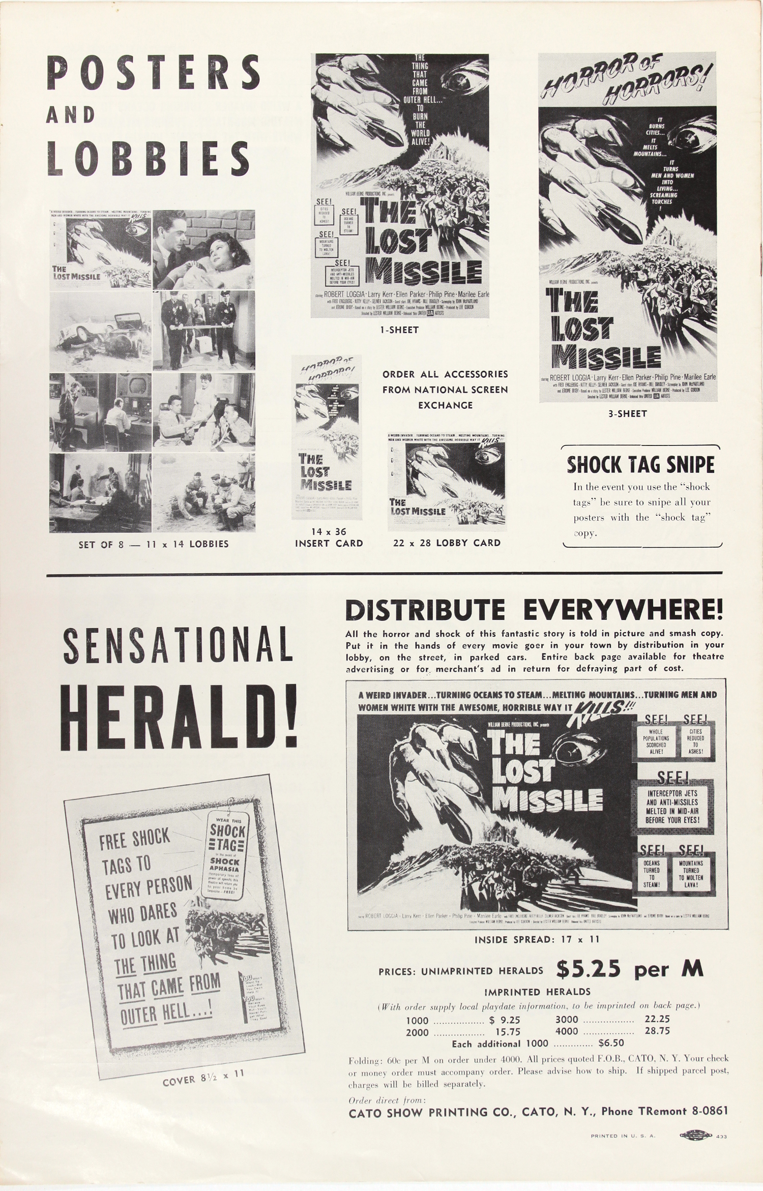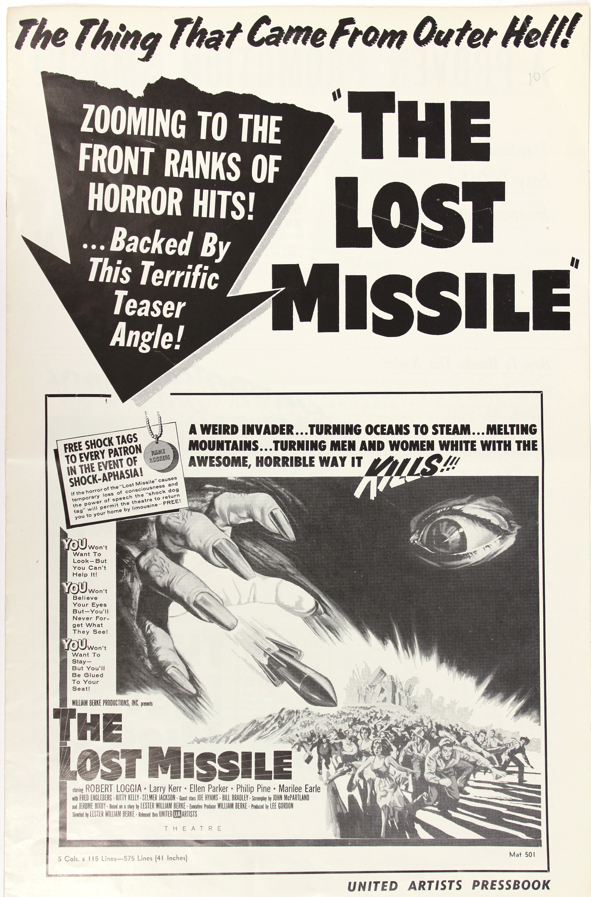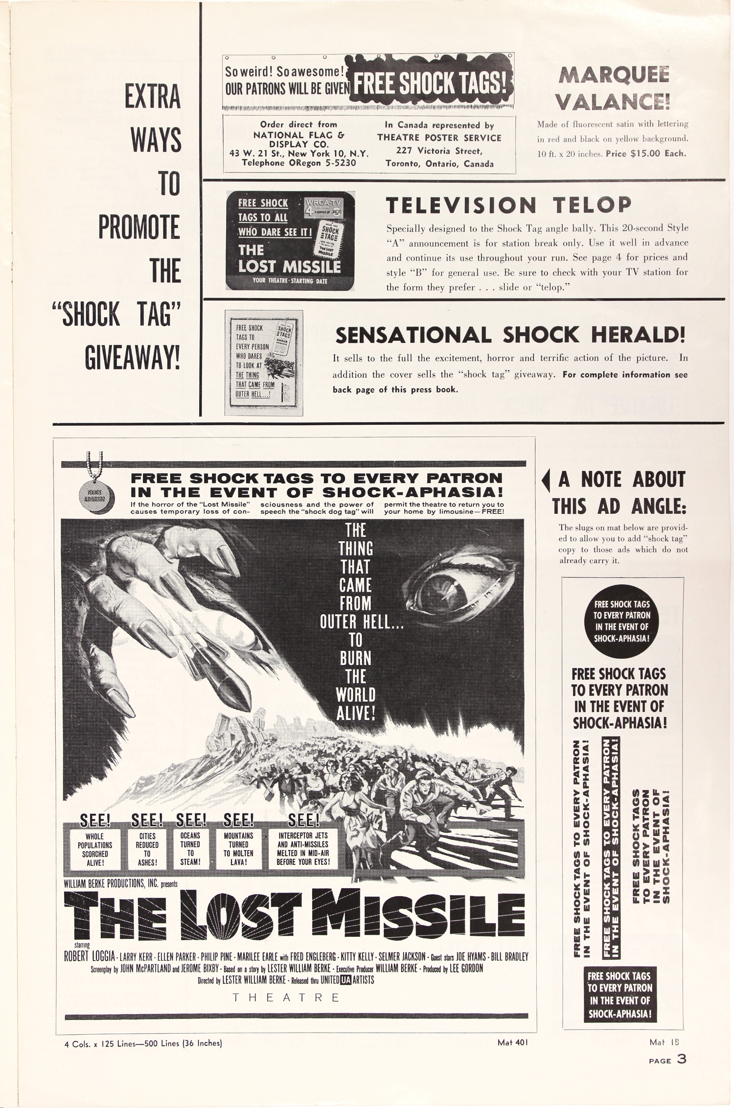 Cold War paranoia, an unstoppable missile blazing a path of destruction and stock footage galore heats up this science fiction quickie to near zero temperature. But this pressbook for The Lost Missile is hot. Intense exploitation poster art and a shock tag theater giveaway (for shock-aphasia!) push the expectations for excitement high even if the movie's payload fizzles.