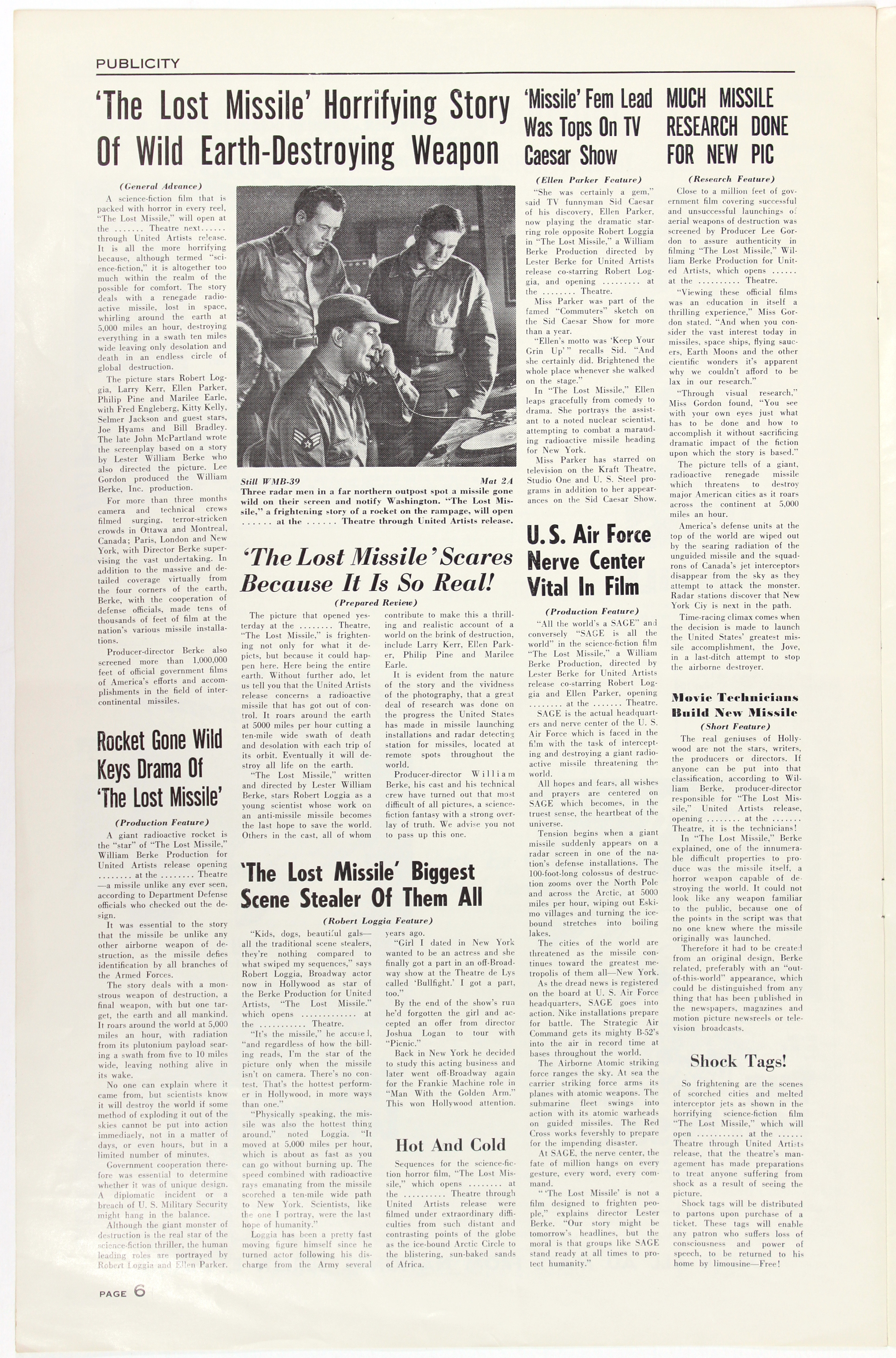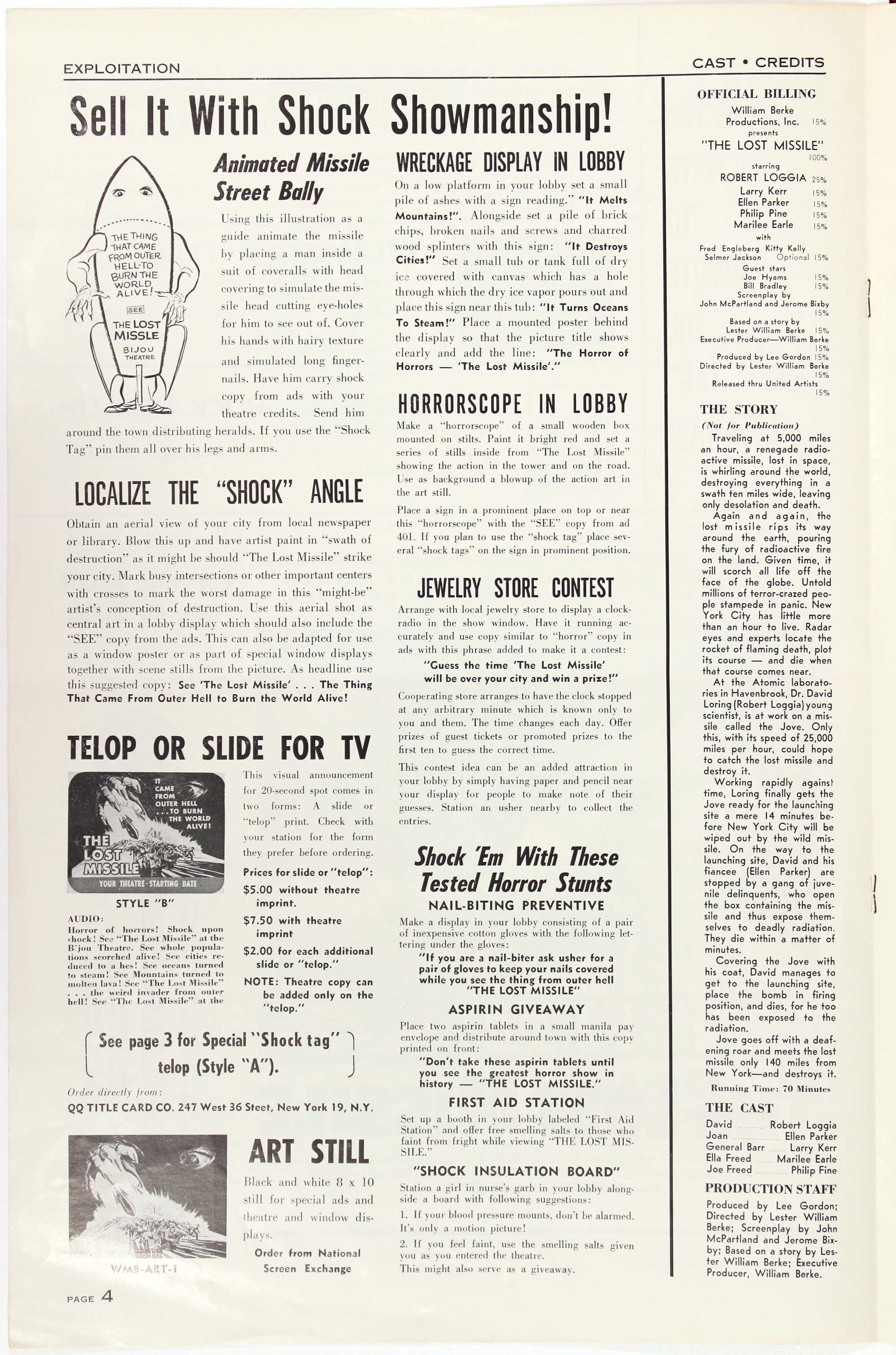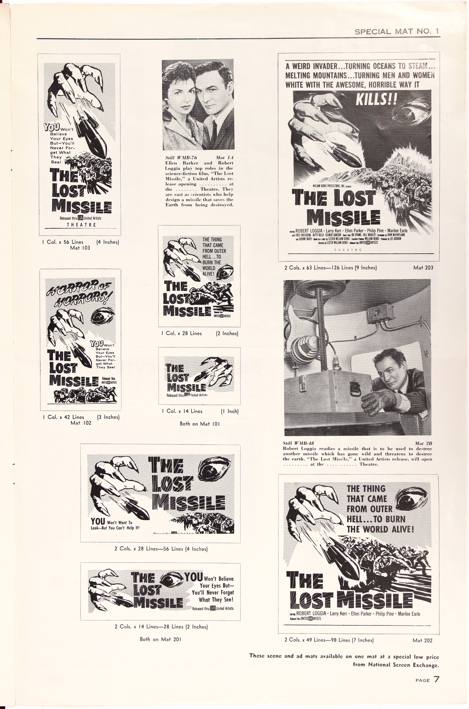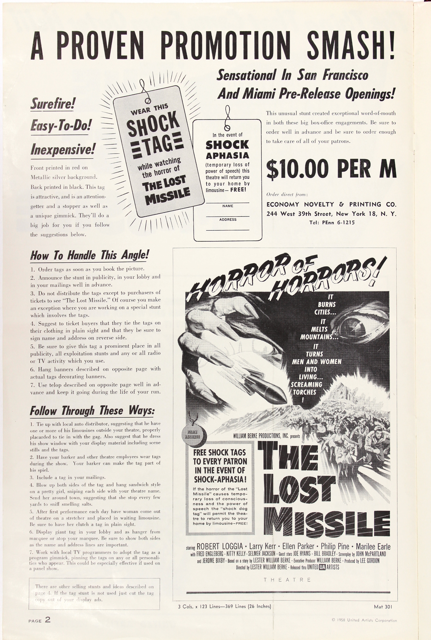 Cold War paranoia, an unstoppable missile blazing a path of destruction and stock footage galore heats up this science fiction quickie to near zero temperature. But this pressbook for The Lost Missile is hot. Intense exploitation poster art and a shock tag theater giveaway (for shock-aphasia!) push the expectations for excitement high even if the movie's payload fizzles.