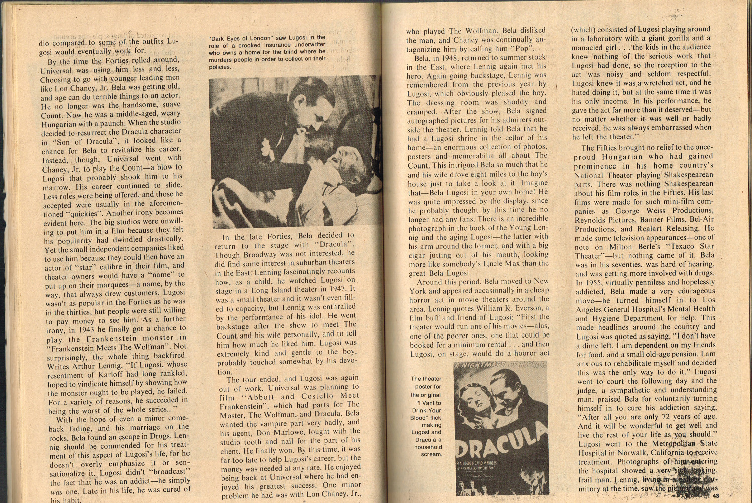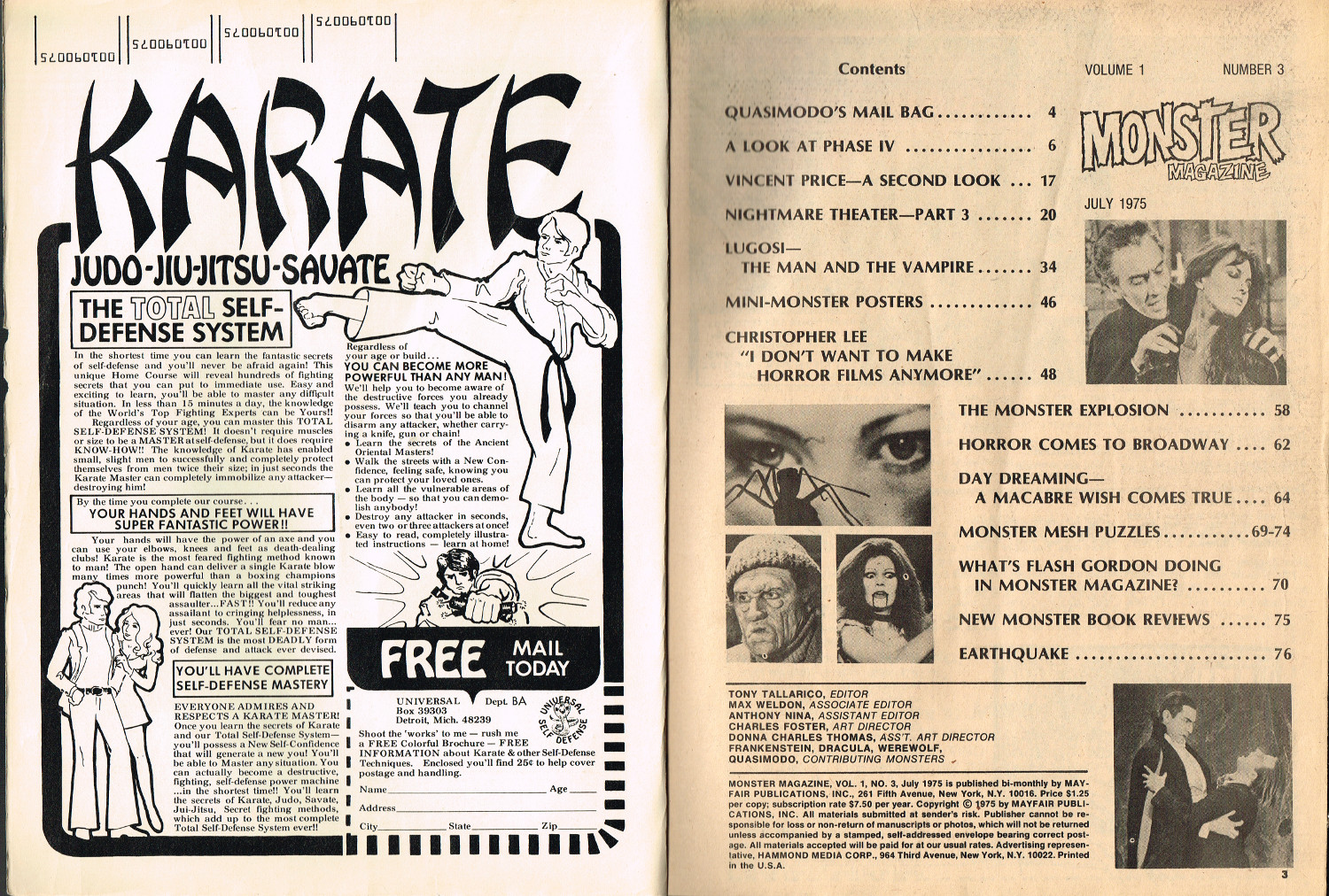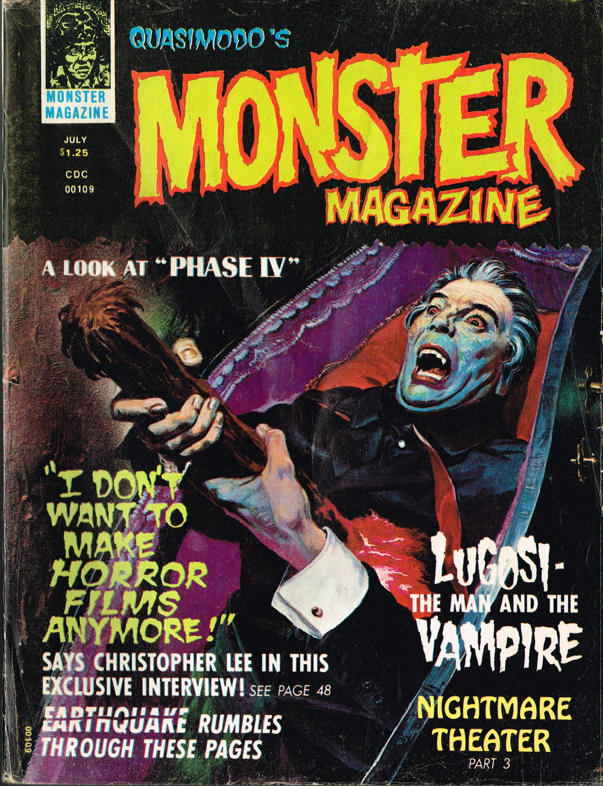Issue 3 of Quasimodo's Monster Magazine was cheaply printed, with a poor layout to boot, but filled with articles on new and old horrors. Notable here is Lugosi, The Man and the Vampyre by Ron Weiss, which references Arthur Lennig's The Count: The Life and Films of Bela (Dracula) Lugosi. The sci-fi horror Phase IV is also reviewed.